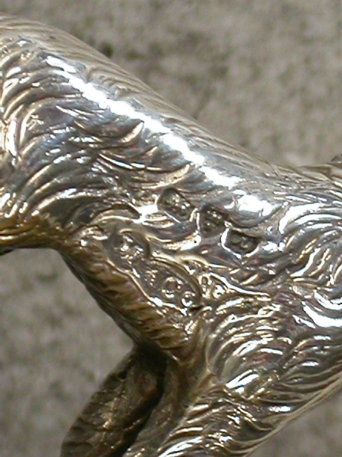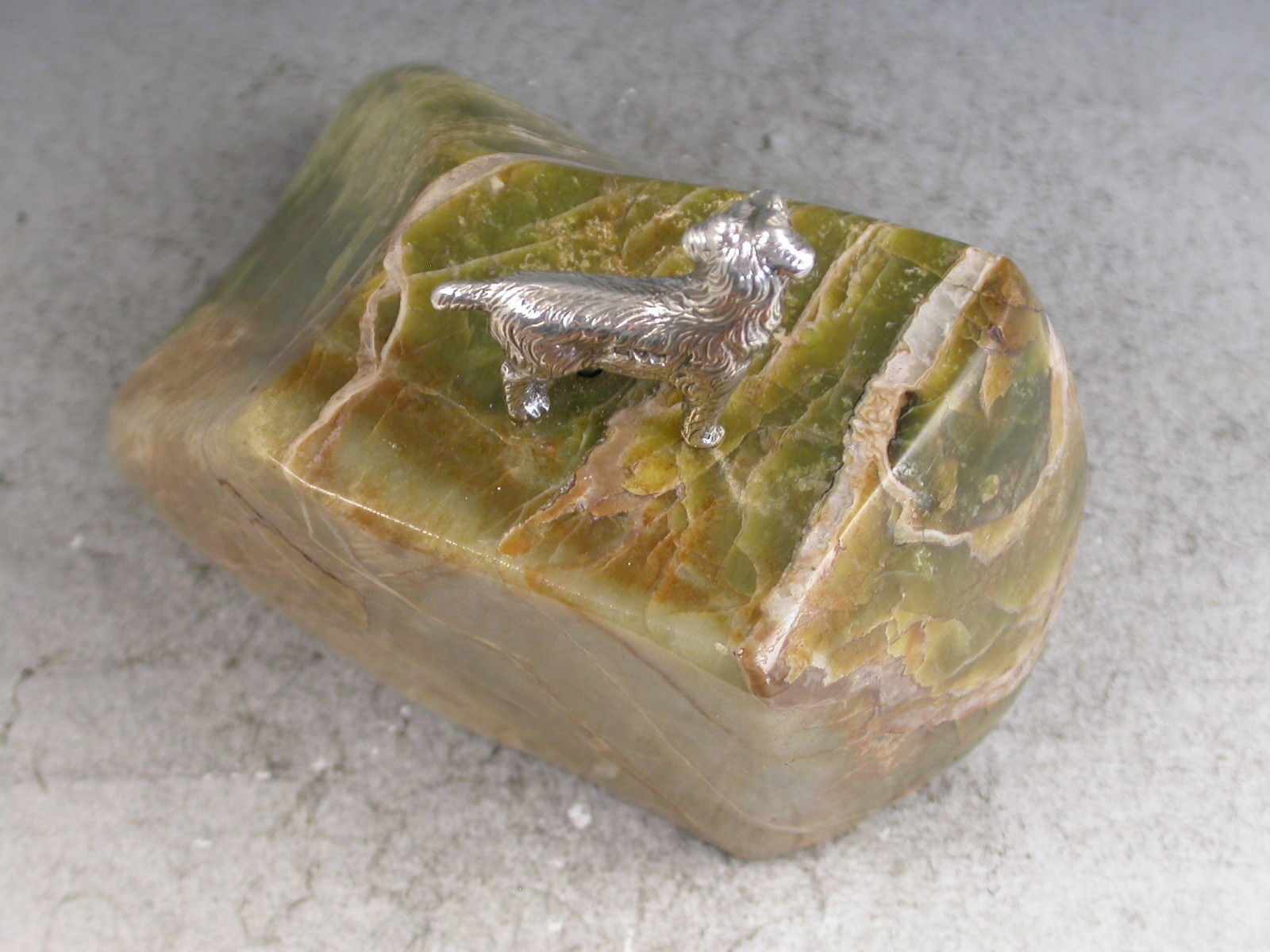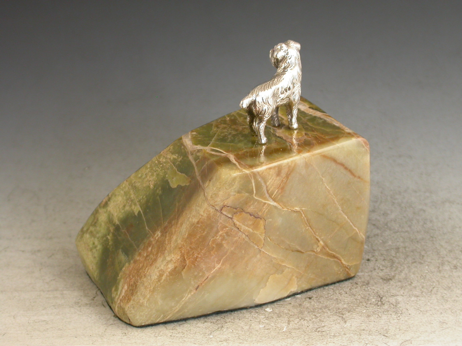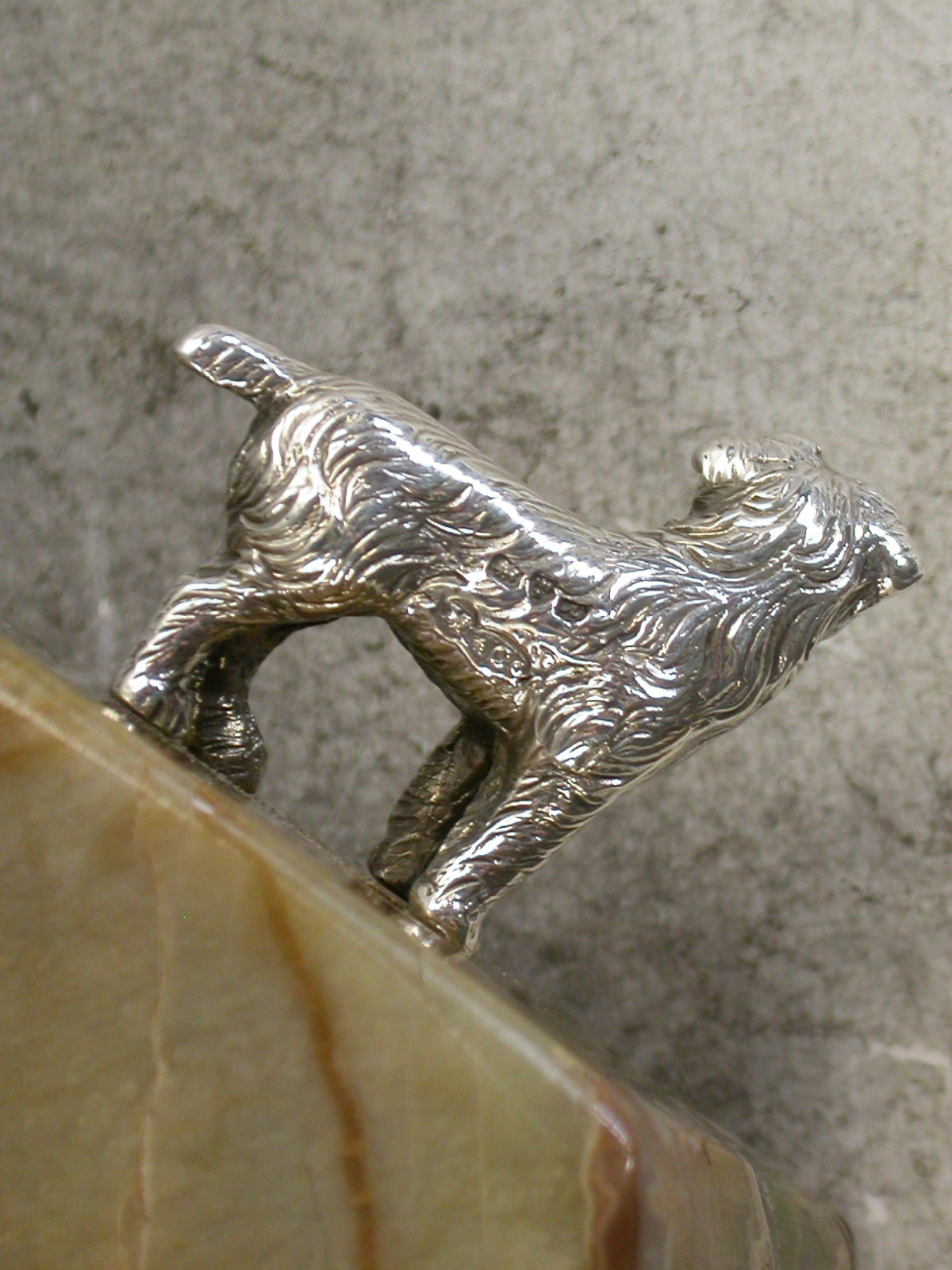 A fine quality Edwardian silver model of a Terrier standing on a shaped green Connemara marble base with ruby glass eyes. Realistically modelled and very well defined.