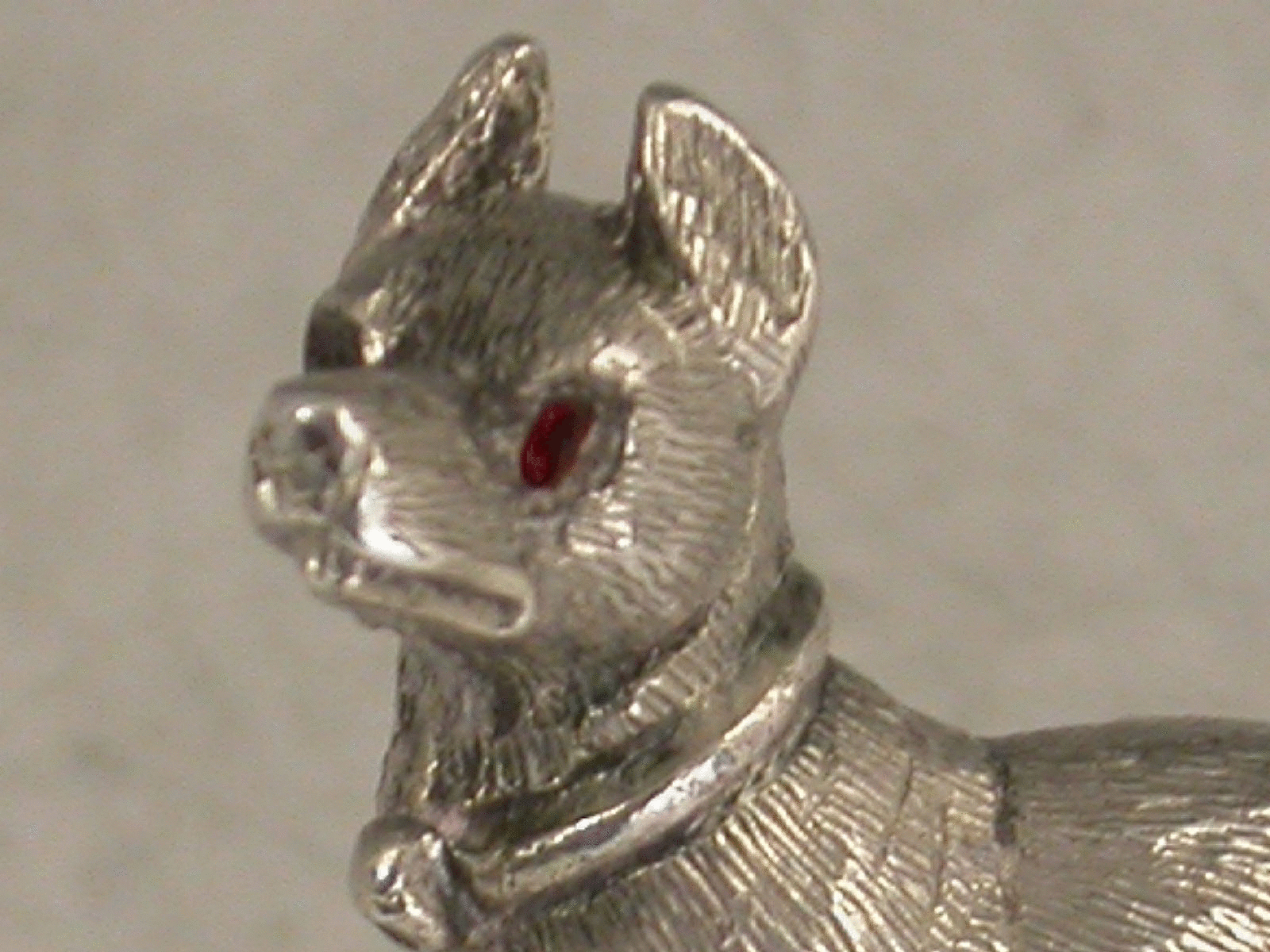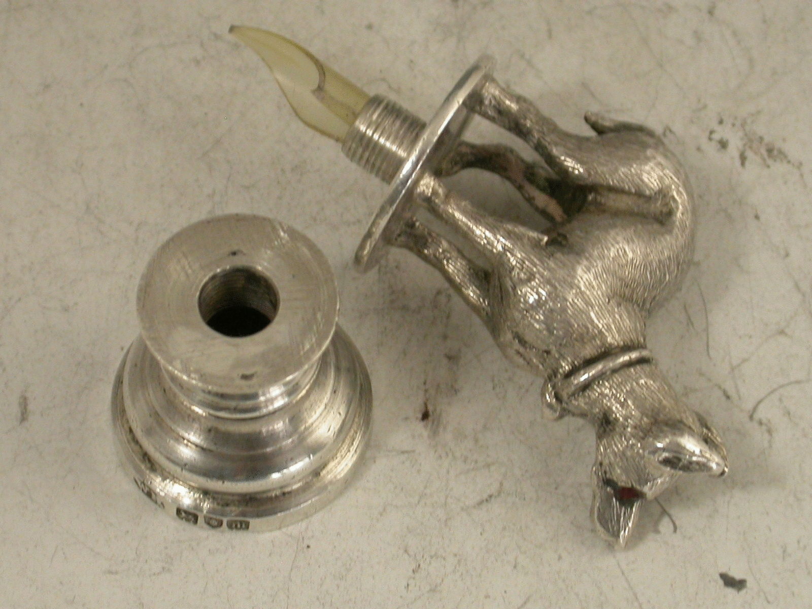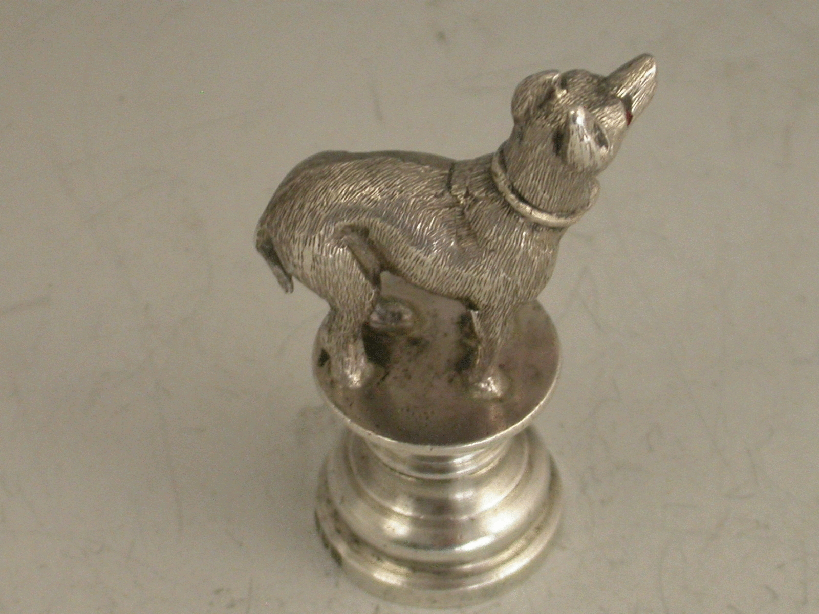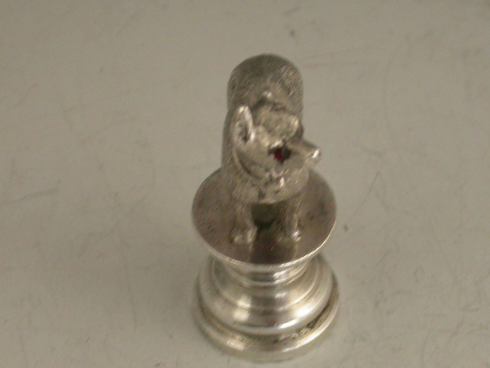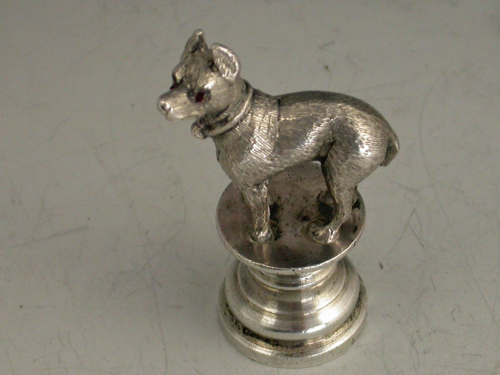 A fine quality Edwardian cast silver Seal depicting a small dog, probably a Terrier, with red ruby eyes, standing on top of a stepped circular pedestal base which unscrews to reveal a small quill nib.