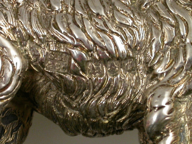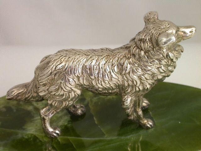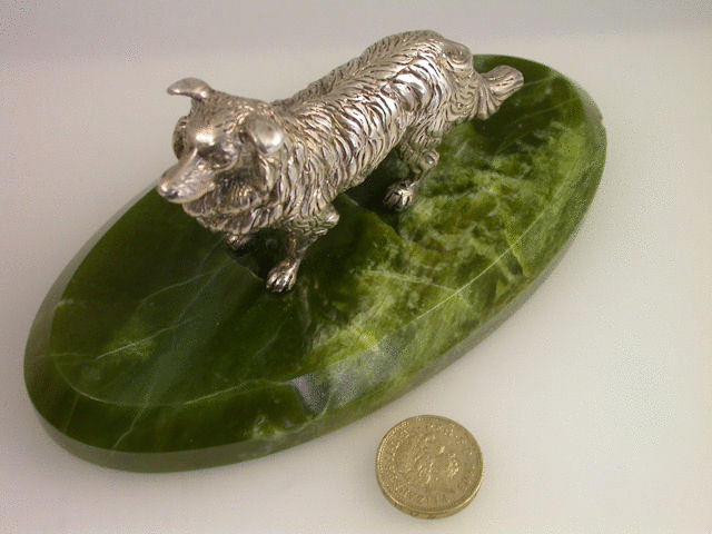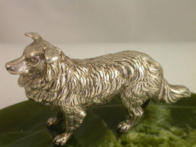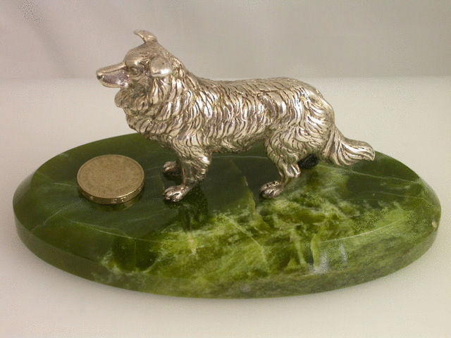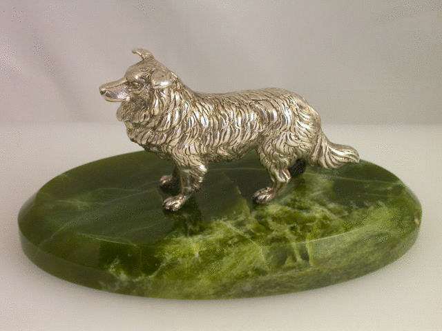 A very fine quality and large Victorian cast silver model of an English Collie Dog standing on an oval green Connemara marble base with bevelled edge. Well modelled and larger than average size.