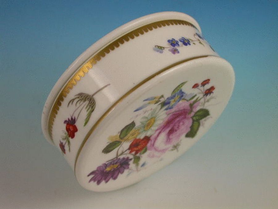 An extremely rare early 19th century English porcelain circular Box with screw off cover, decorated with the Arms of Barrett Lennard, Earls of Sussex and named on the interior lid - Lady Barrett Lennard. The base and sides finely painted with bouquets of English flowers within gilt dentil borders.
