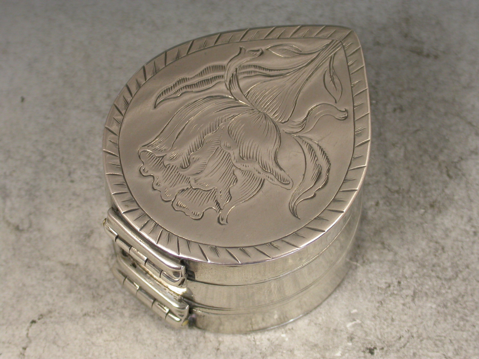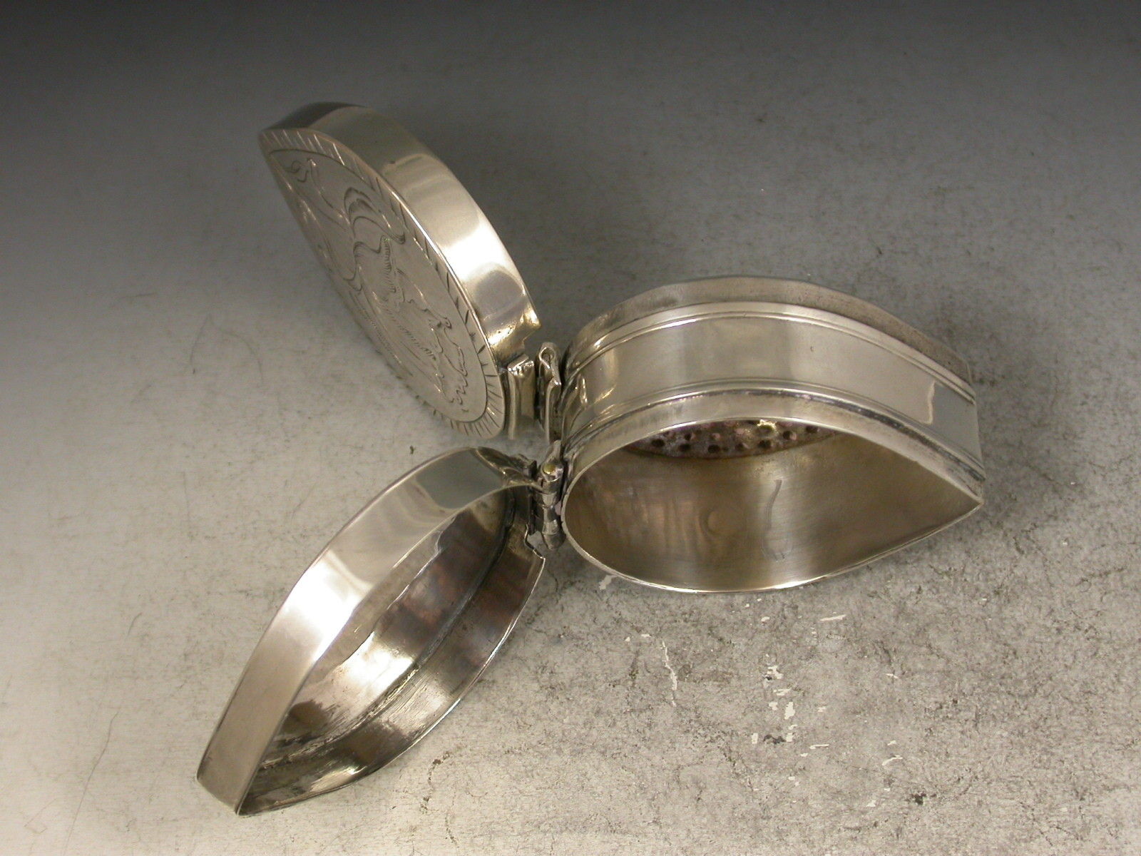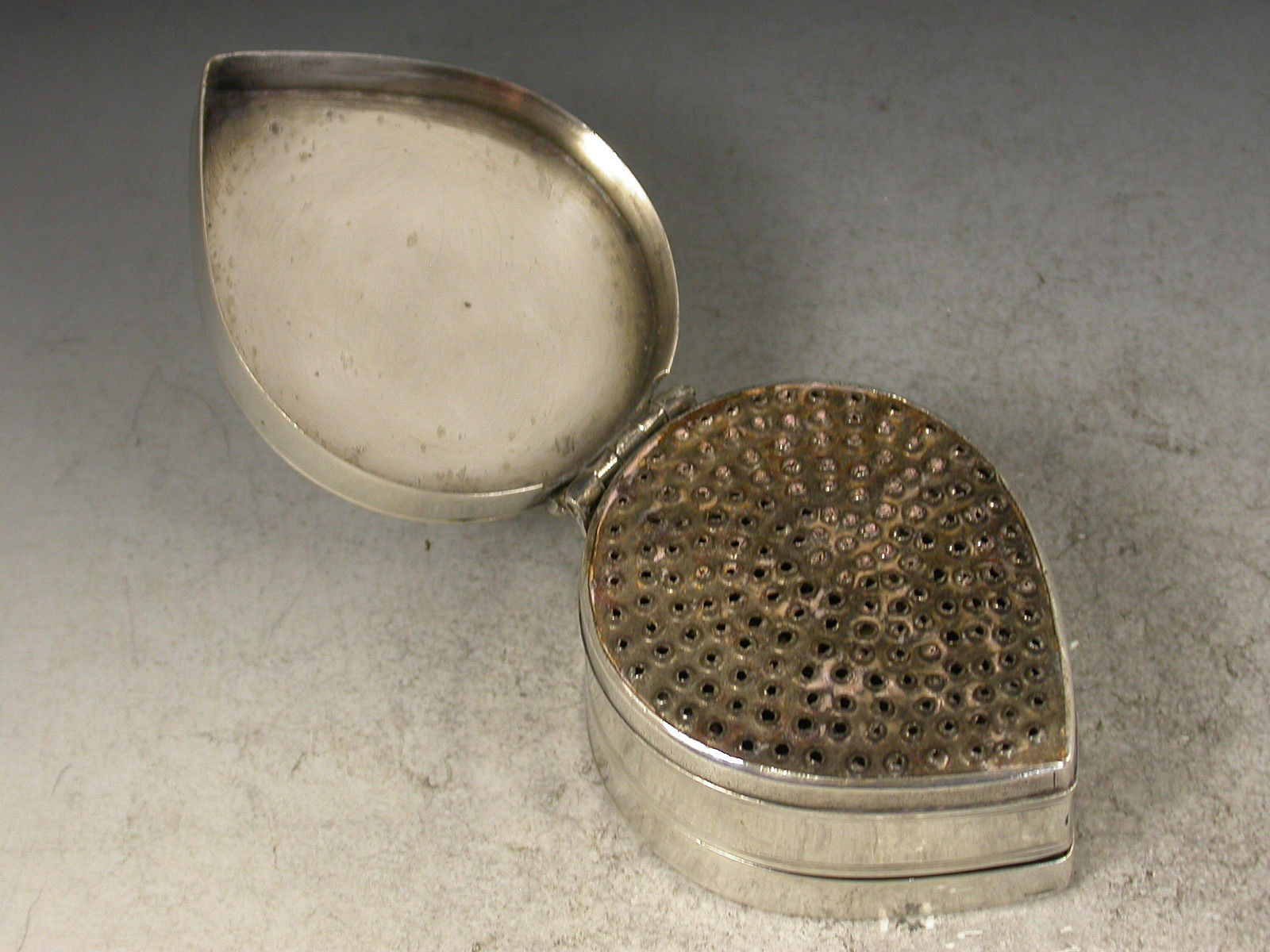A fine and rare 17th century English silver Nutmeg Grater of teadrop shape and of exceptionally large proportions. Five lugged stand-off hinges to both cover and base. Large scratch engraved Tulips to top and bottom with feather edge borders.