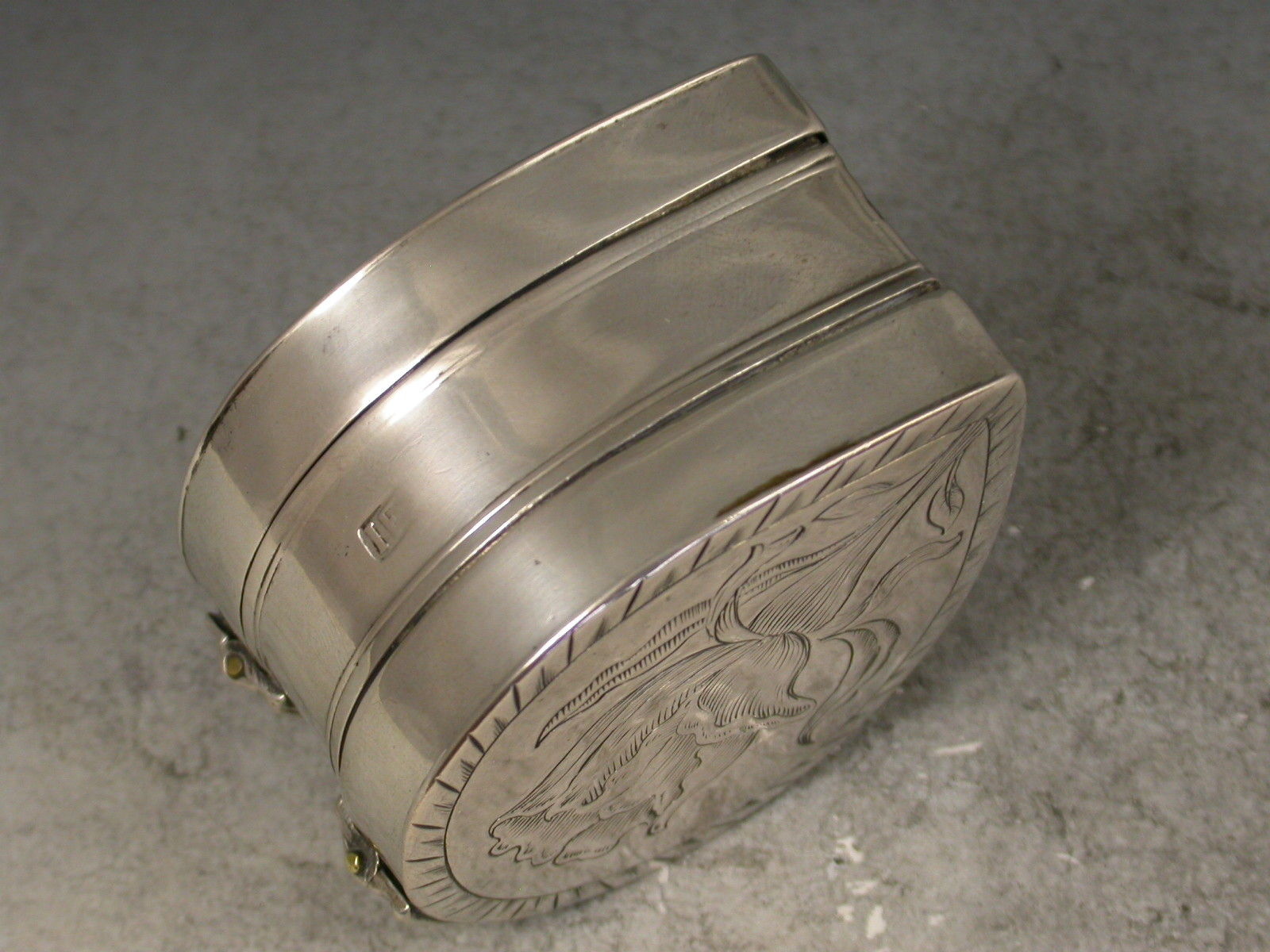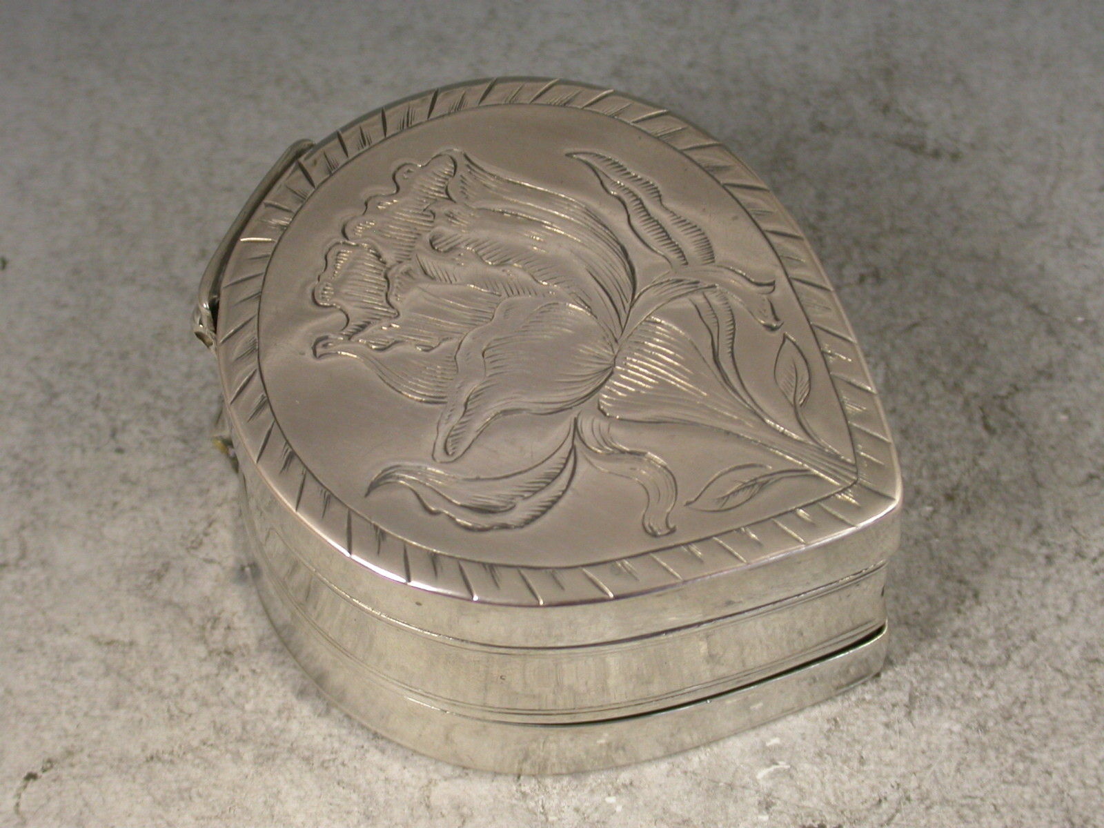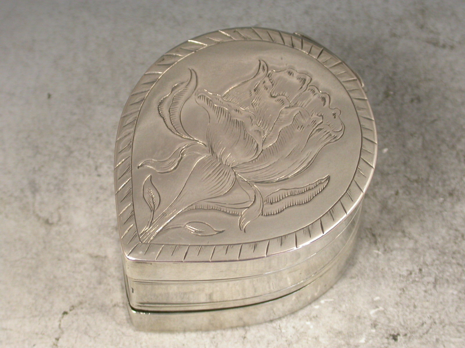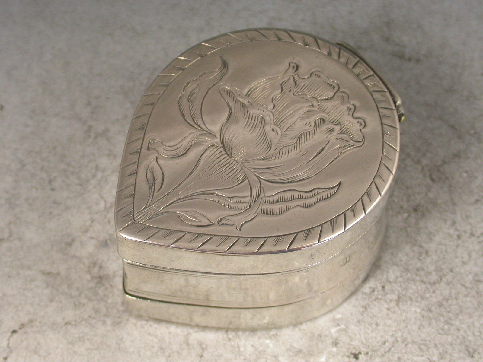 A fine and rare 17th century English silver Nutmeg Grater of teadrop shape and of exceptionally large proportions. Five lugged stand-off hinges to both cover and base. Large scratch engraved Tulips to top and bottom with feather edge borders.