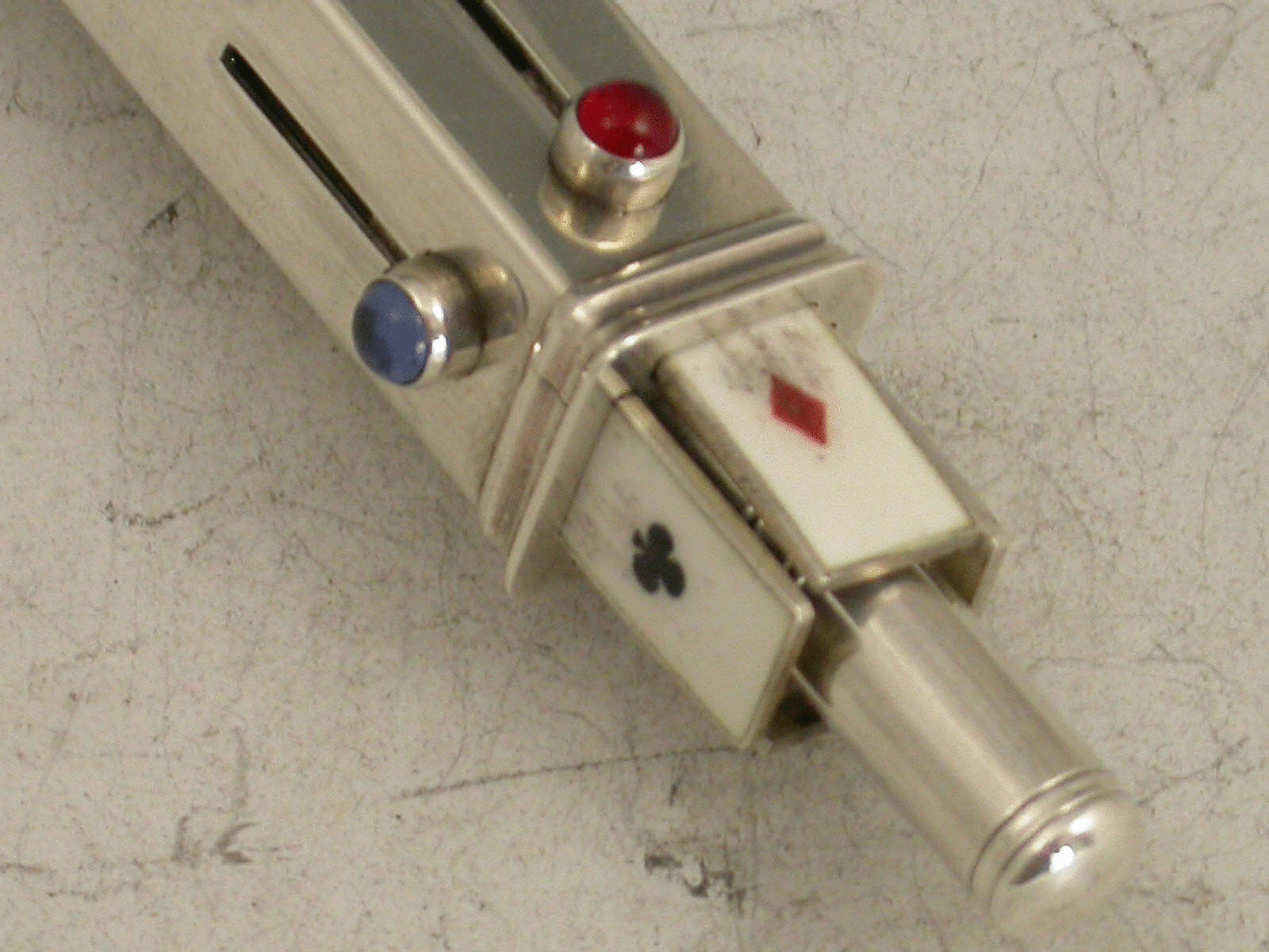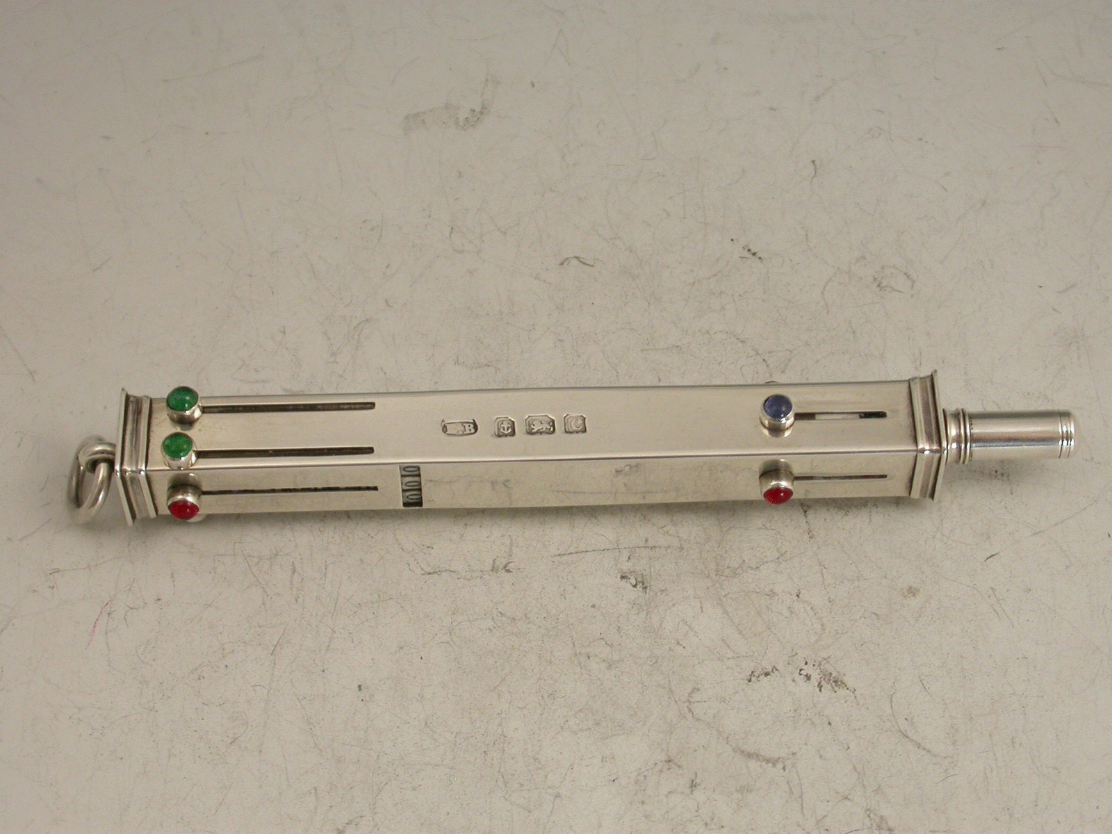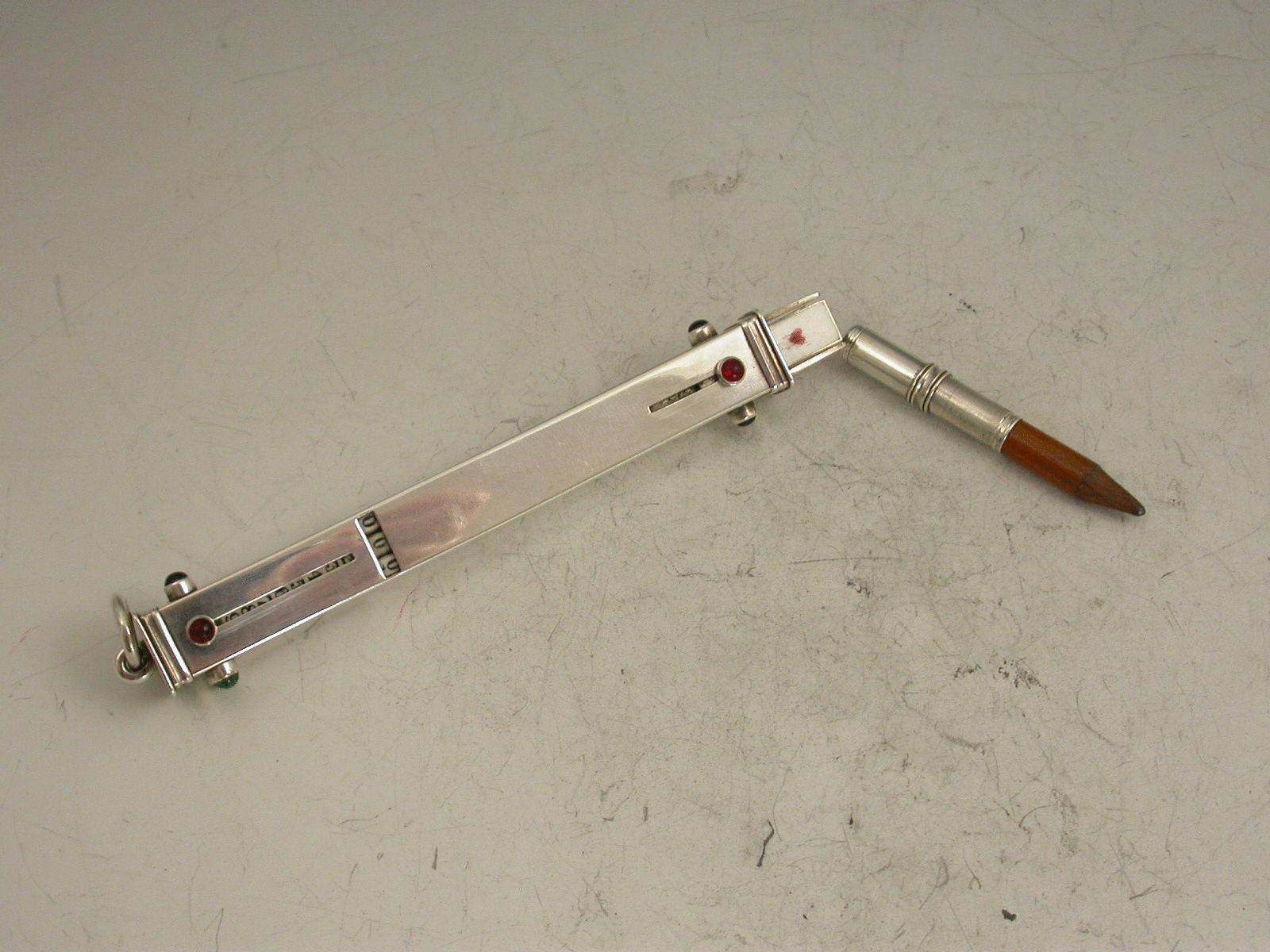 A very unusual Edwardian silver Gaming Scorer / Trump Indicator / Pencil, of square column form with a pull out pencil to one end and suspensory ring to the other, set with ten different coloured gem sliders, four to display trumps and six to alter the numbered scales from 1 - 999.
