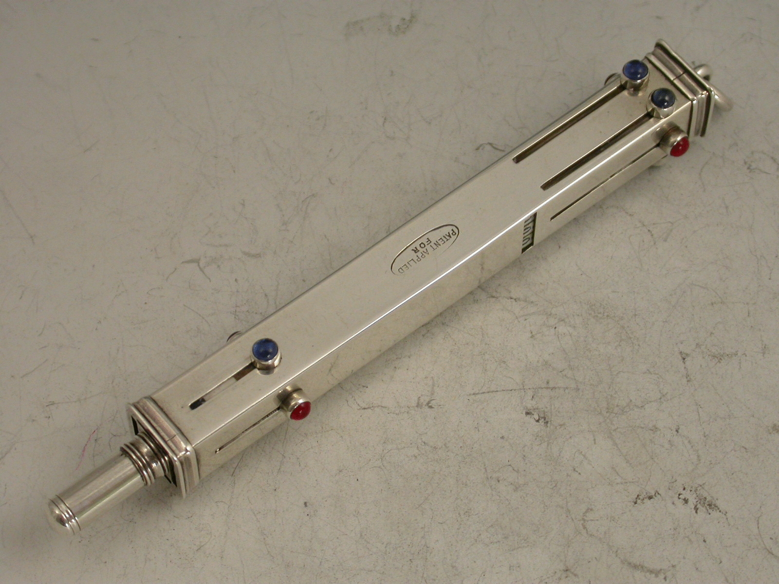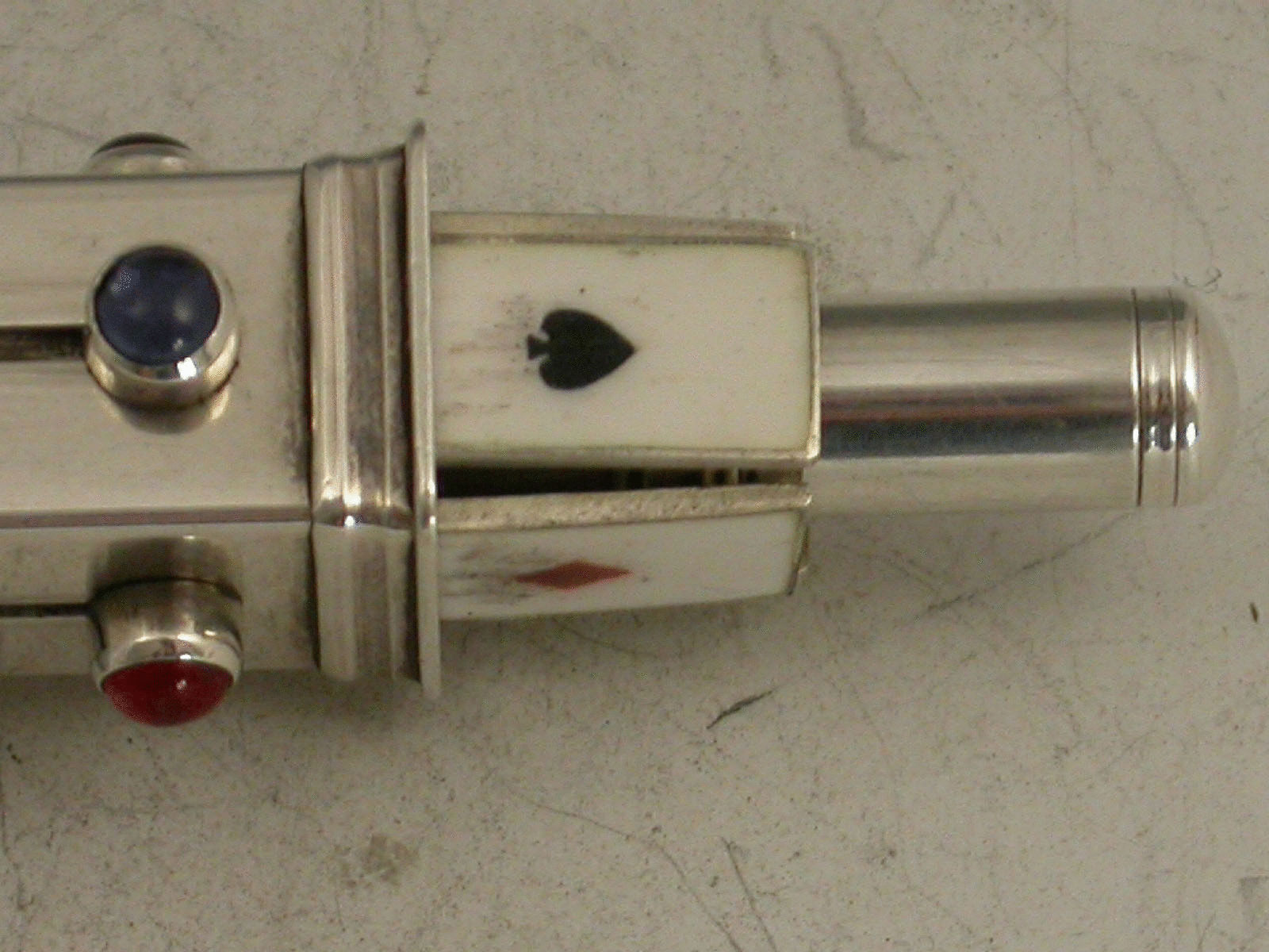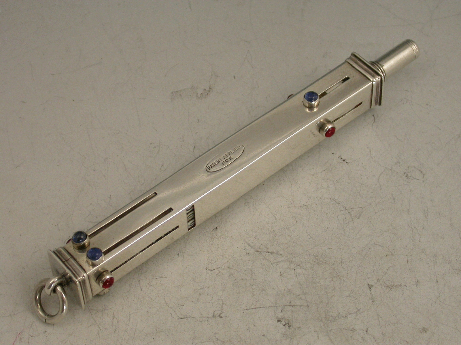 A very unusual Edwardian silver Gaming Scorer / Trump Indicator / Pencil, of square column form with a pull out pencil to one end and suspensory ring to the other, set with ten different coloured gem sliders, four to display trumps and six to alter the numbered scales from 1 - 999.