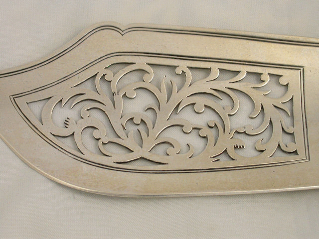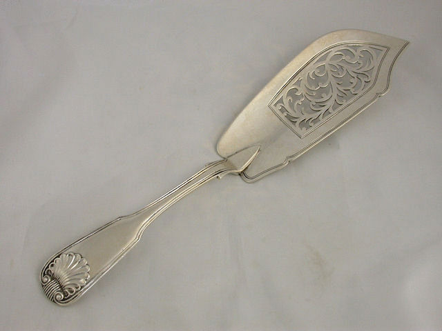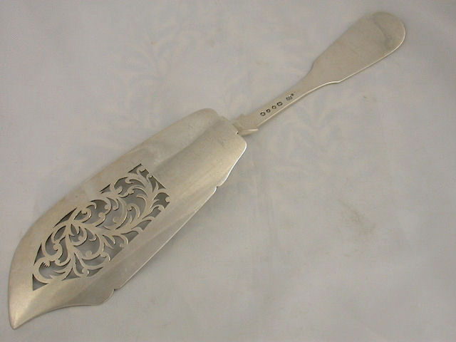 A good quality early Victorian silver Fish Slice of fiddle thread and shell pattern, the curved shaped blade with thread border and pierced scroll work panel, the handle with large fluted scallop shell.