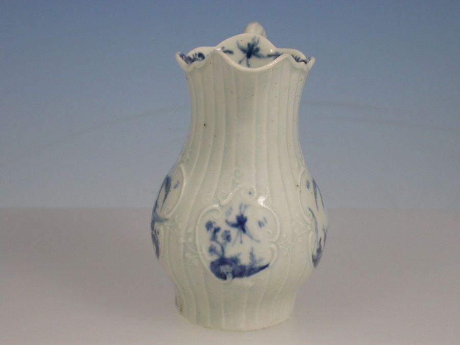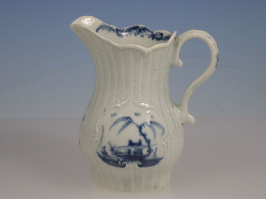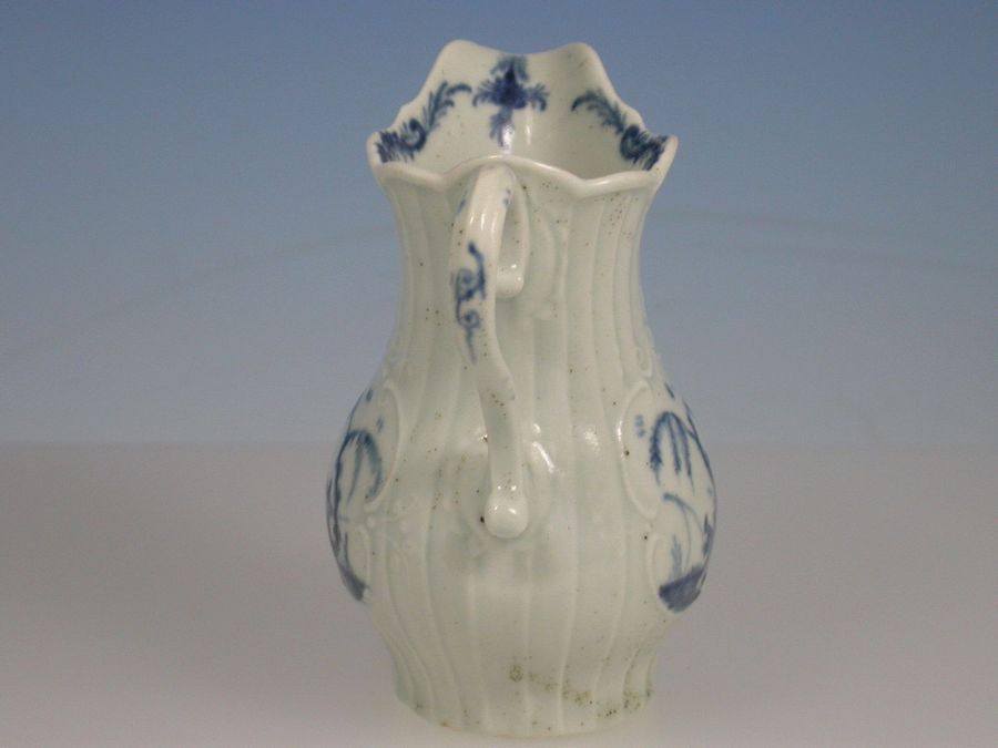 A fine early Worcester spiral moulded Cream jug with solid loop handle, painted in under-glaze blue with the fisherman and willow pavilion pattern (IB21) in the mirror shaped reserves, the inner rim with trailing foliate garlands and insects.