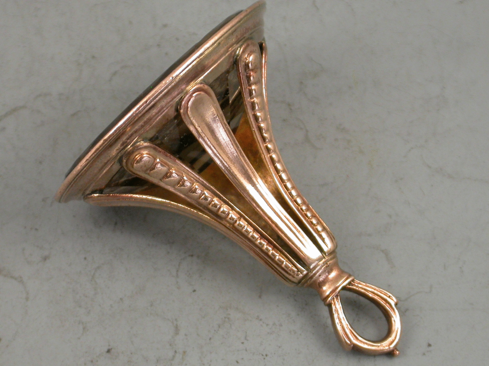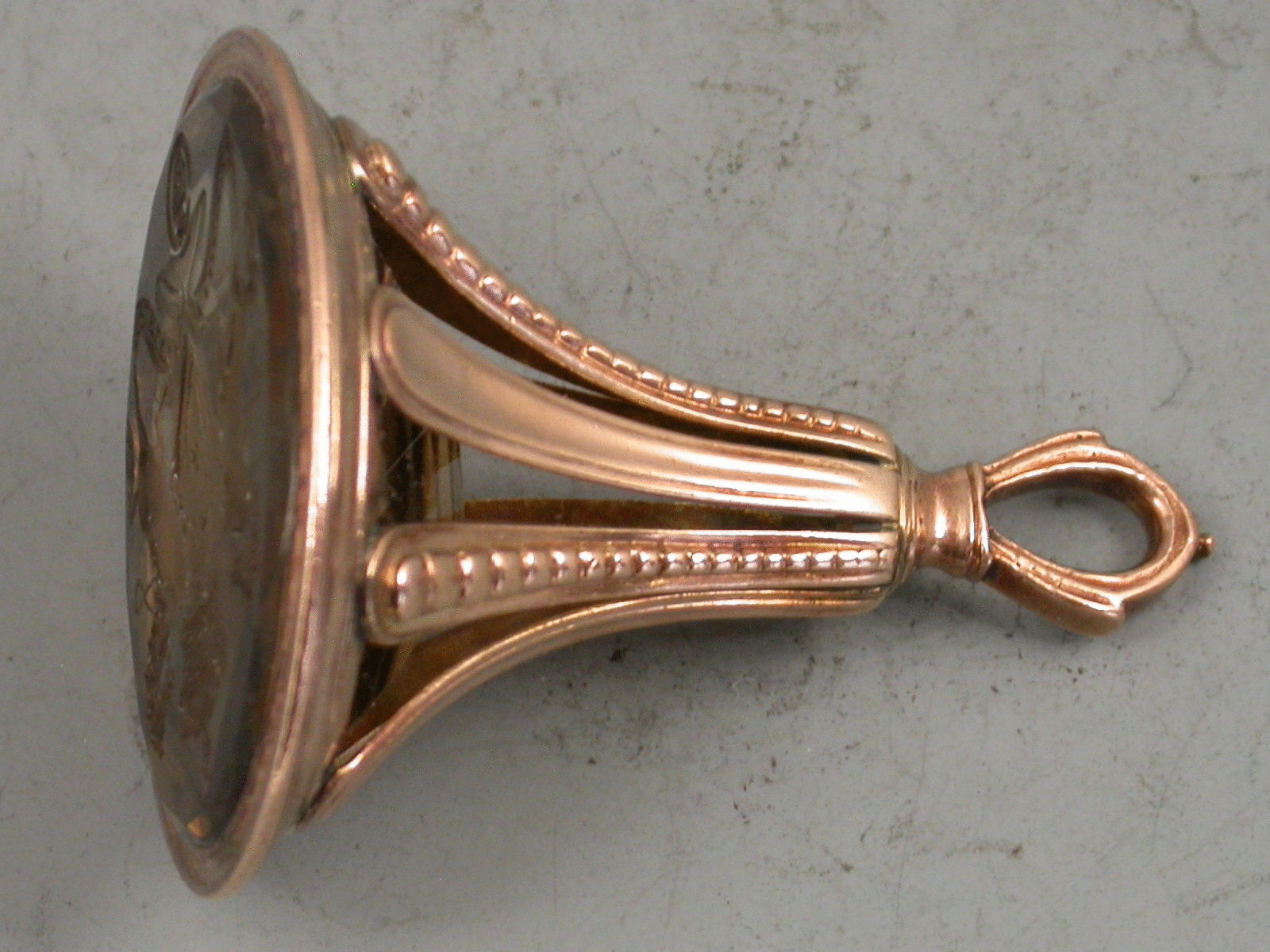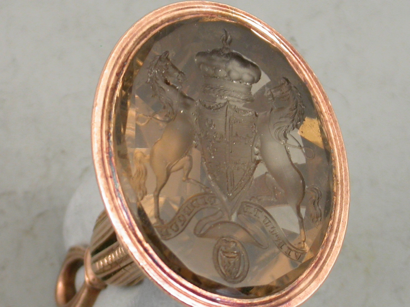 A fine quality large George III gold Seal in the Adam style, of pierced bell shape with beaded and fluted supports, set with a large oval smokey quartz stone, the matrix engraved with the Coat of Arms of a Baron.