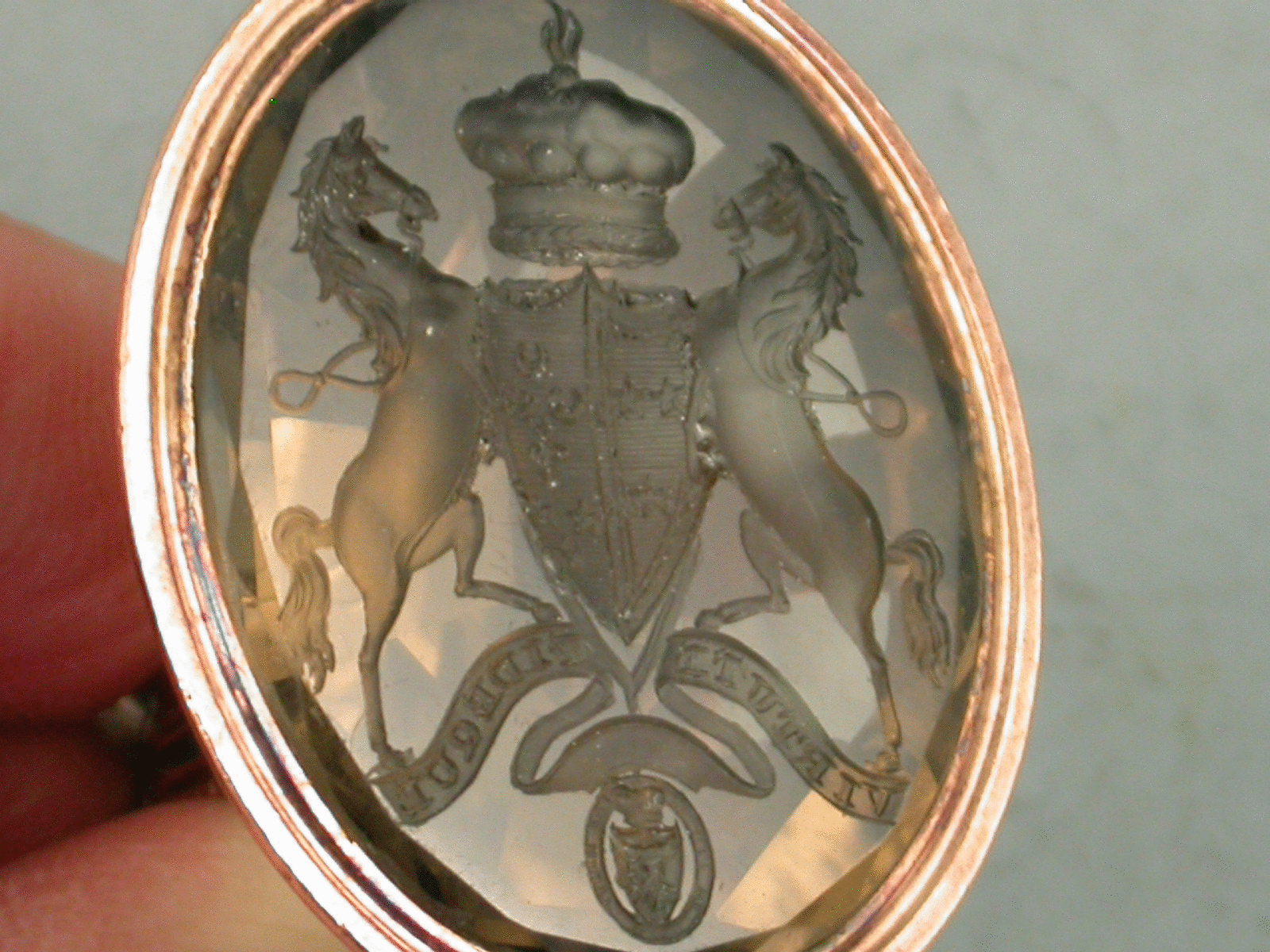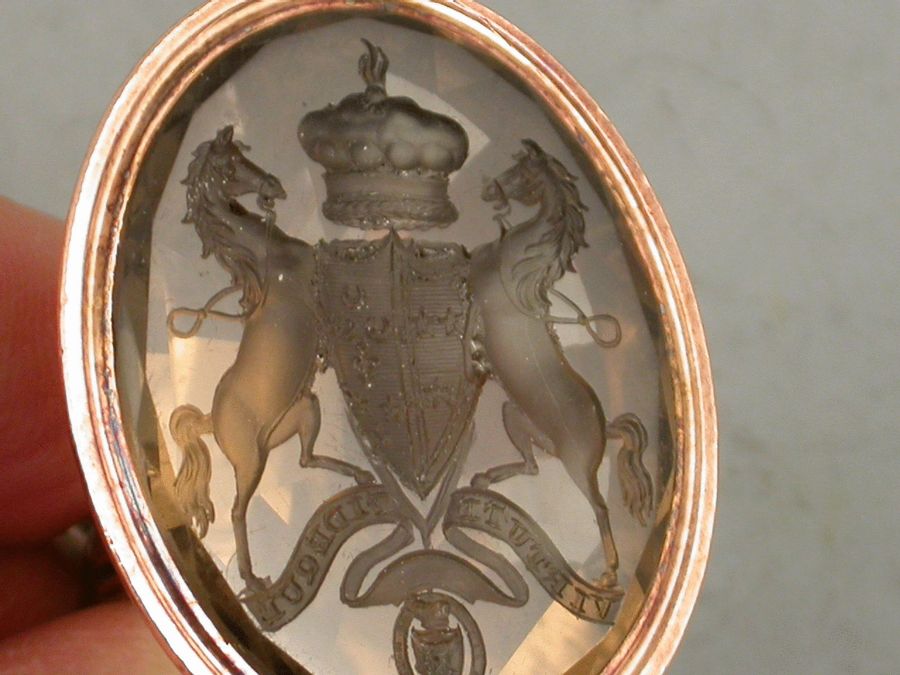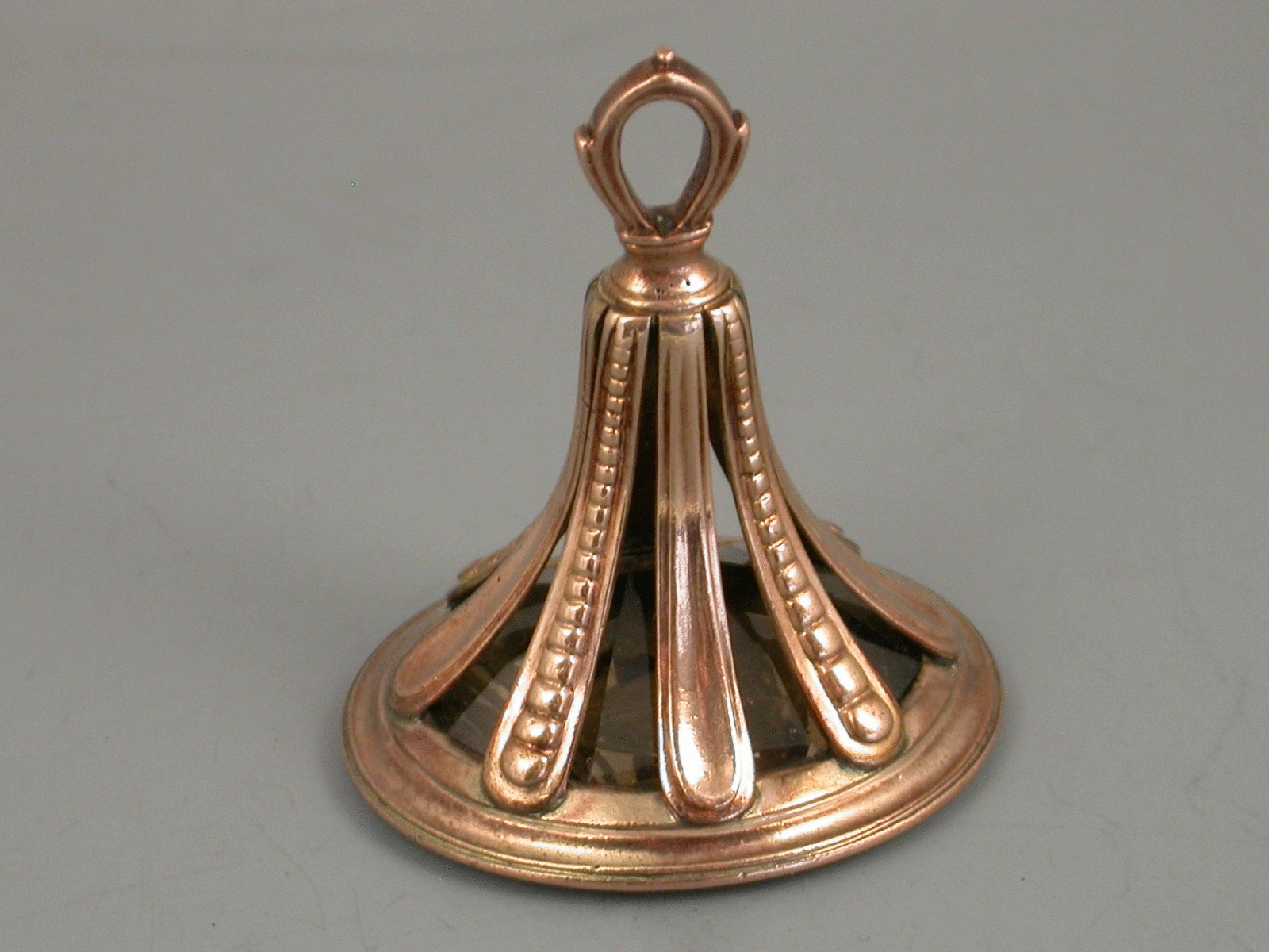 A fine quality large George III gold Seal in the Adam style, of pierced bell shape with beaded and fluted supports, set with a large oval smokey quartz stone, the matrix engraved with the Coat of Arms of a Baron.