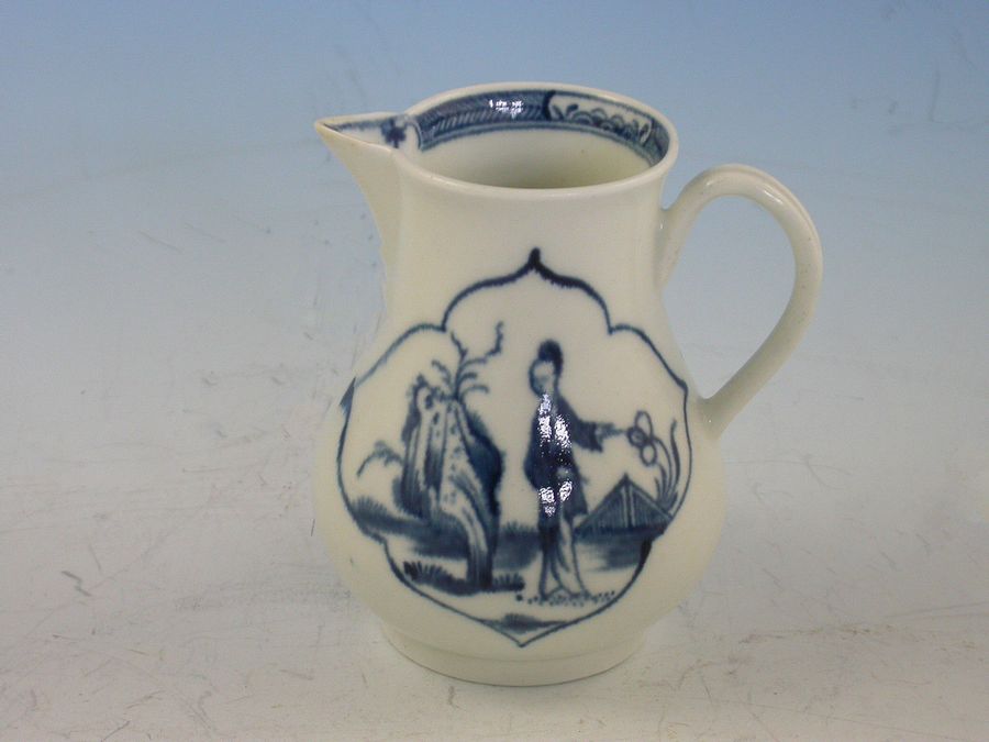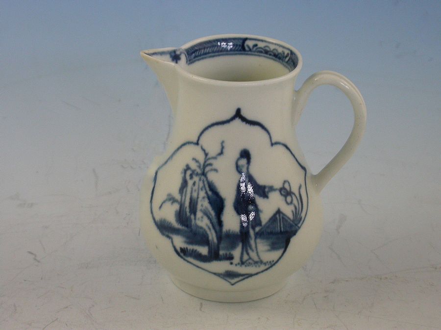 A pear shaped Cream Jug with very slightly upturned sparrow-beak and grooved loop handle. Two quarter-lobed panels contain Chinese garden scenes. In one, a Chinese figure stands by a fence pointing to a flower. To the figures right is painted a tall rock. The second cartouche is painted with a figure seated by perforated rockwork from which grow leafless twigs and a spindly, leafy tree which overhangs the figure. Between two grassy clumps in the distance a ""pipe-cleaner"" tree is painted. Round the inner rim is painted a hatched and floral panel border.