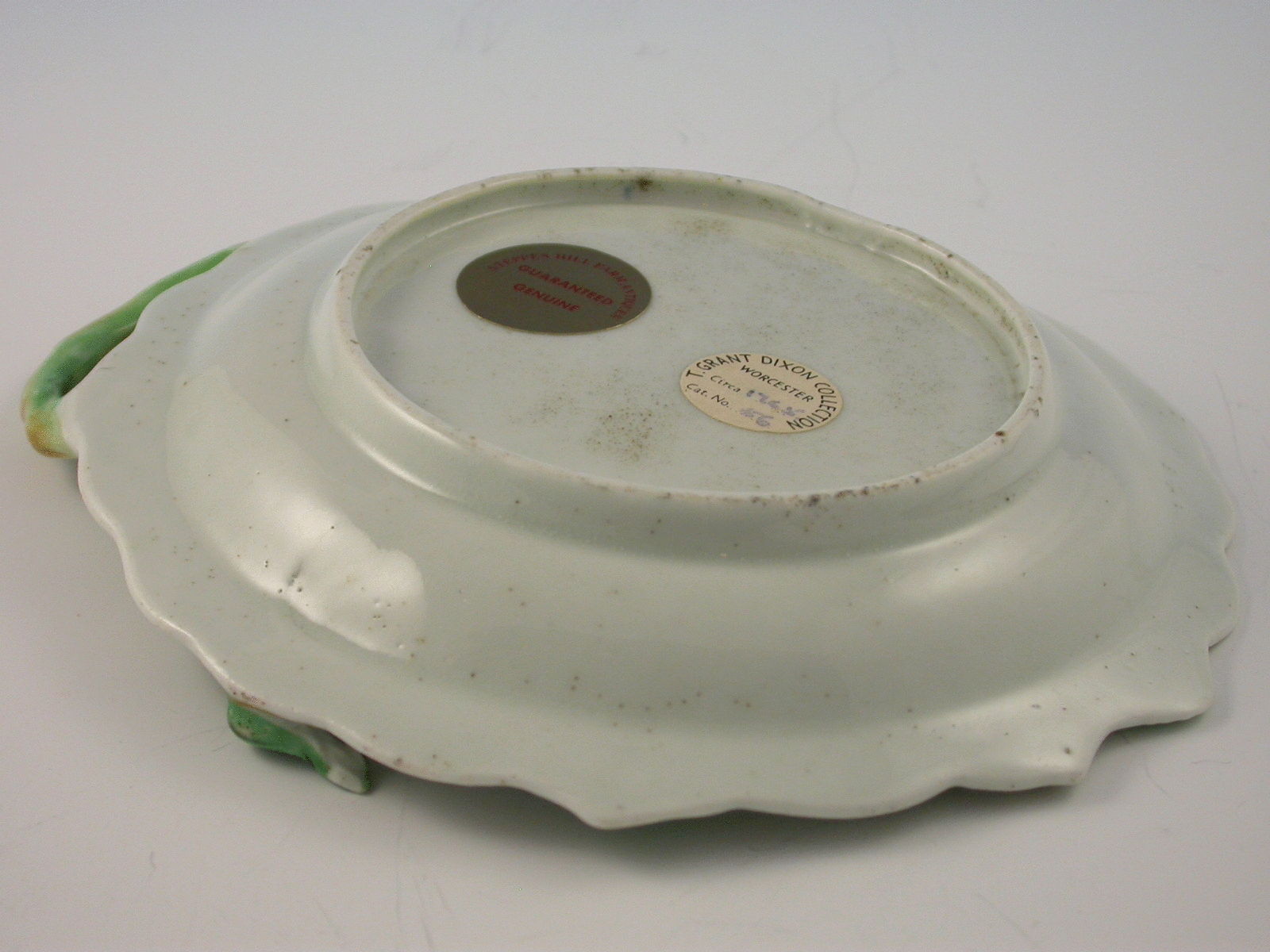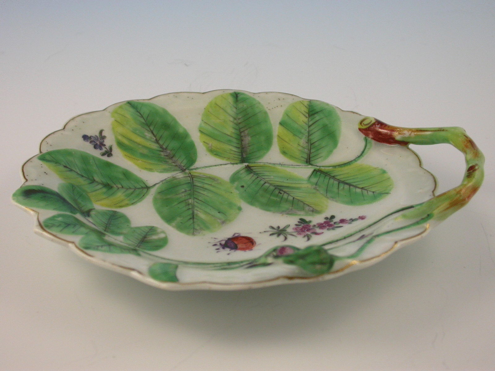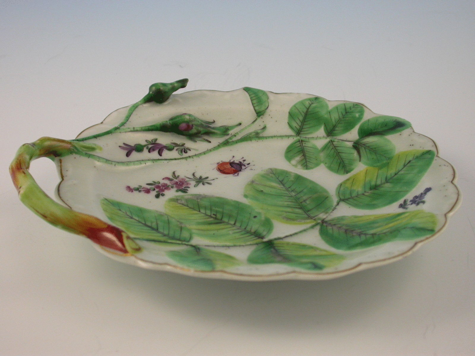 A fine First Period Worcester moulded “Blind Earl” type Sweetmeat Dish with twisted branch handle with rose buds, painted in polychrome enamels with leaf and foliate sprays and a ladybird.