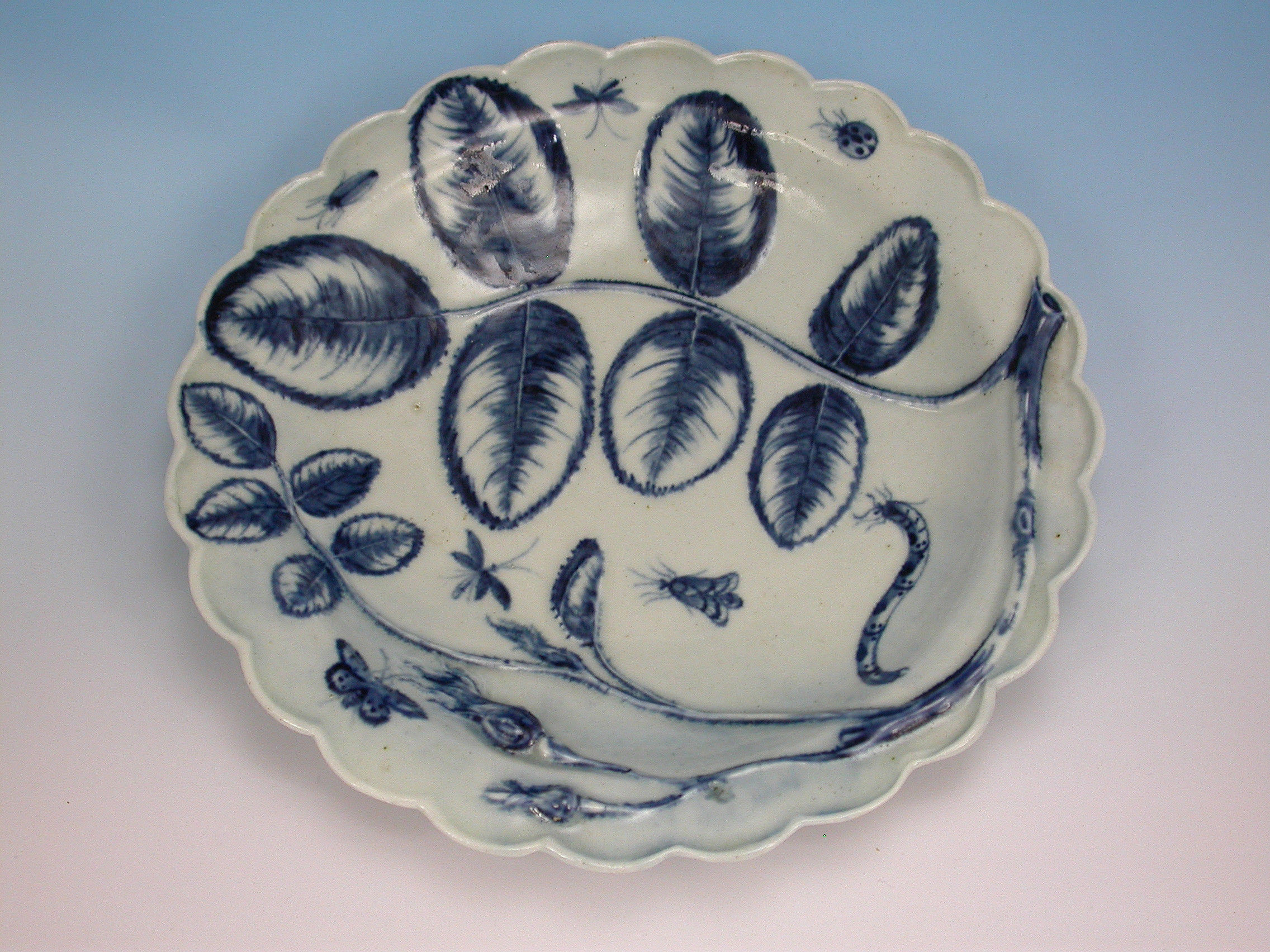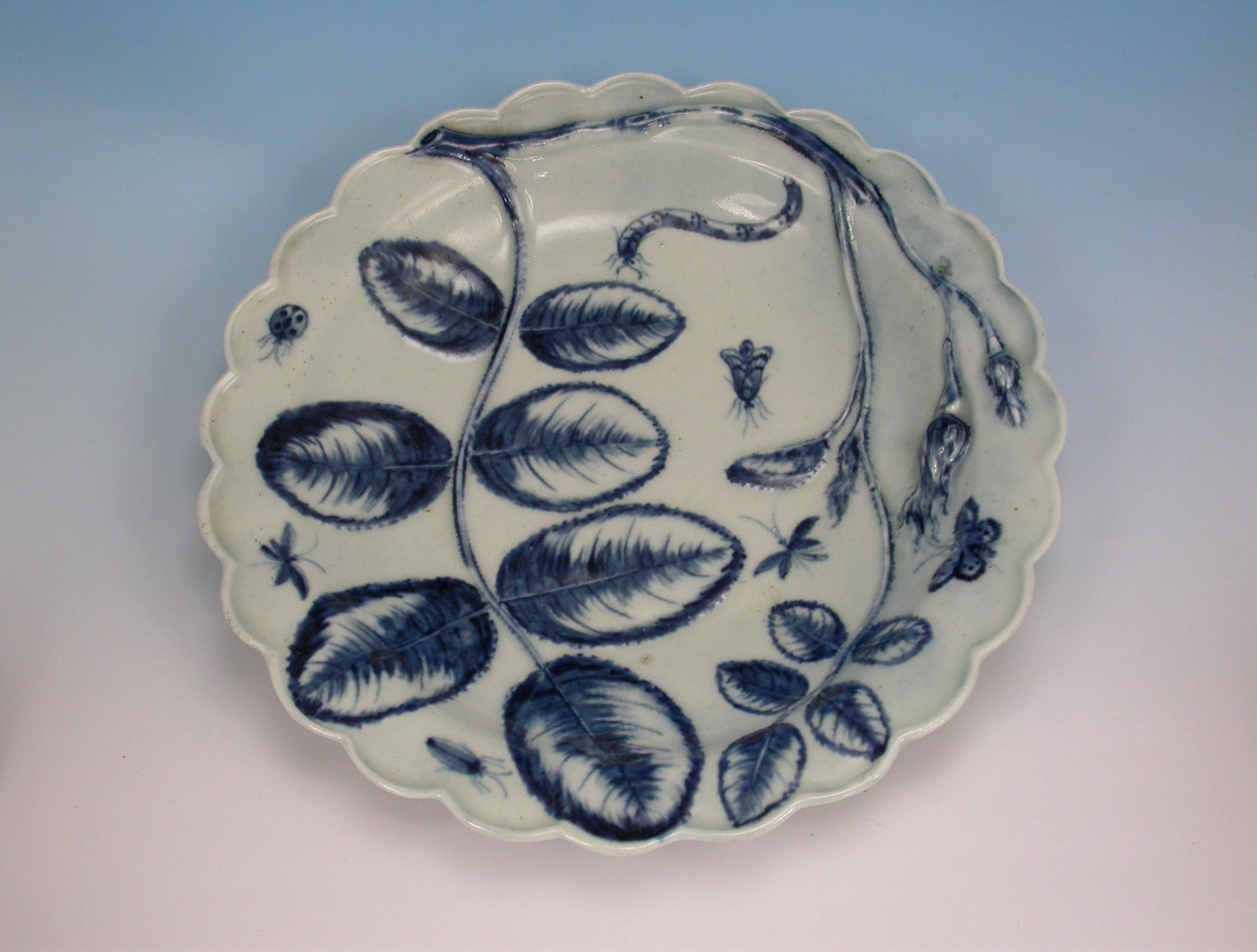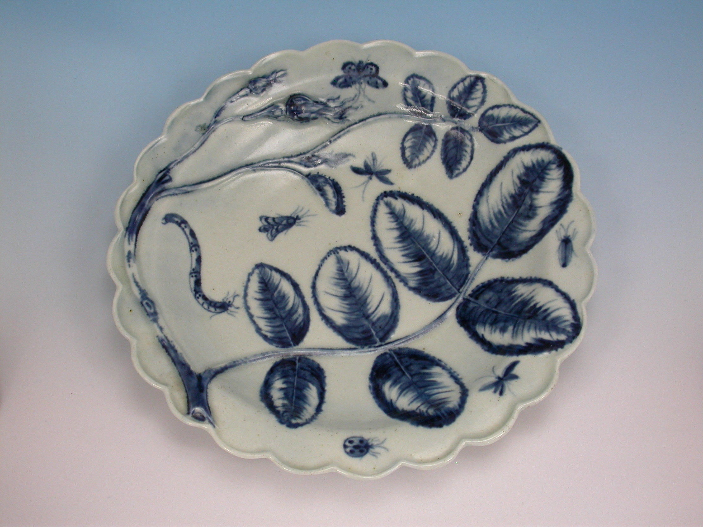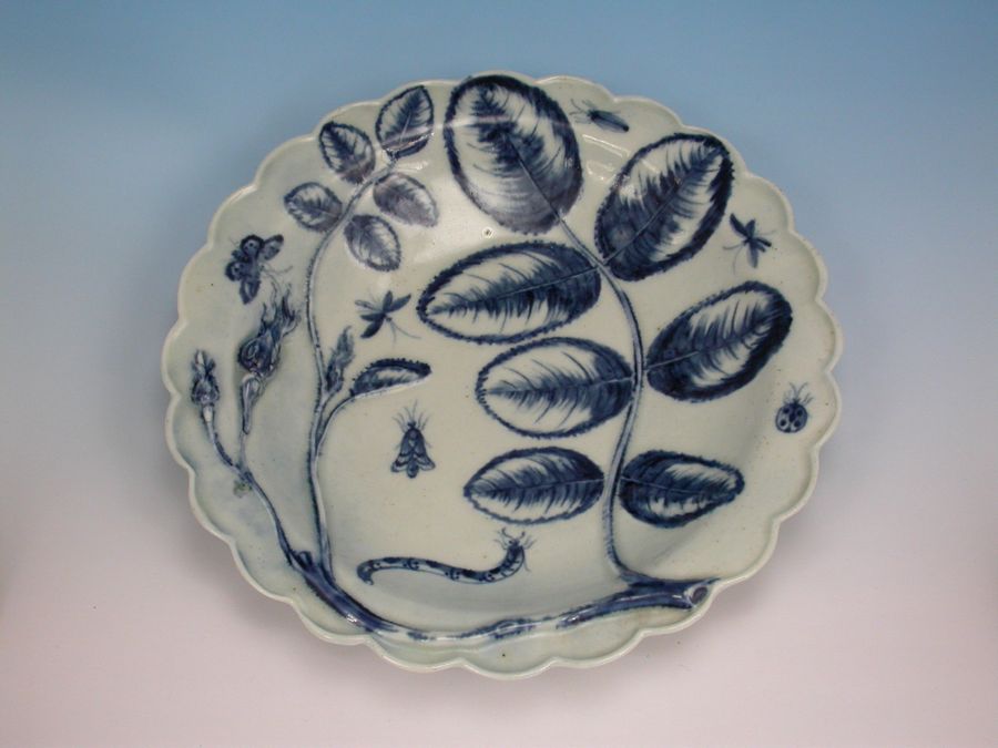 A fine First Period Worcester Dessert Plate of 'Blind Earl' type with raised moulded rose buds, leaves and scattered insects highlighted in under-glaze blue.
