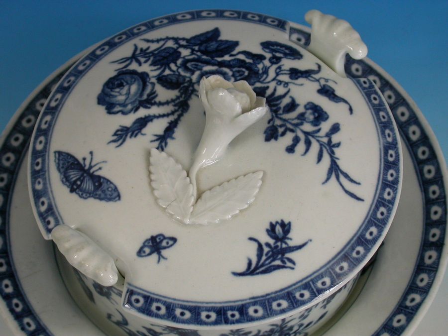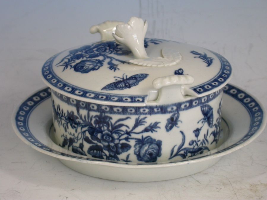 First Period Worcester Butter Tub, Cover & Stand ''Three Flowers Pattern'