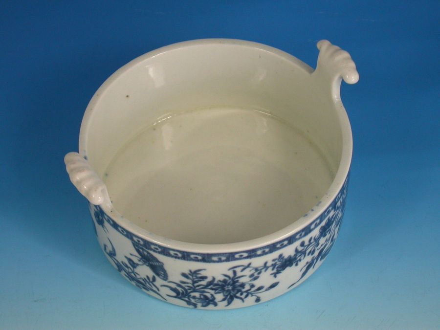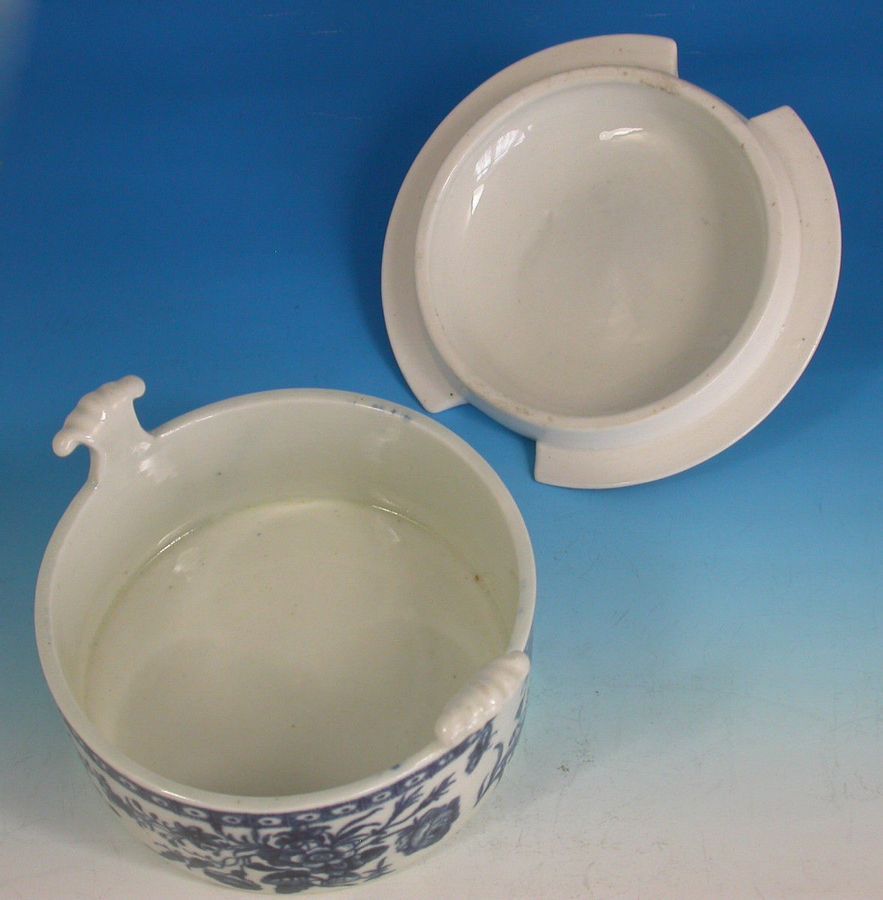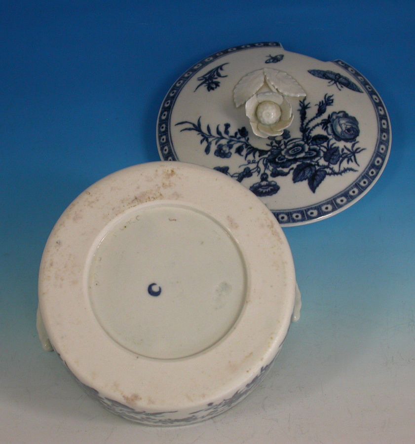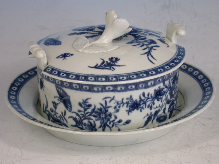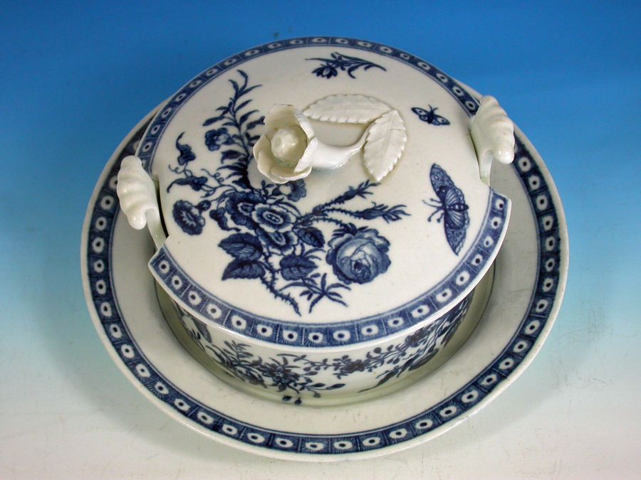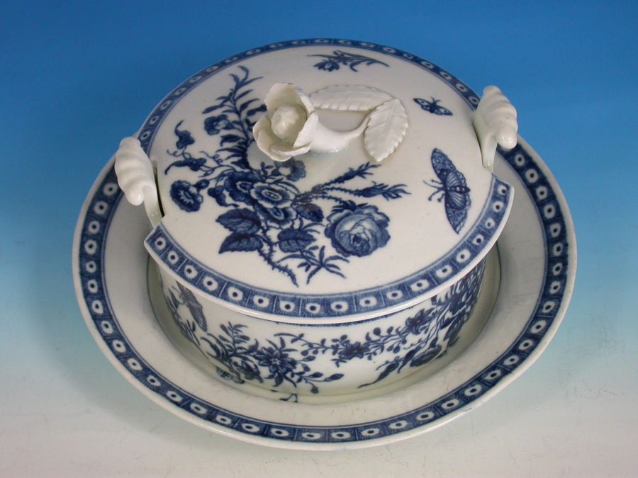 A very fine First Period Worcester Butter Tub, Cover and Stand with scrolled lug handles, the cover with open floral knop, printed in under-glaze blue with the three flowers pattern (IIC19 in Worcester blue and white porcelain). Depicting large foliate sprays and flying moths all within a cell border.