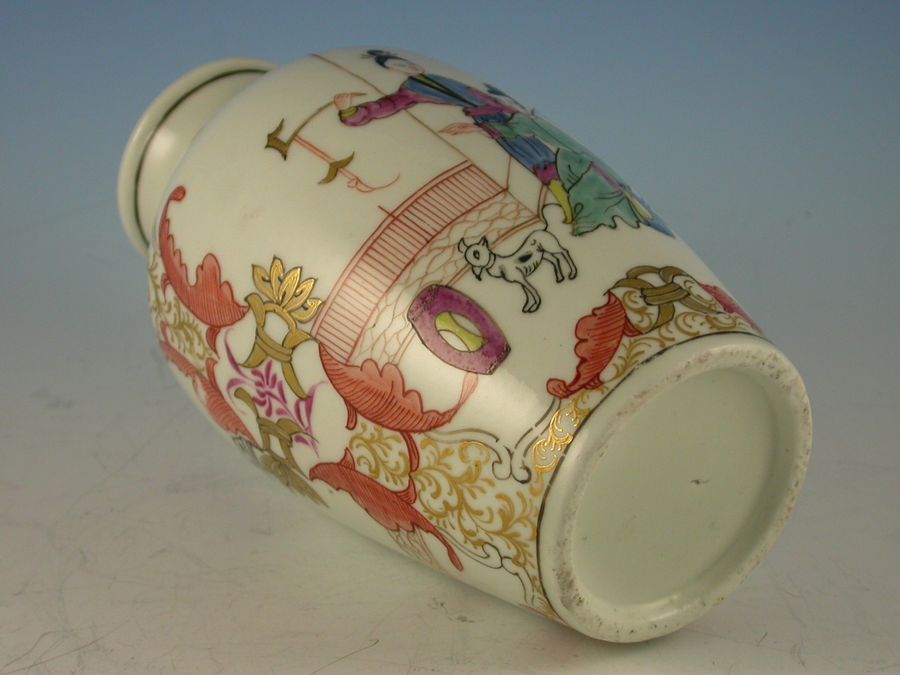 A fine First Period Worcester ovoid shaped Vase, painted in the Chinoiserie style within gilt and enamel scrolling.