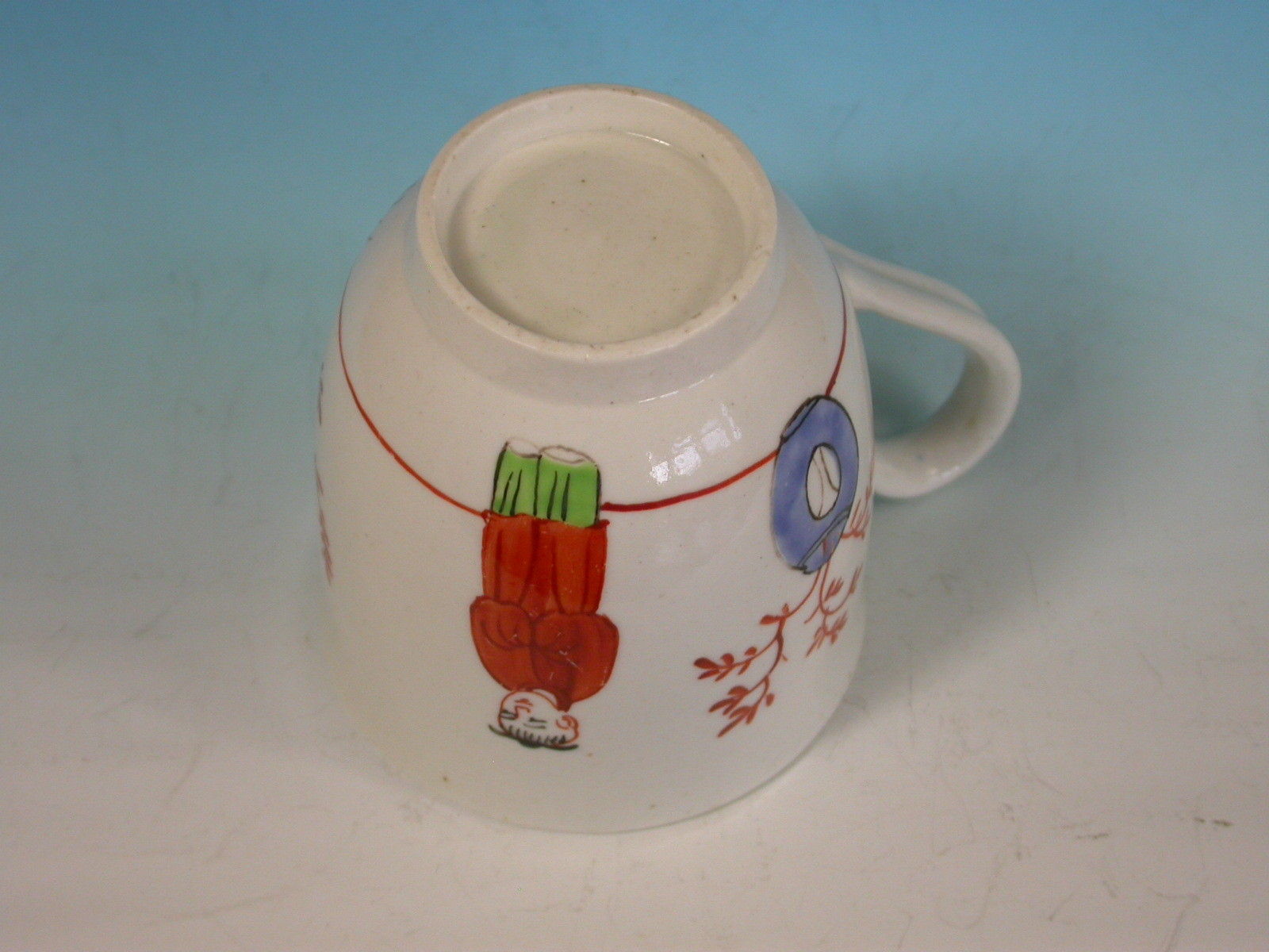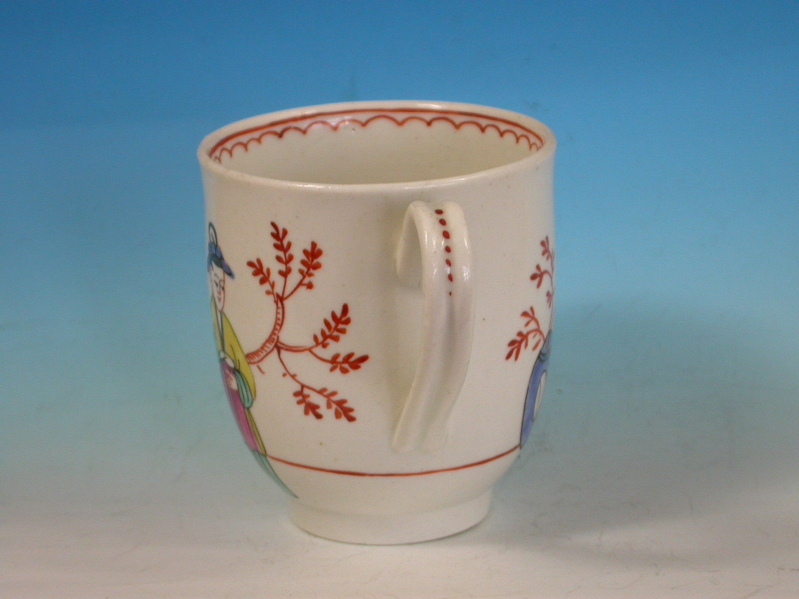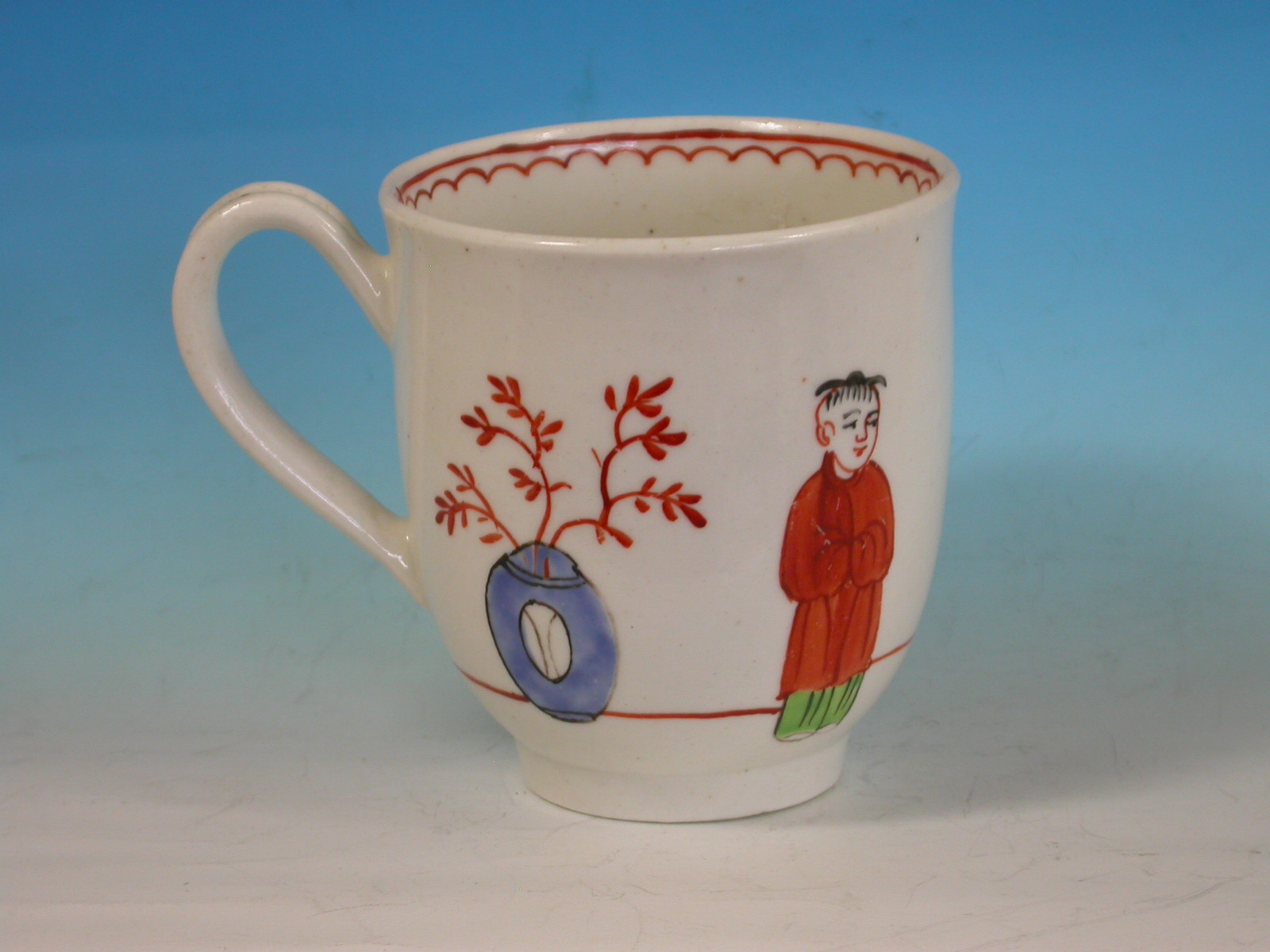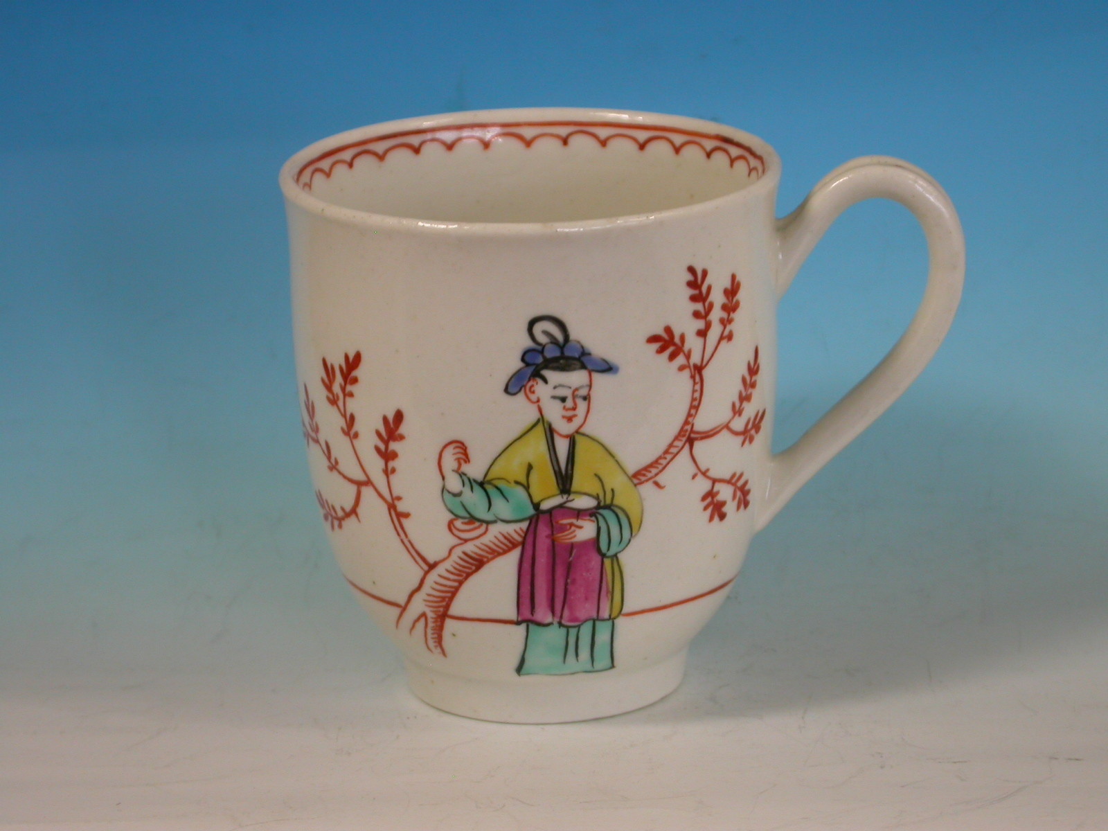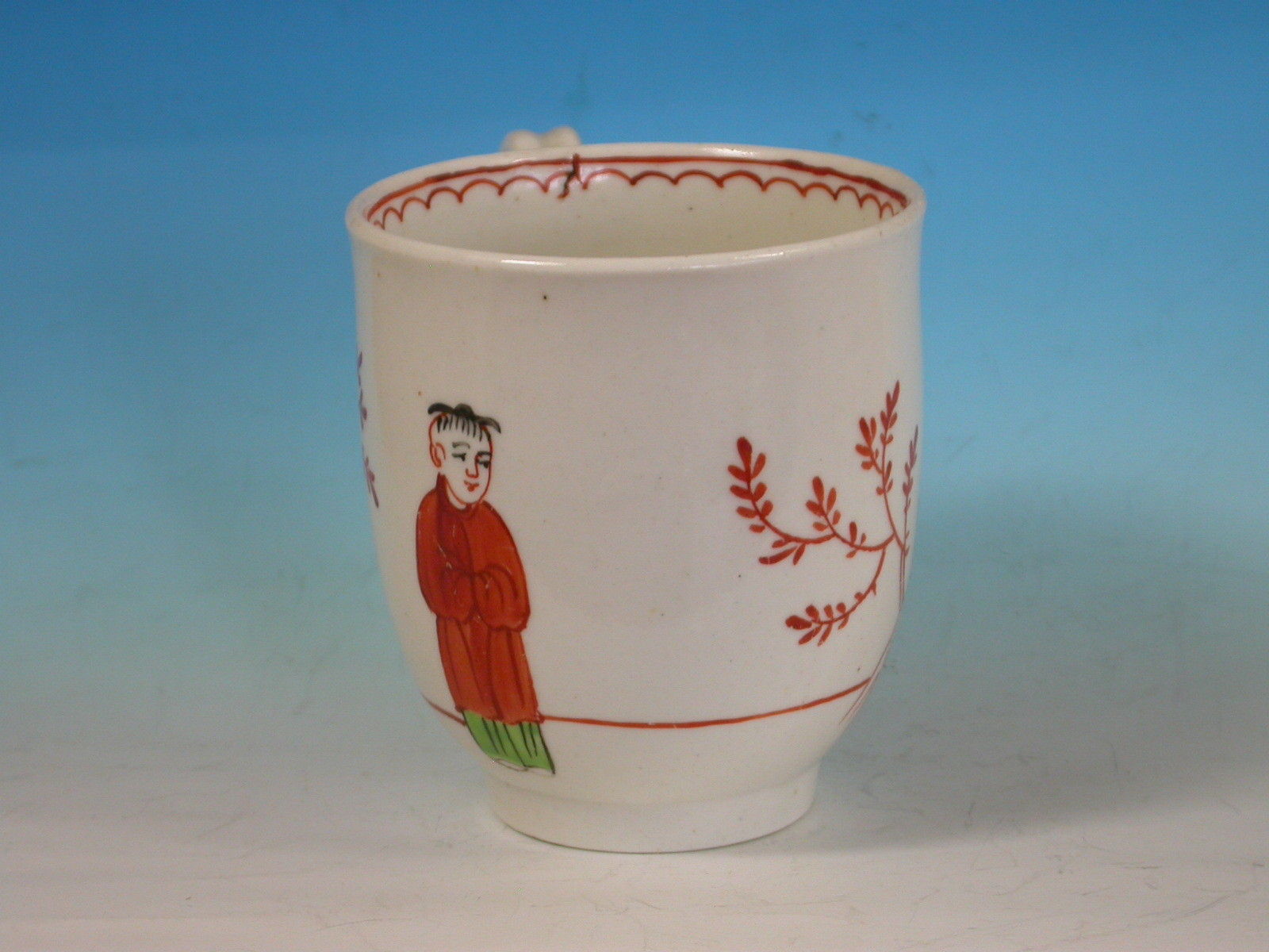 A good First Period Worcester cylindrical Coffee Cup with grooved strap handle, painted with Chinese figures.