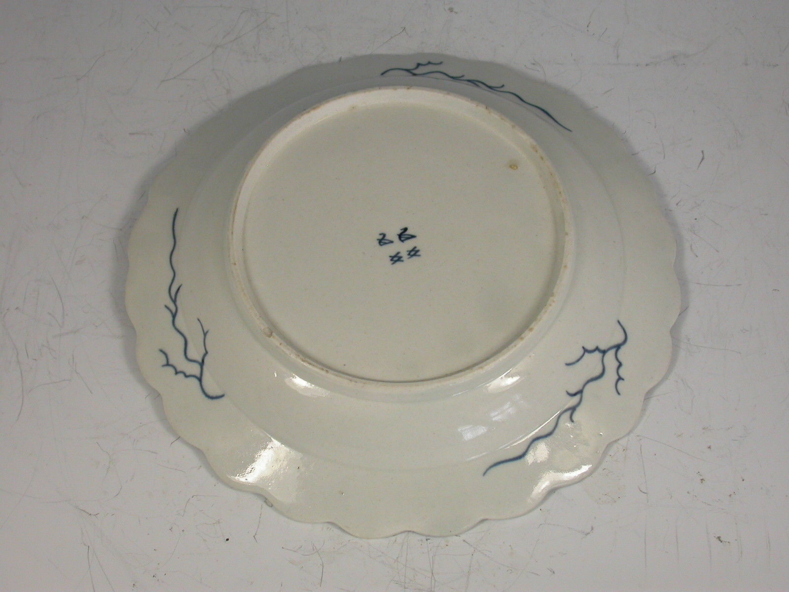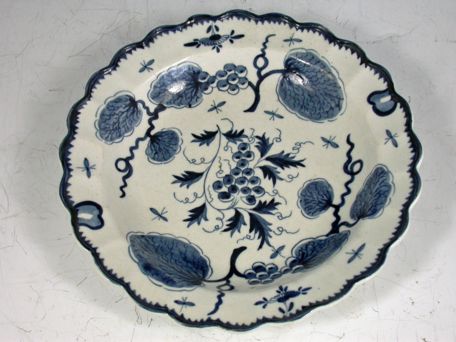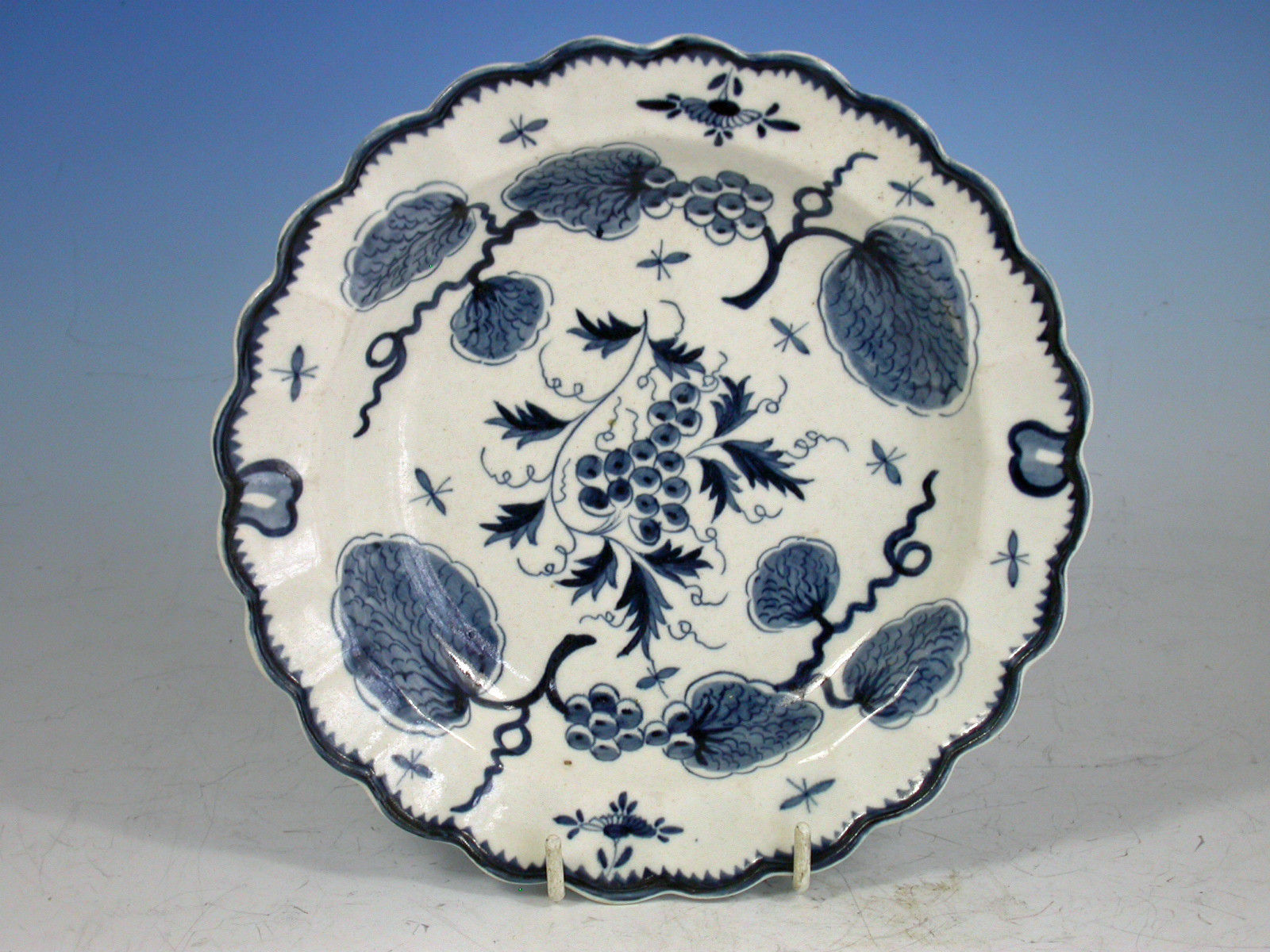 A good First Period Worcester deep Plate of fluted form, painted in under glaze blue with the ""rubber tree plant pattern"", (IE47 in BFS Worcester blue and white porcelain), depicting leaf and foliate sprays within larger leaf sprays and scattered insects. (Border number 3).