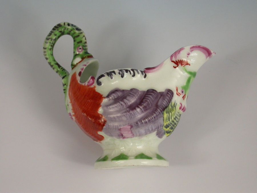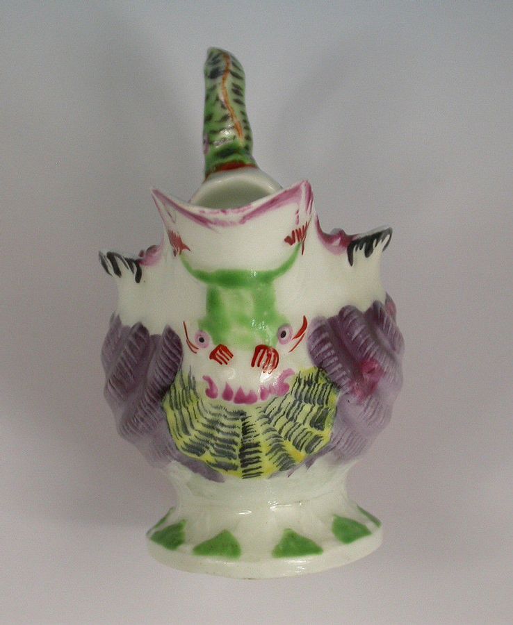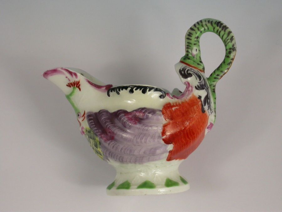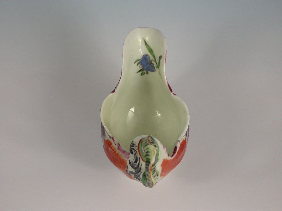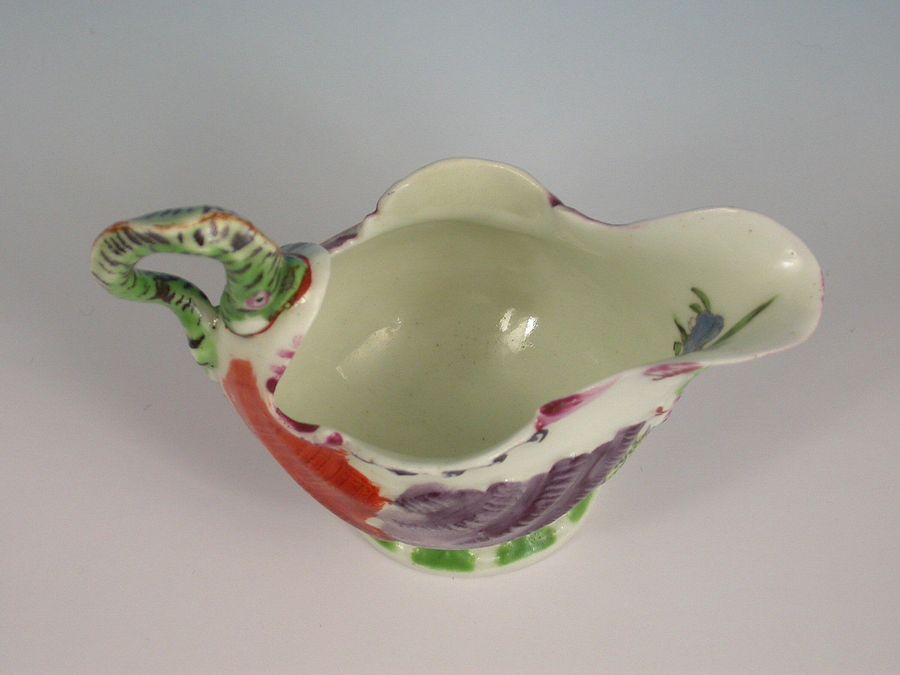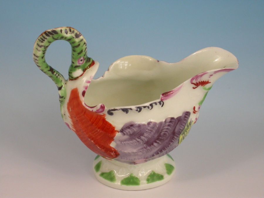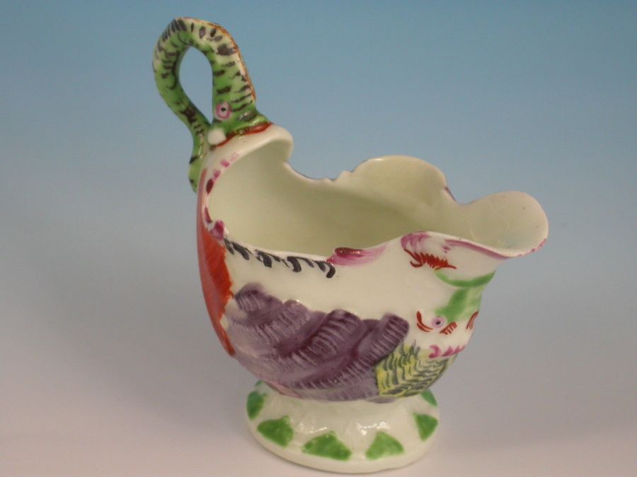 A good First Period Worcester dolphin Cream Boat with lamprey handle, two moulded dolphins beneath the spout, painted in polychrome enamels.