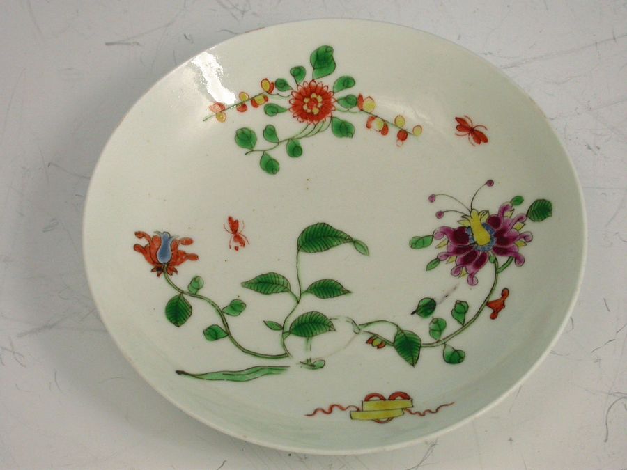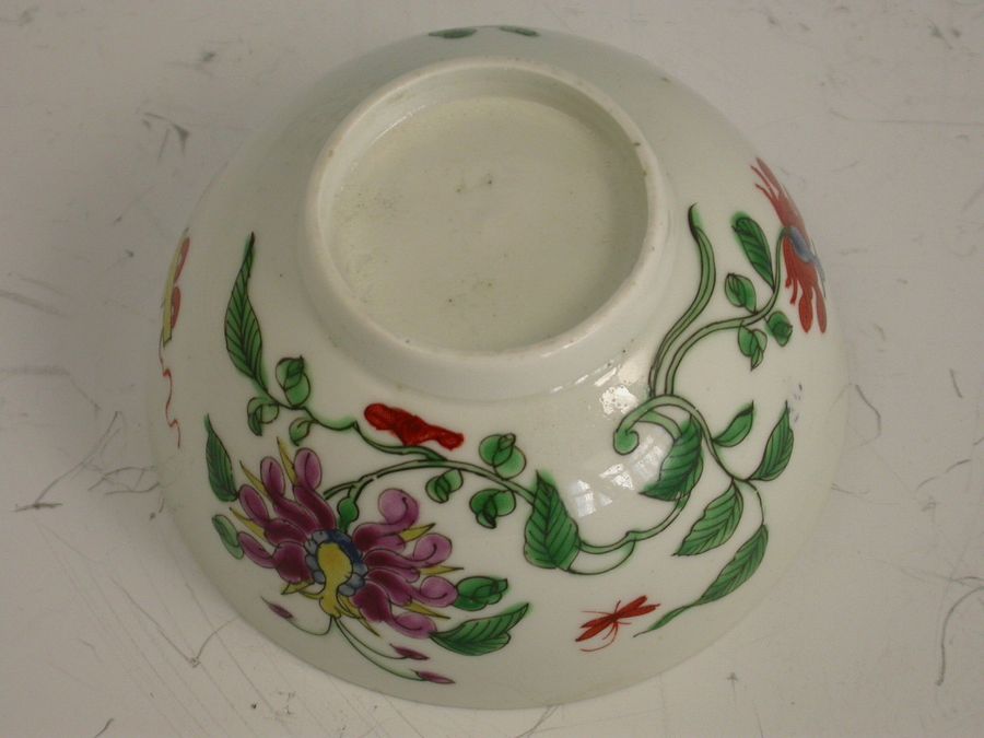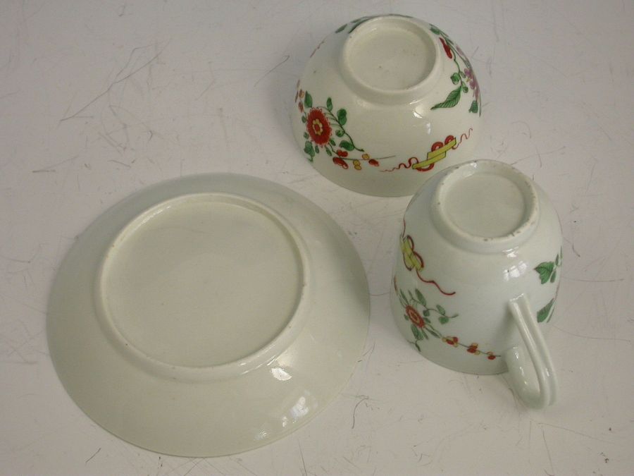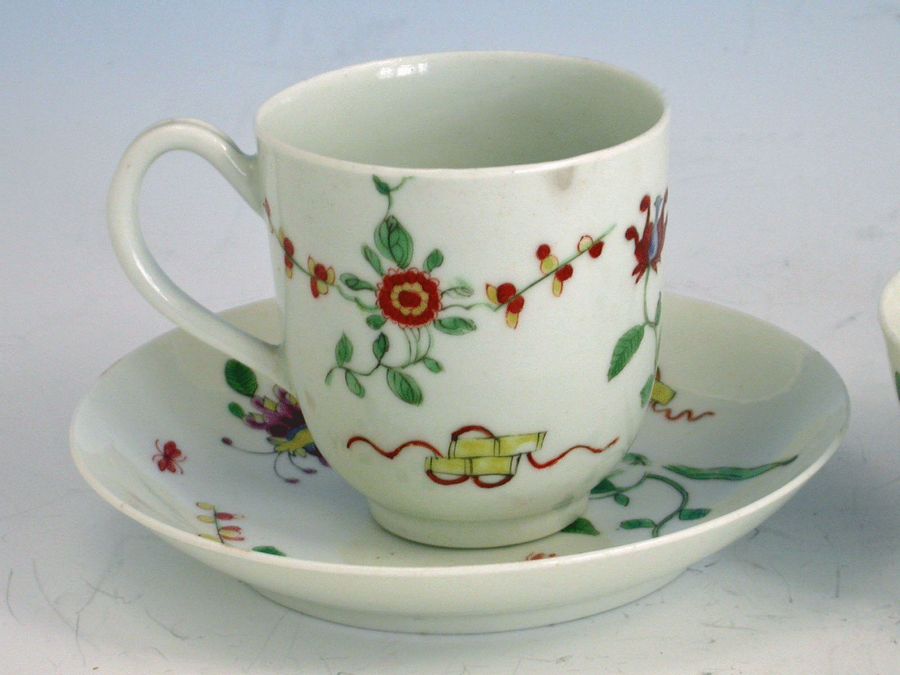 A fine Dr Wall Worcester Trio of Teabowl, Coffee Cup & Saucer, painted in a famille Rose style with the 'Hibiscus pattern', depicting oriental flower sprays, scrolls and small insects.