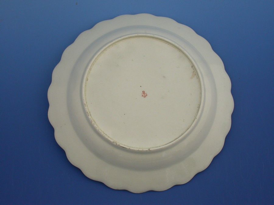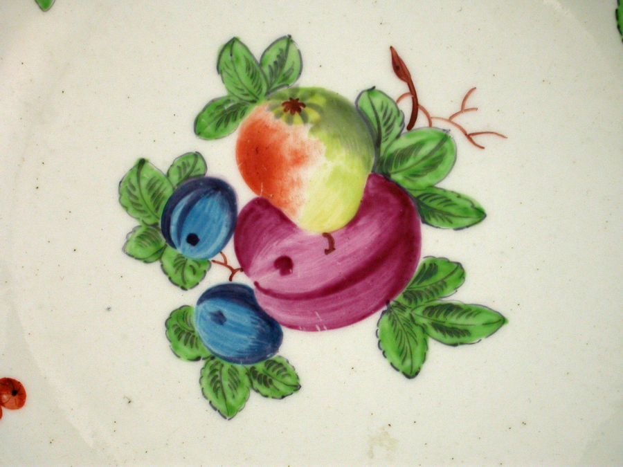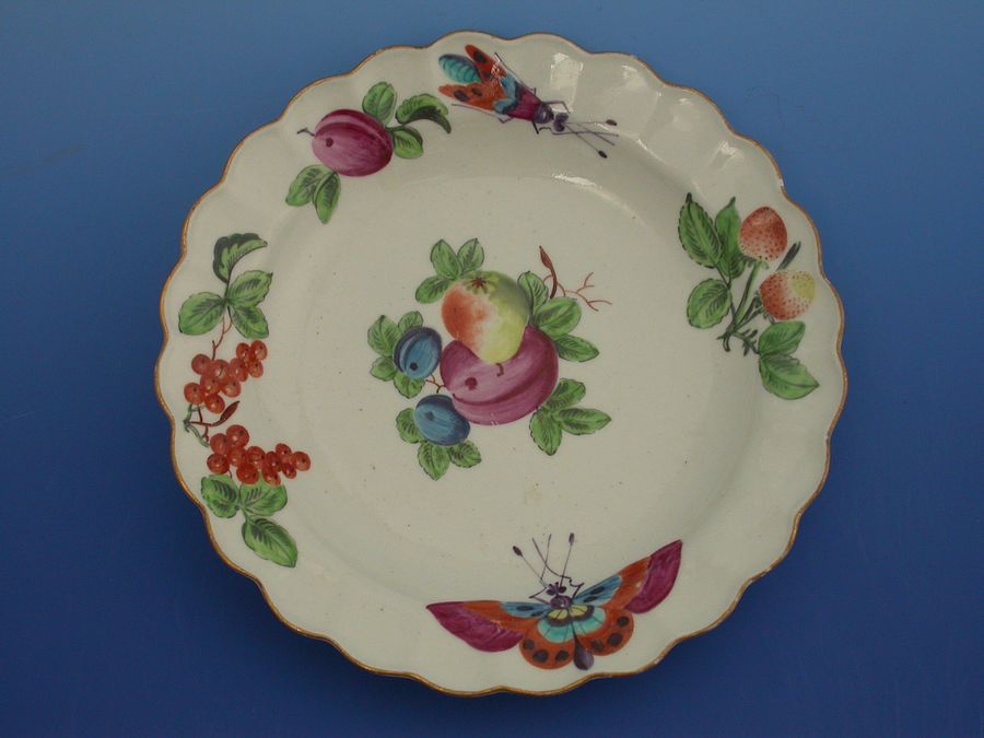 A fine First Period Worcester Dessert Plate of faceted form, painted in polychrome enamels with a central bouquet of plums, damsons and a pear within a border of red currants, strawberries, a plum and two large moths, gilt line rims.