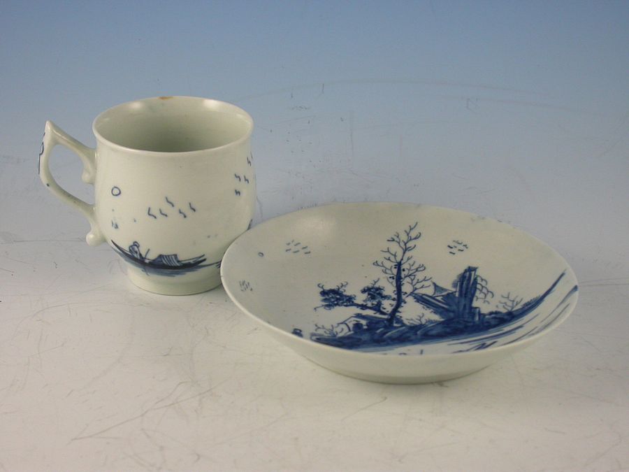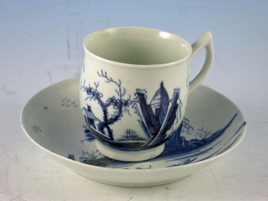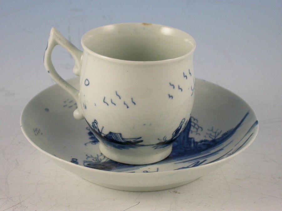 A fine First Period Worcester Coffee Cup and Saucer painted with the Gazebo pattern, the bell shaped Coffee Cup with pixie ear handle.
