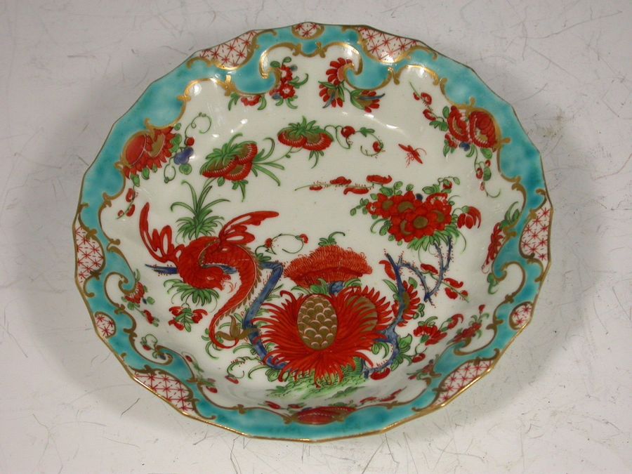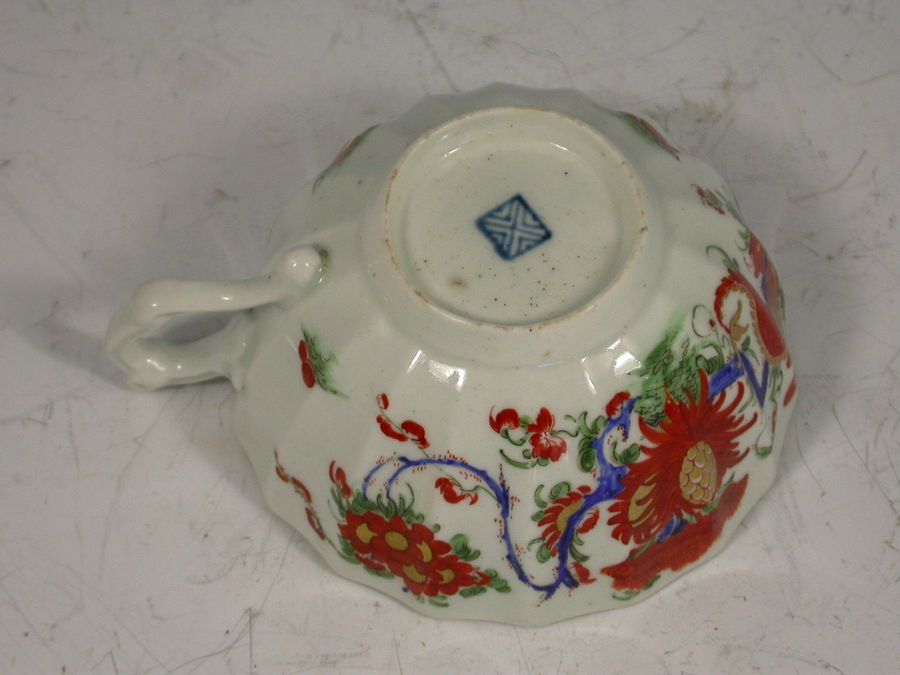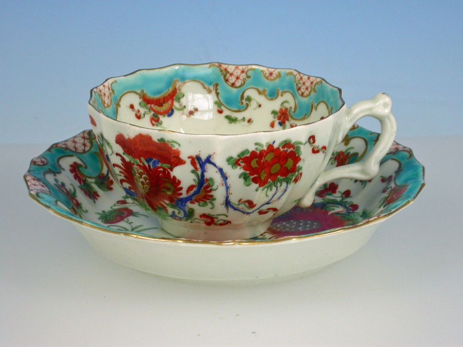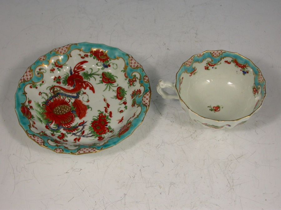 A fine First Period Worcester Teacup and Saucer of fluted form with scroll handle, painted in Kakiemon style with the so-called ""Jabberwocky"" pattern depicting a long tailed dragon type bird perched on an over-glaze blue enamel branch, surrounded by rich foliage, all within a cornucopia turquoise border, gilt lined rims.
