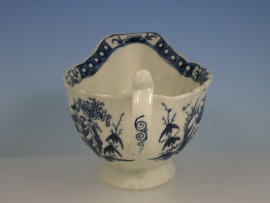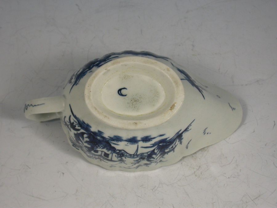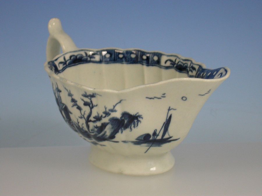 A fine and rare First Period Worcester Sauceboat of fluted form with loop handle and high thumb rest, on oval low footed base, painted in under-glaze blue with the 'Mission Church' pattern, depicting a church style building amidst knarled trees, rocks and foliage and a Chinaman holding a spear in a Sanpan, the interior with an island scene within a paneled border of hatched dots and foliage.