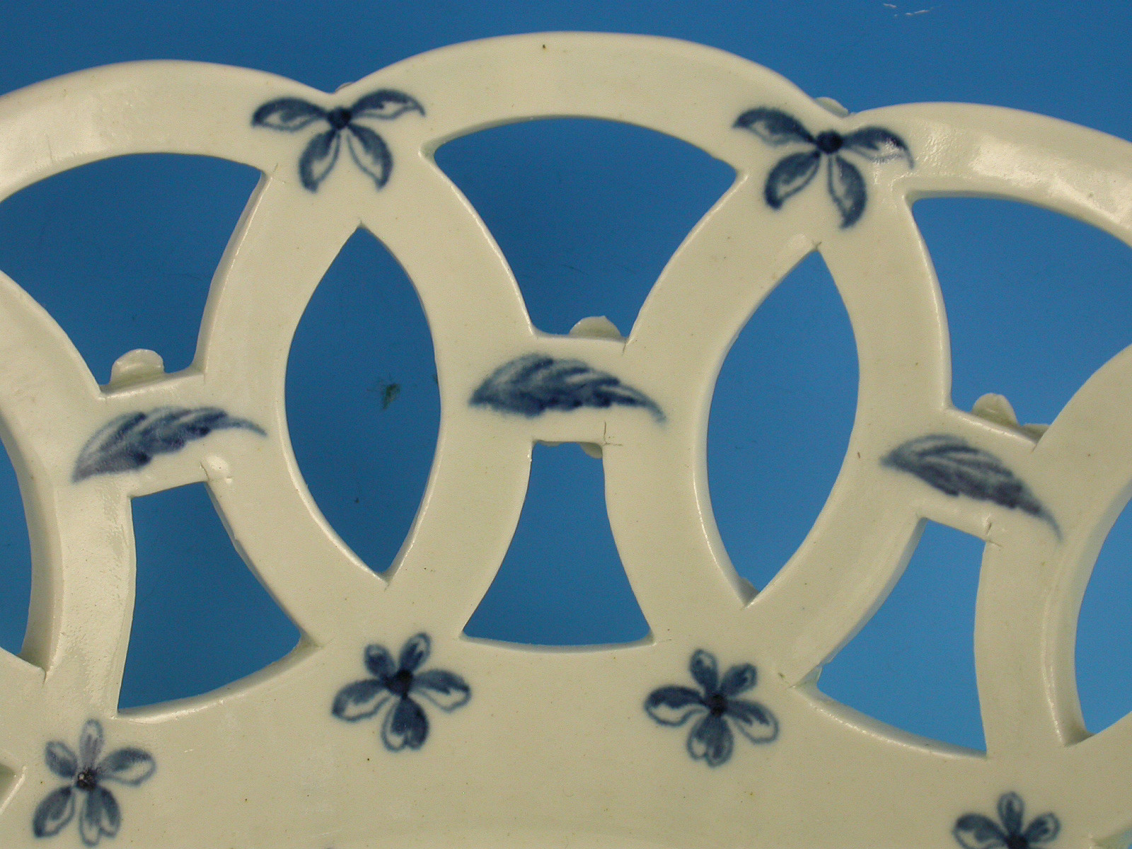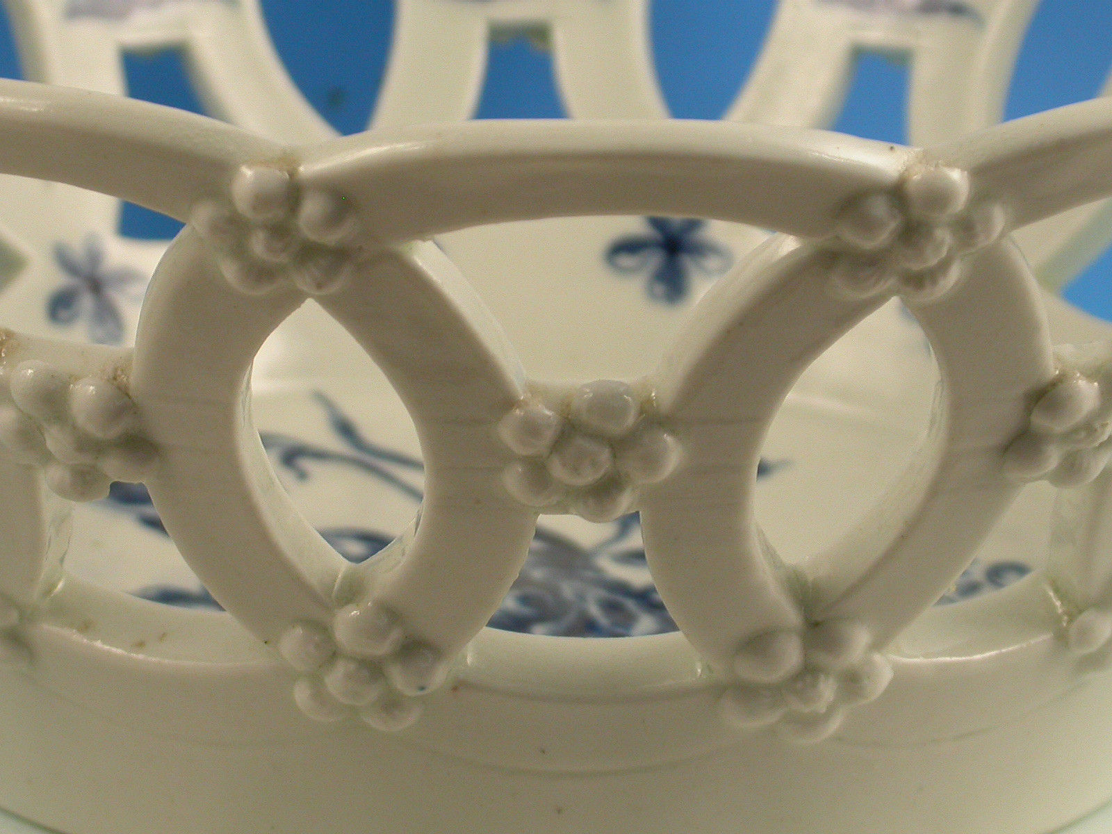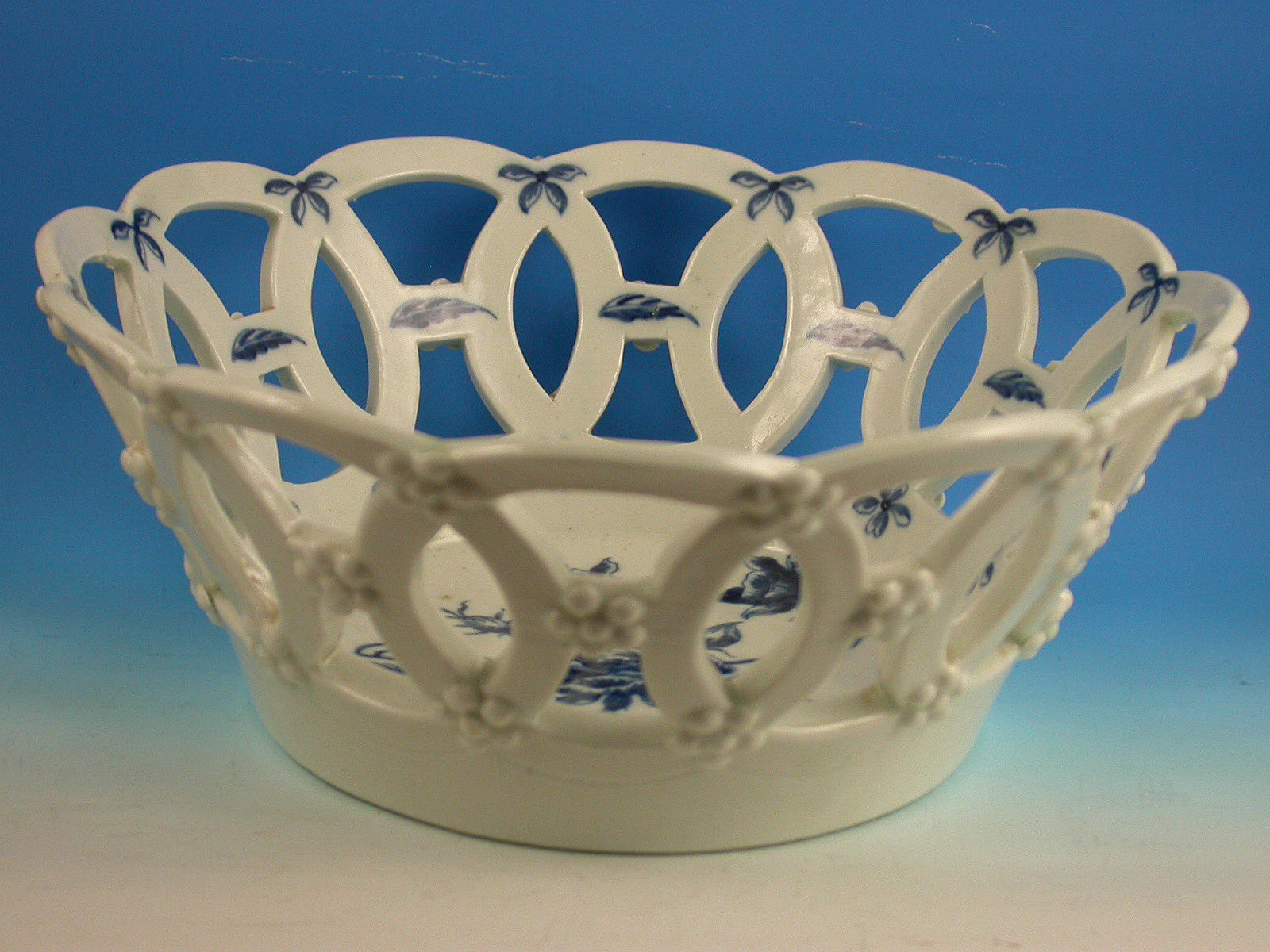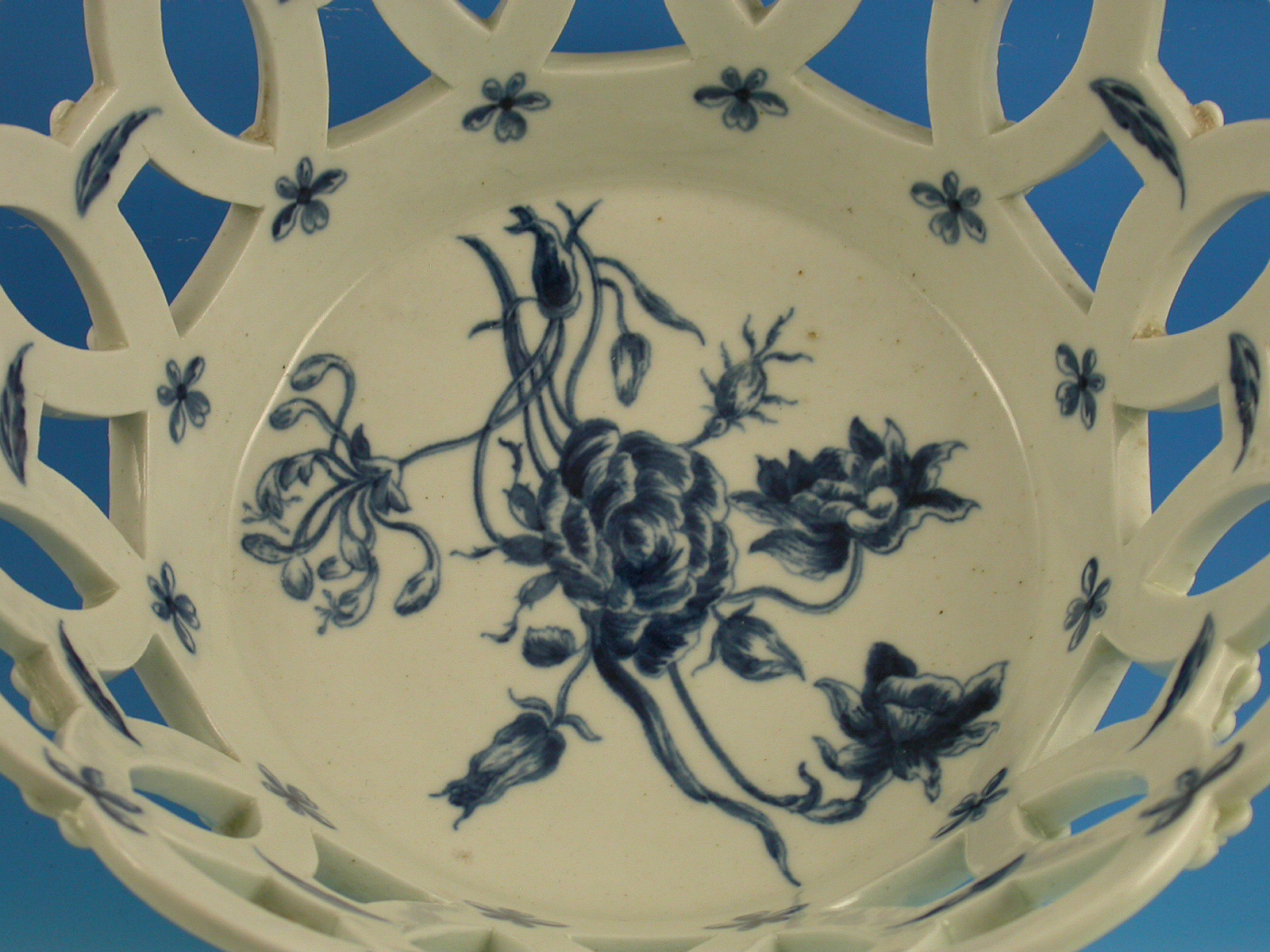 A good First Period Worcester peirced circular basket, the interlaced circlets with applied florets to the exterior, painted in under-glaze blue with the ""Honeysuckle, Narcissus and Anemone spray pattern"" (IE24 in BFS Worcester Blue and White porcelain), depicting a large foliate spray to the interior within individual leaves to the sides.