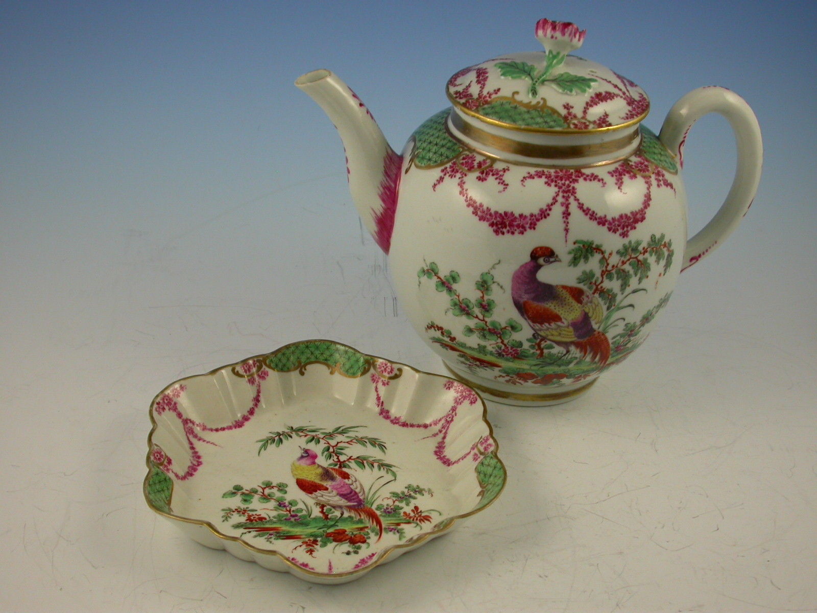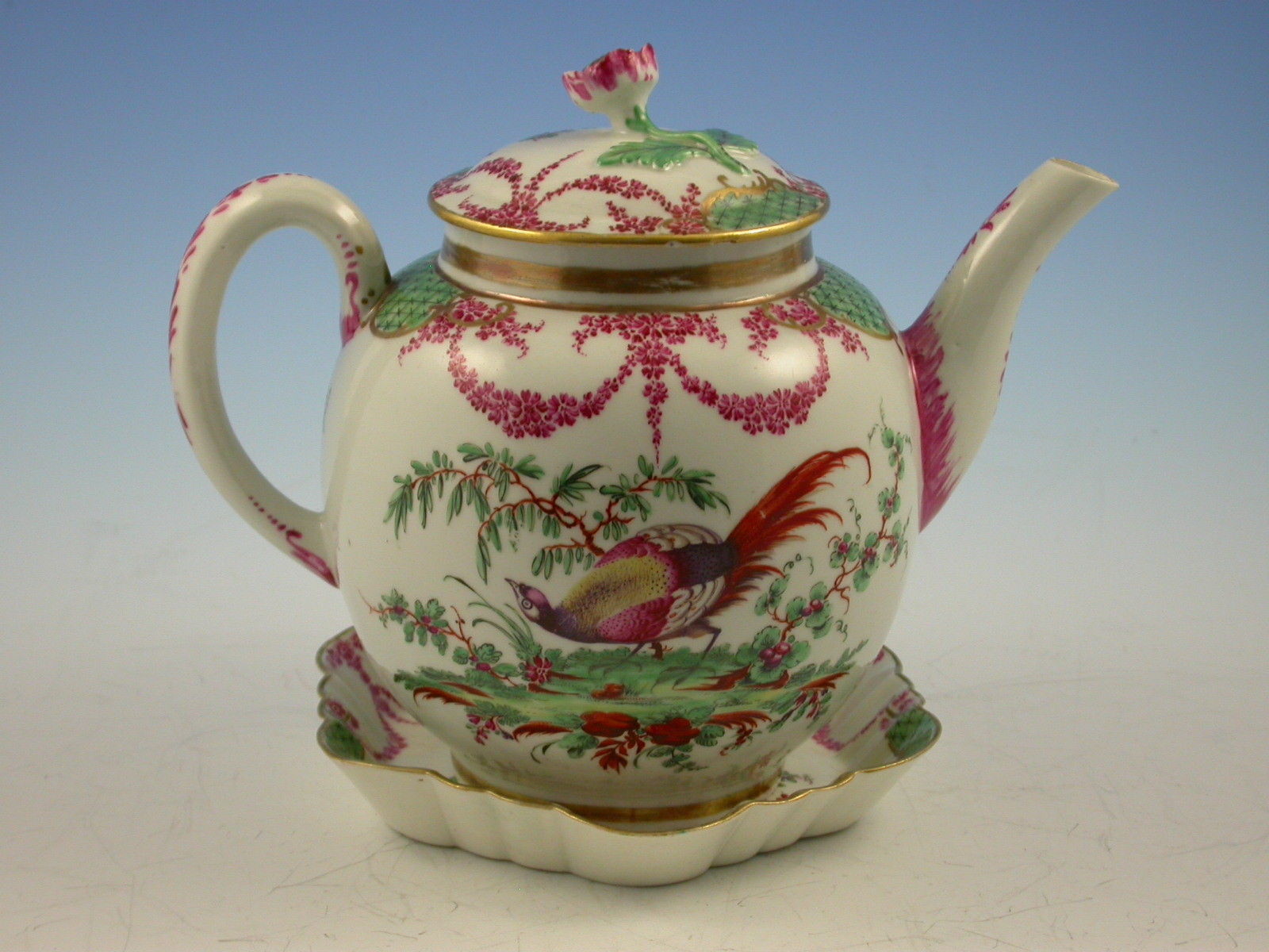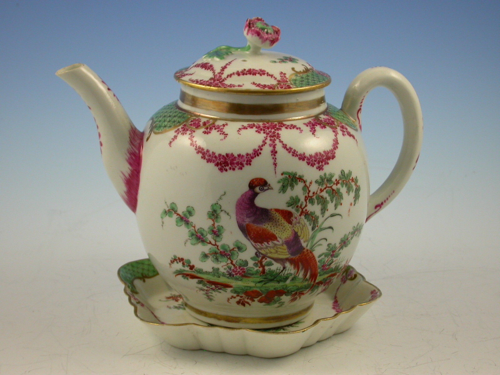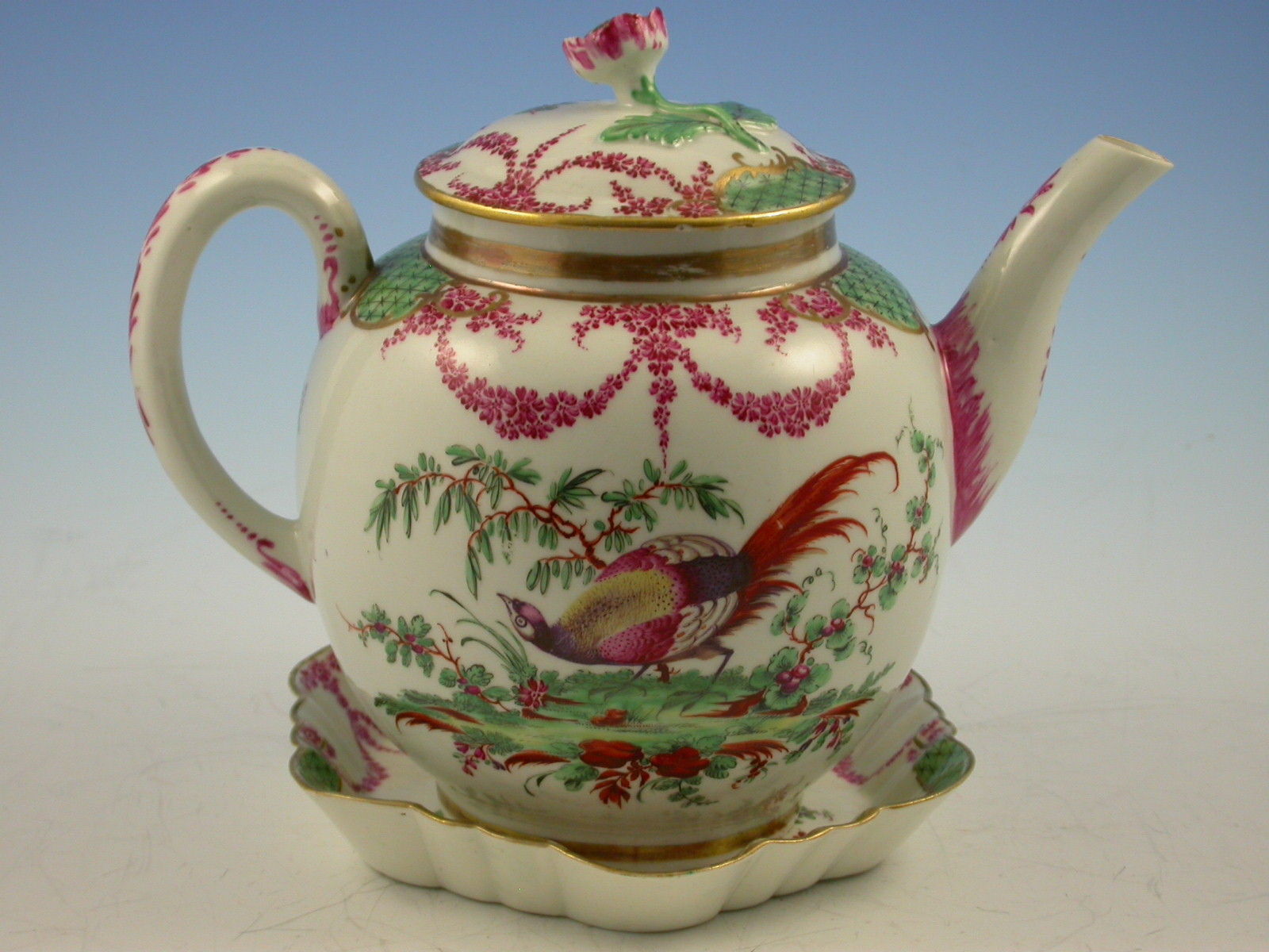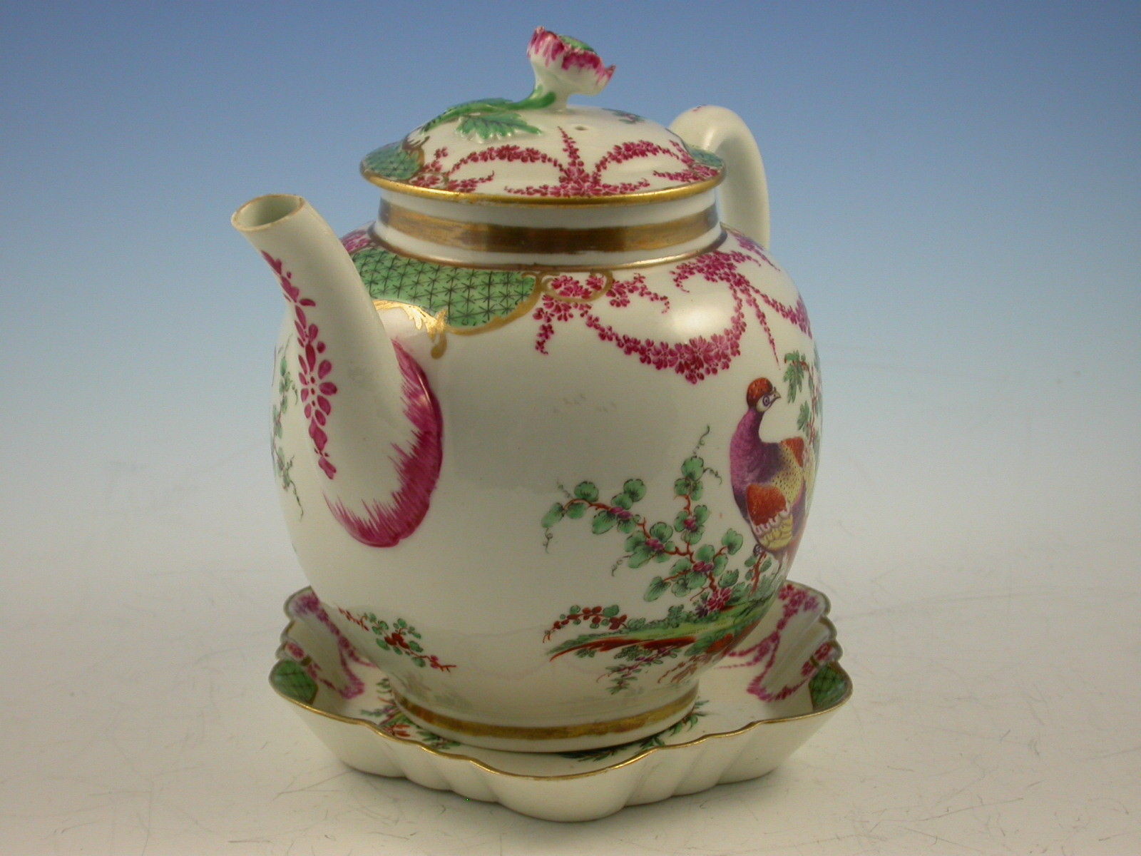 A fine and rare First Period Worcester Teapot, Cover and Stand, decorated with exotic birds standing in parkland settings amongst plants and shrubs, the gilt enriched borders with green diaper panels flanked by puce foliate swags.