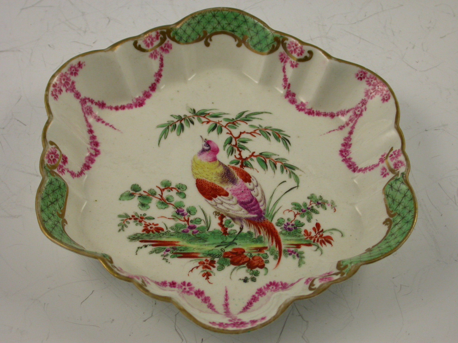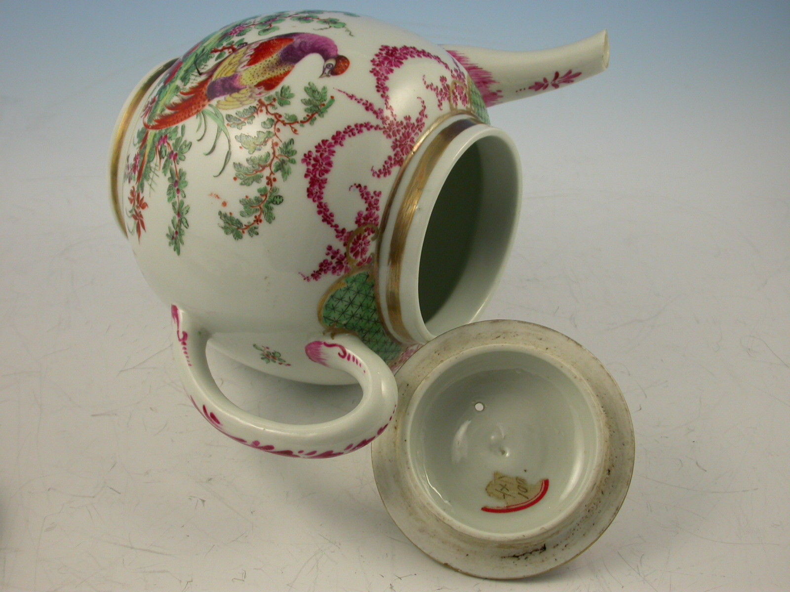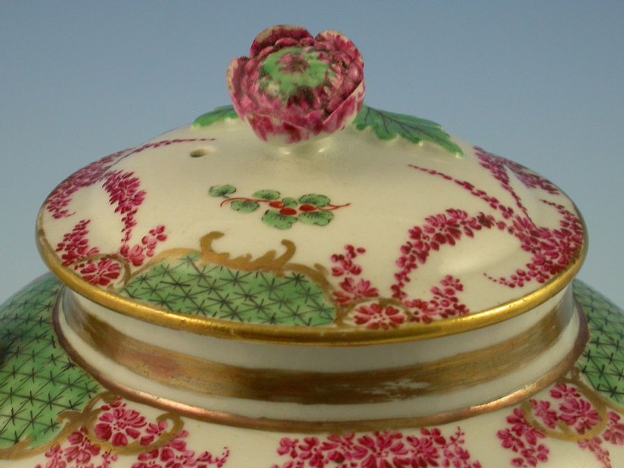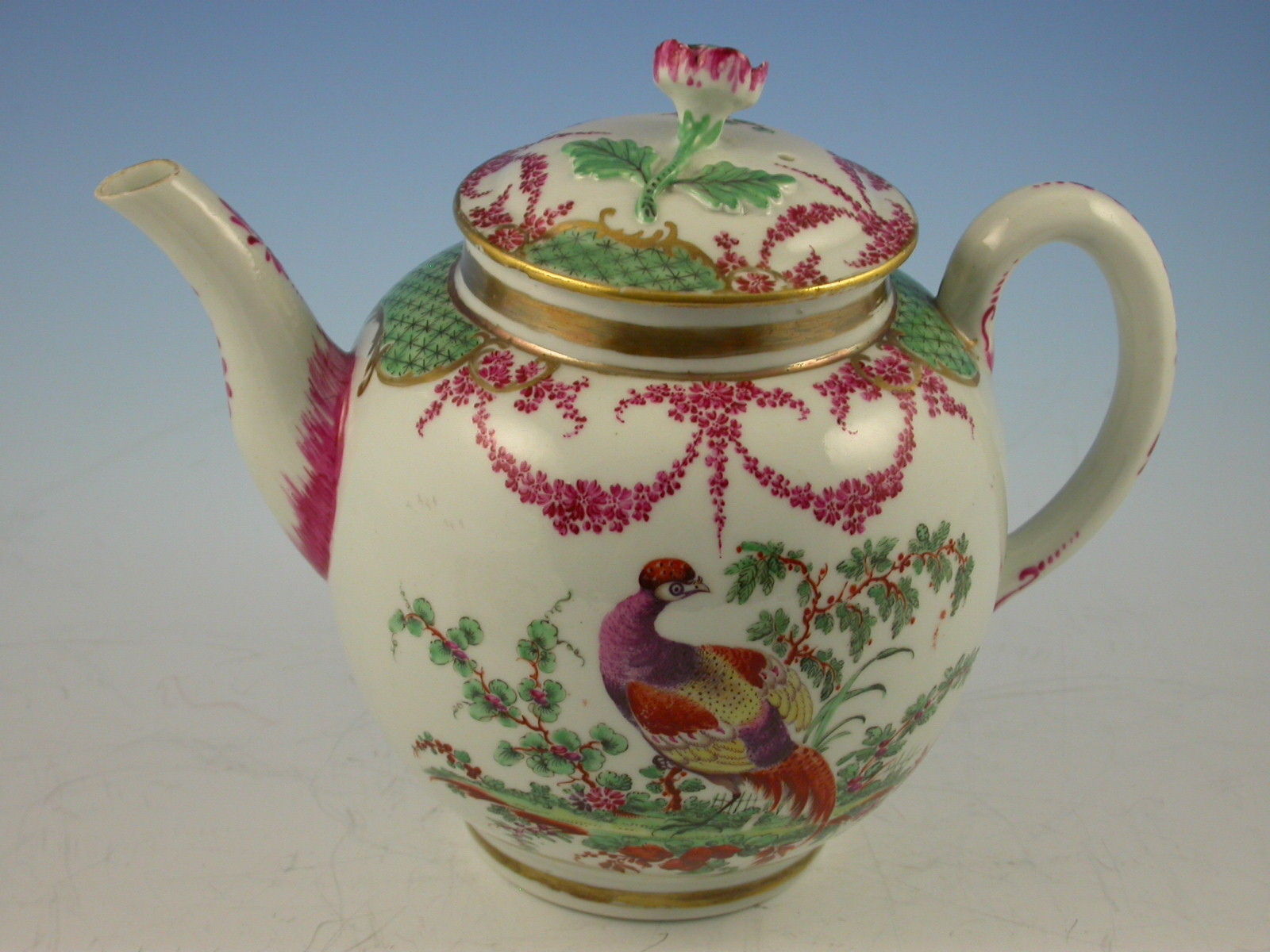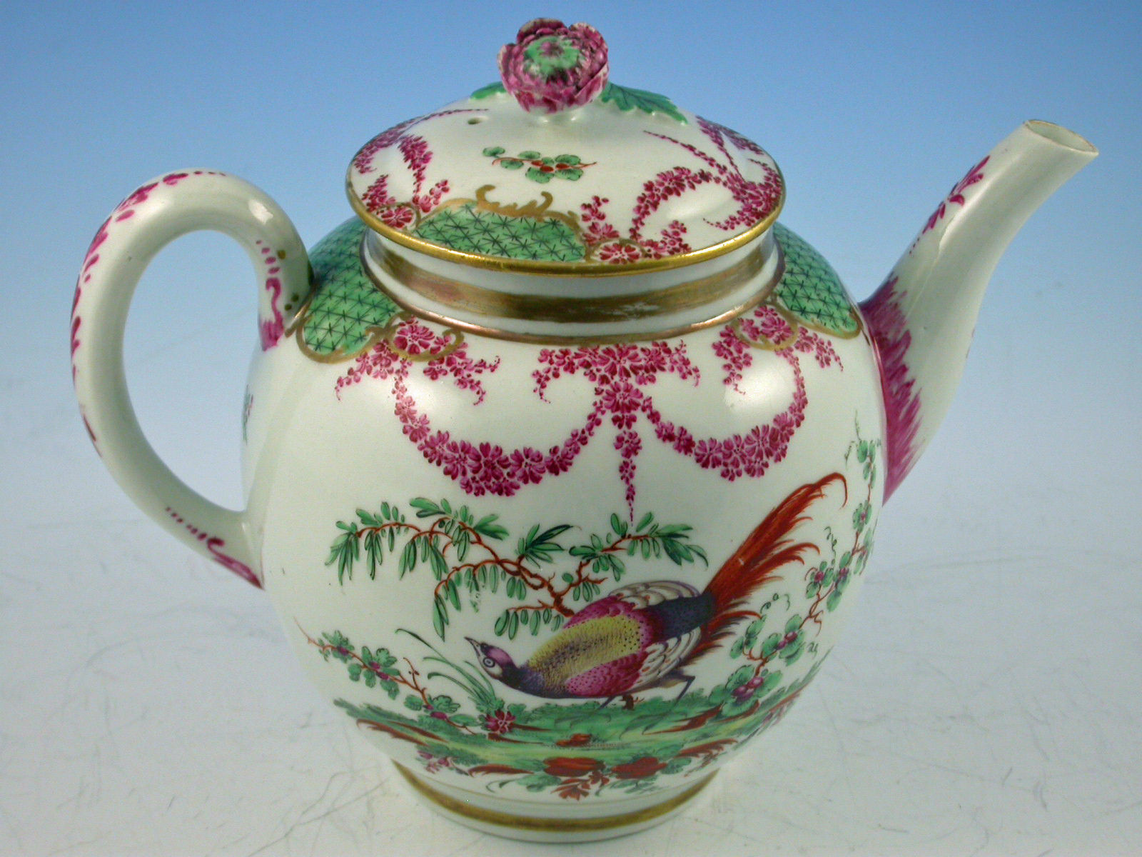A fine and rare First Period Worcester Teapot, Cover and Stand, decorated with exotic birds standing in parkland settings amongst plants and shrubs, the gilt enriched borders with green diaper panels flanked by puce foliate swags.