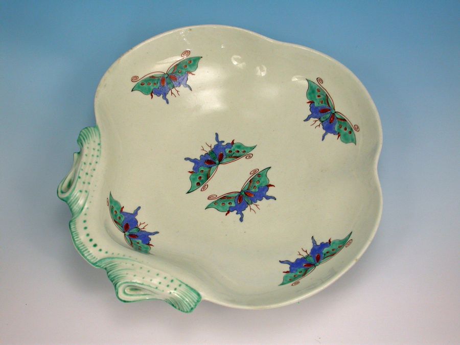 An extremely rare First Period Worcester shell moulded Dessert Dish with scrolled handle, painted in polychrome enamels with butterflies in green and iron red.