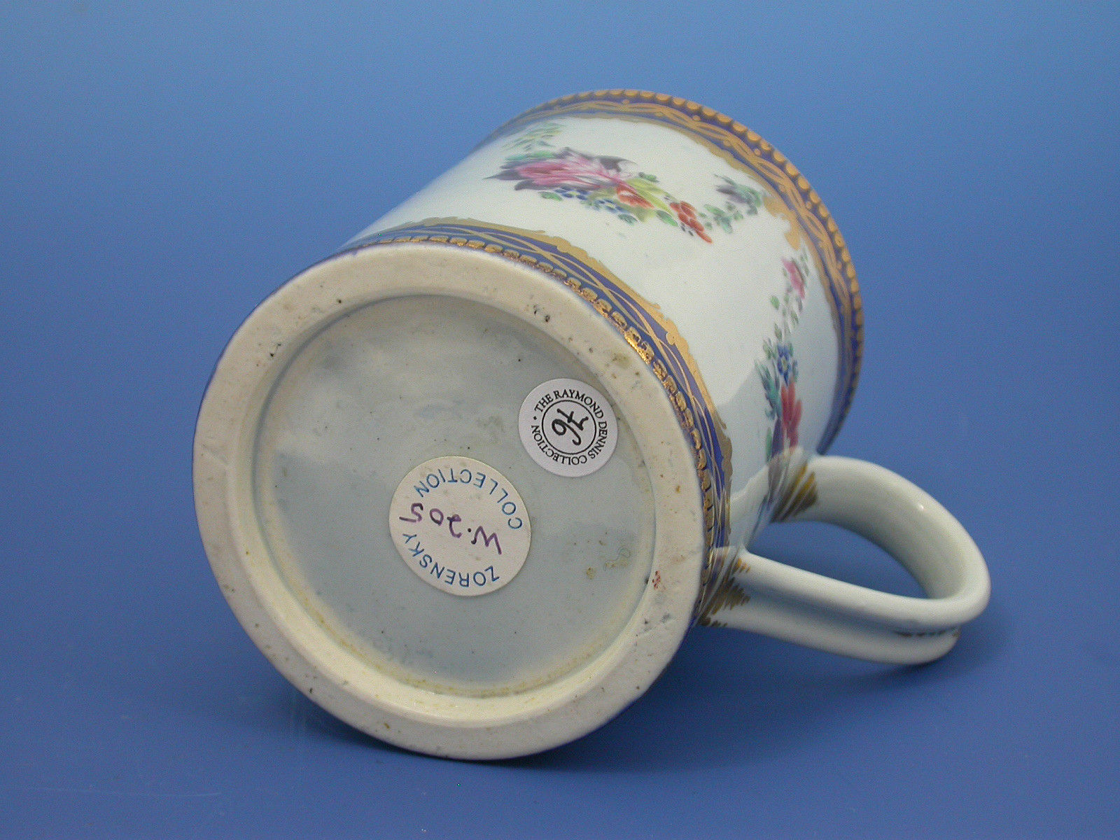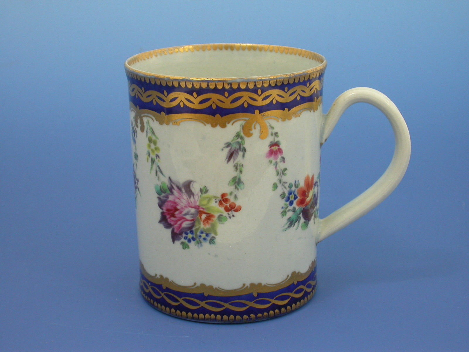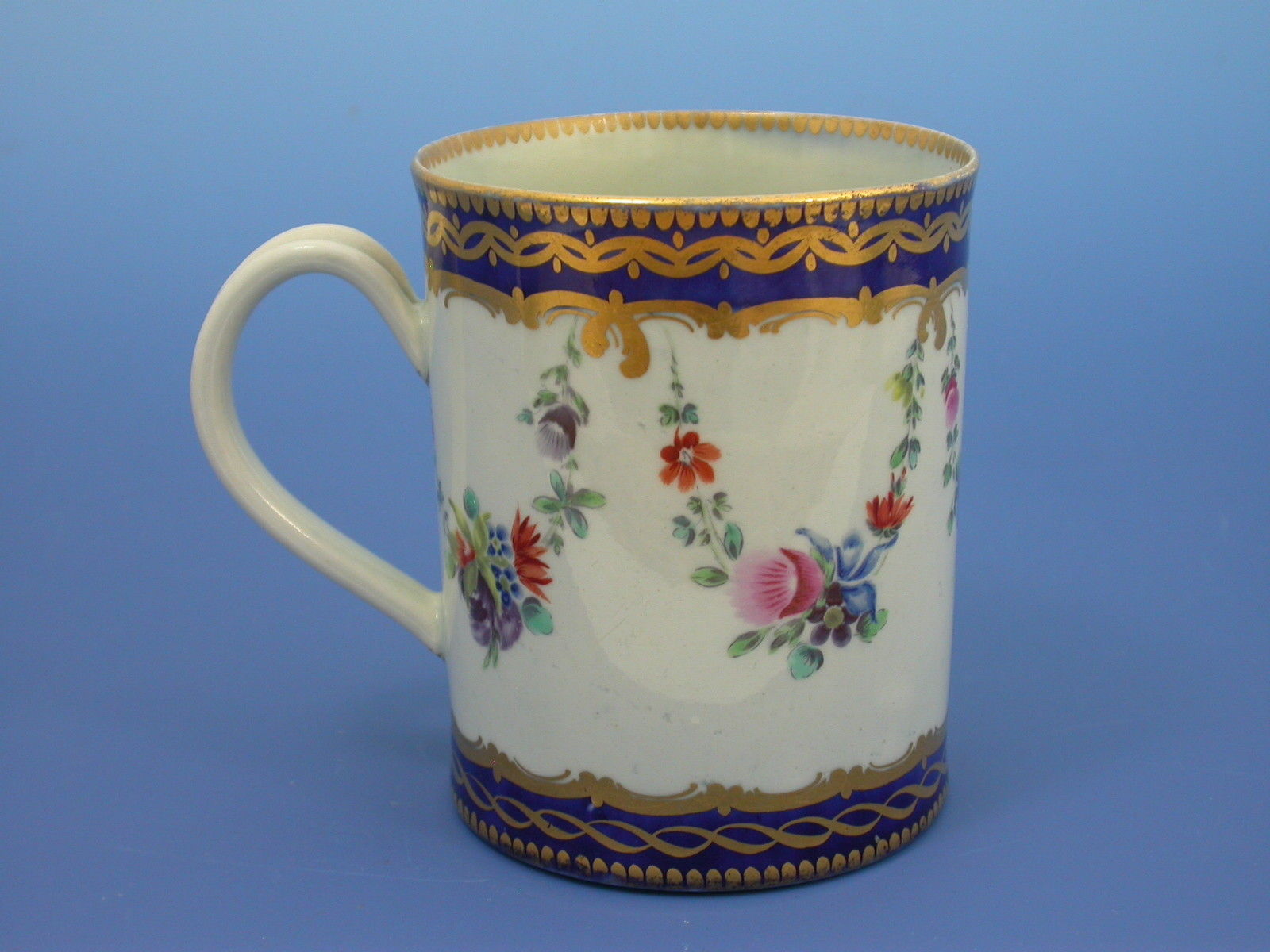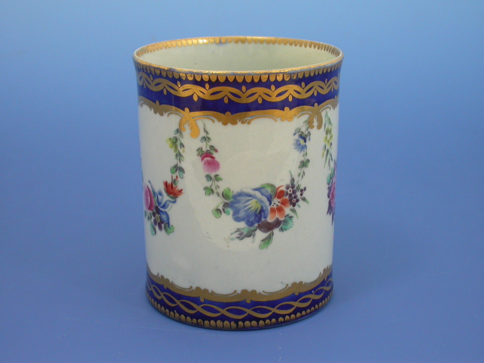 A good First Period Worcester cylindrical Mug of small size with grooved strap handle, painted in polychrome enamels with swags of garden flowers pendant from a gilt enriched wet blue border.