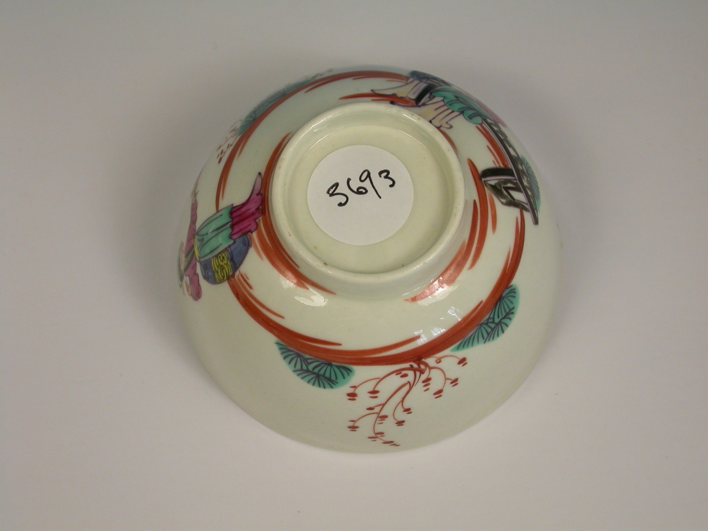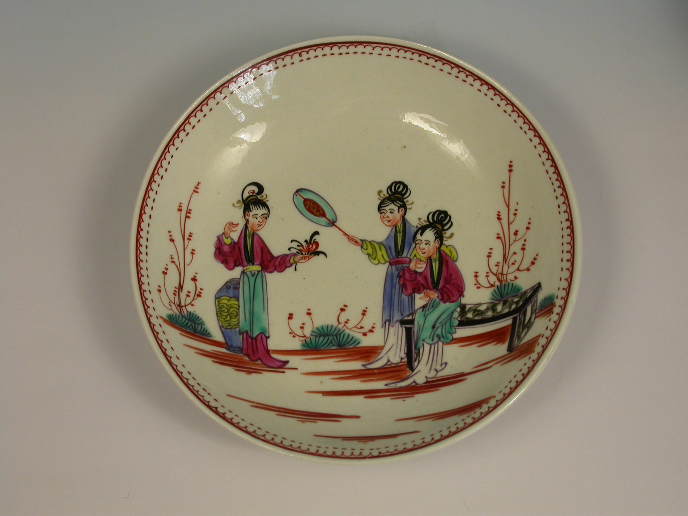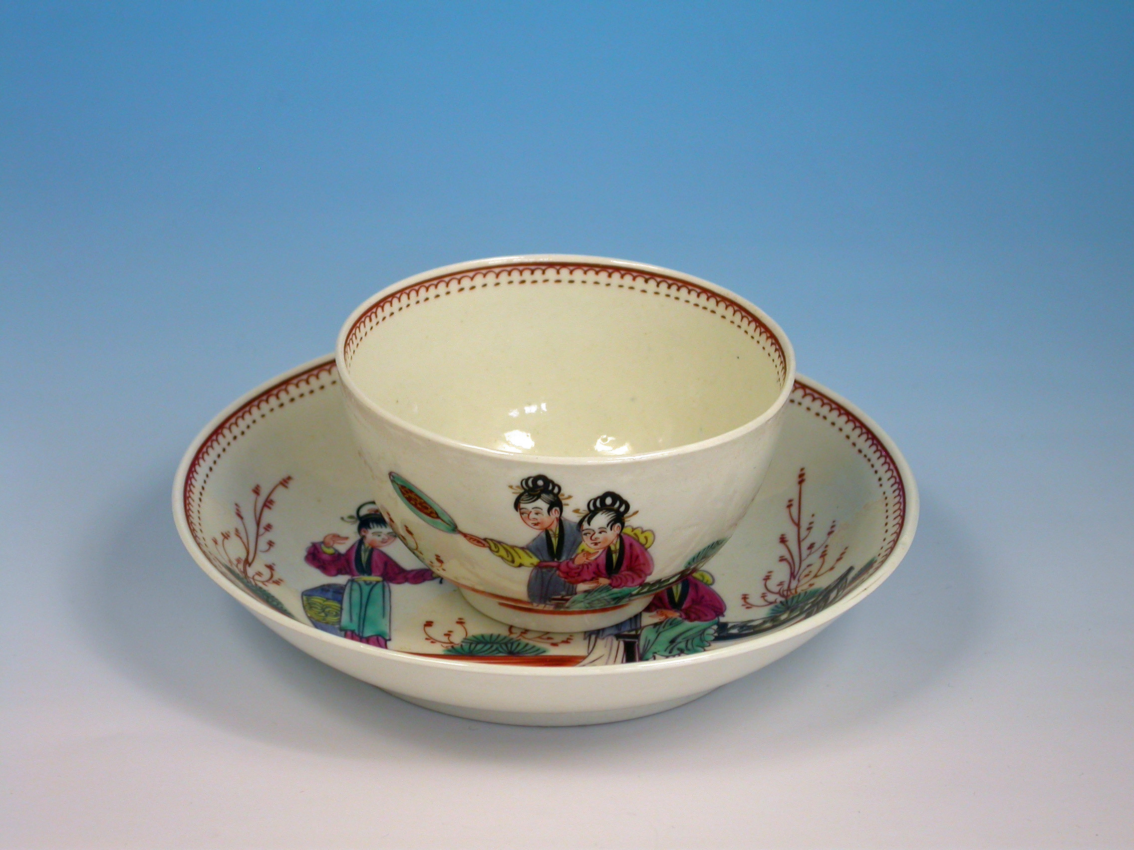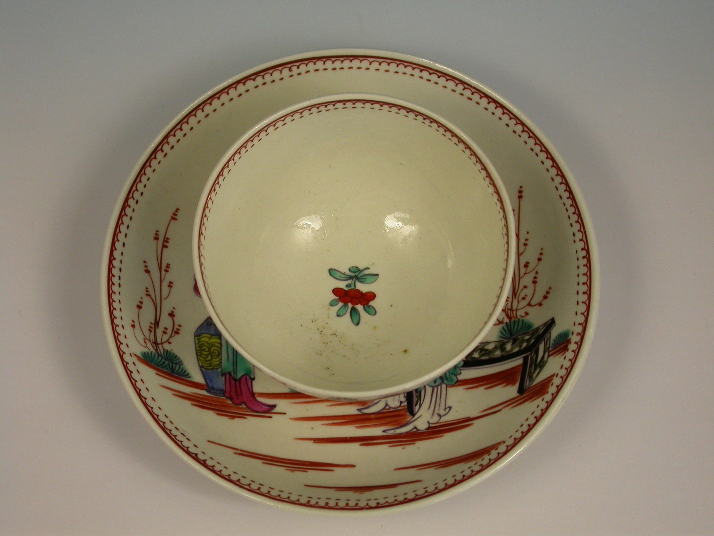 A good First Period Worcester Tea Bowl and Saucer painted with Chinese figures, c1770