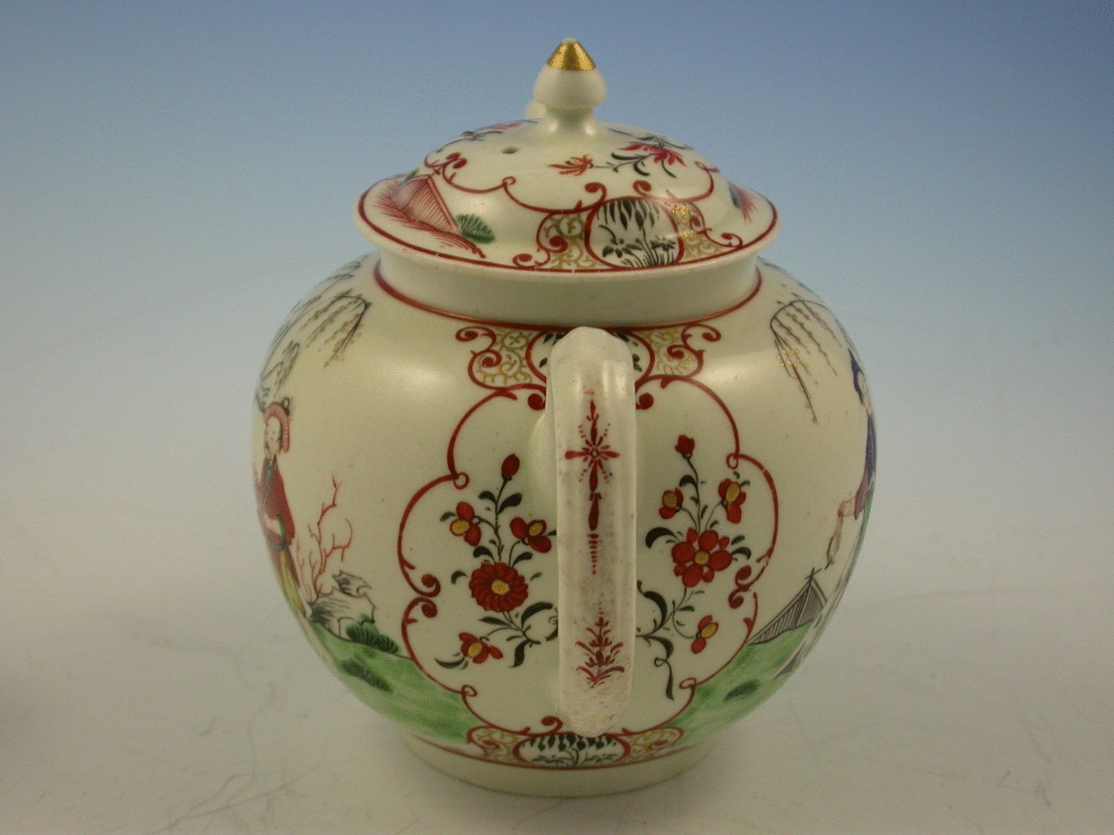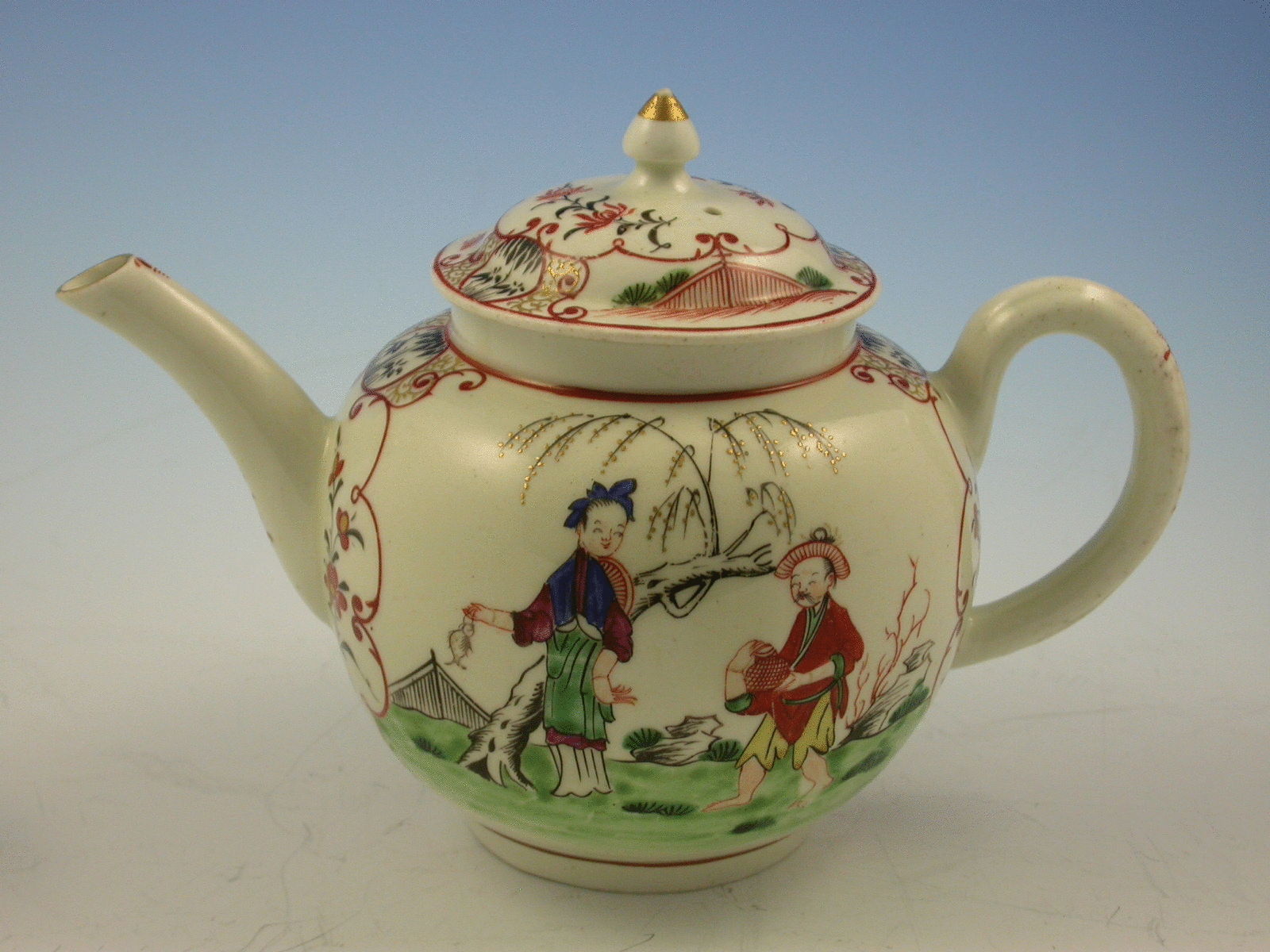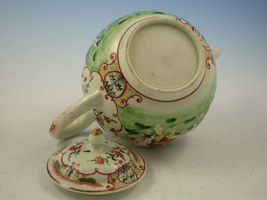 A First Period Worcester Teapot and Cover decorated with Chinese figures and stylistic flowers on panels.