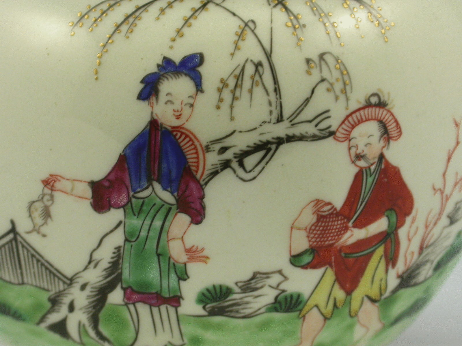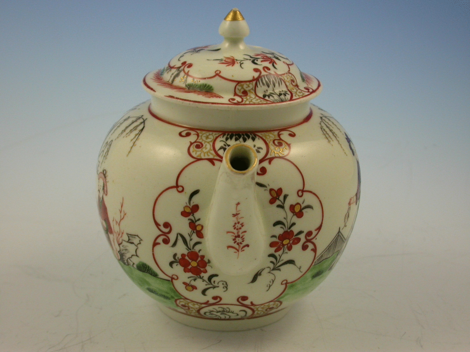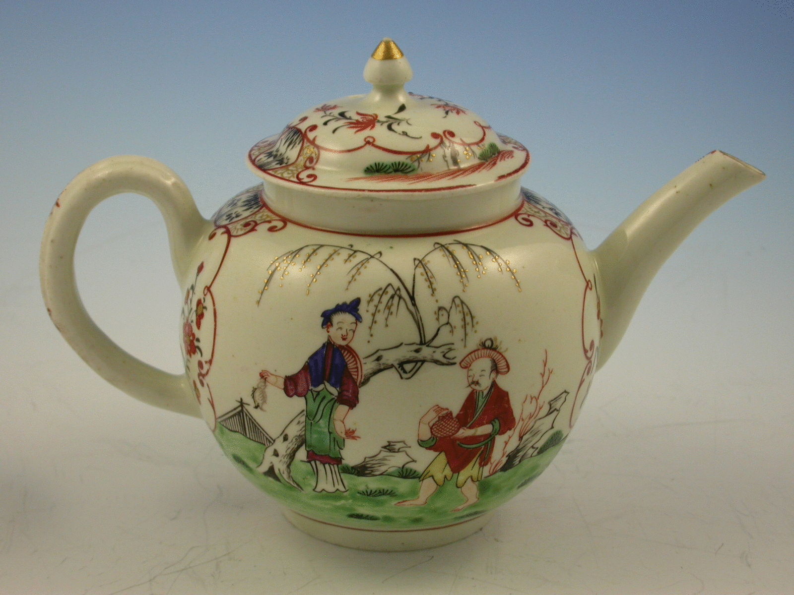 A First Period Worcester Teapot and Cover decorated with Chinese figures and stylistic flowers on panels.