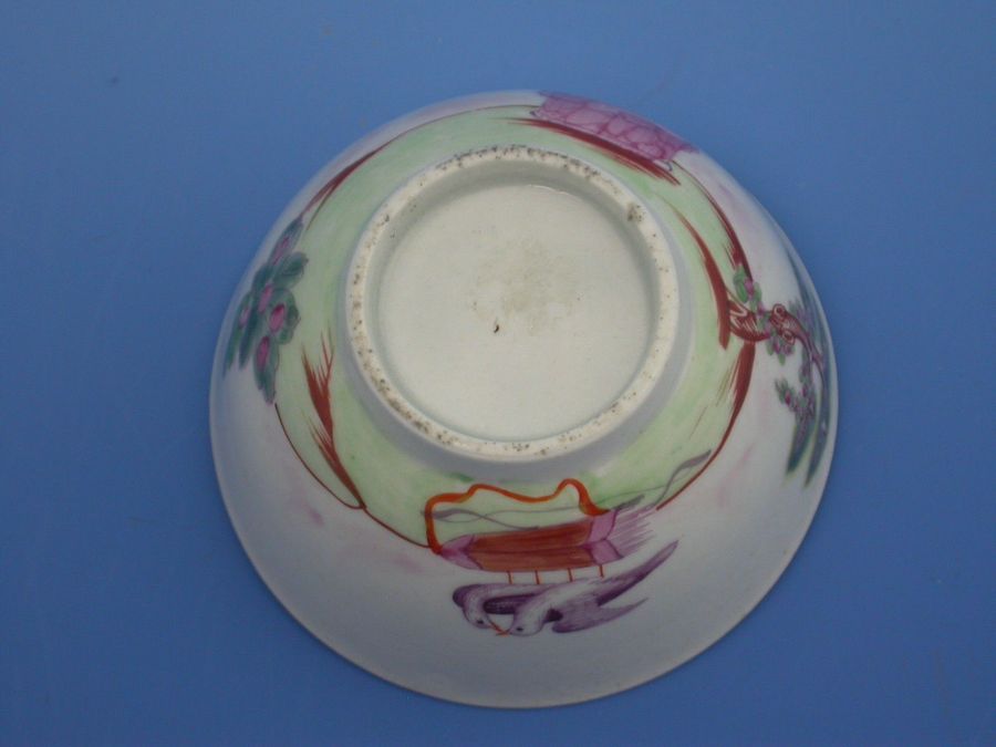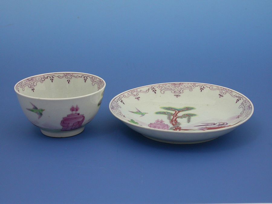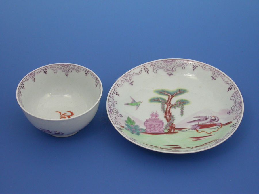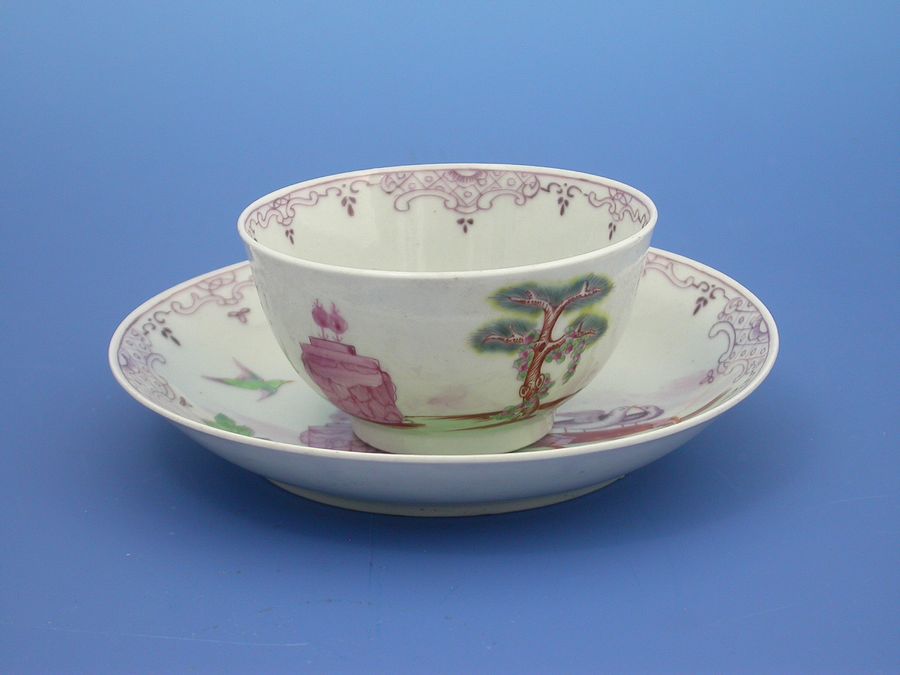 A fine First Period Worcester Teabowl and Saucer, painted in polychrome enamels with the ""Valentine pattern"", depicting two billing doves standing on a quiver of arrows with a leafy tree and a cauldron to the side, all within a puce scroll and diaper border.