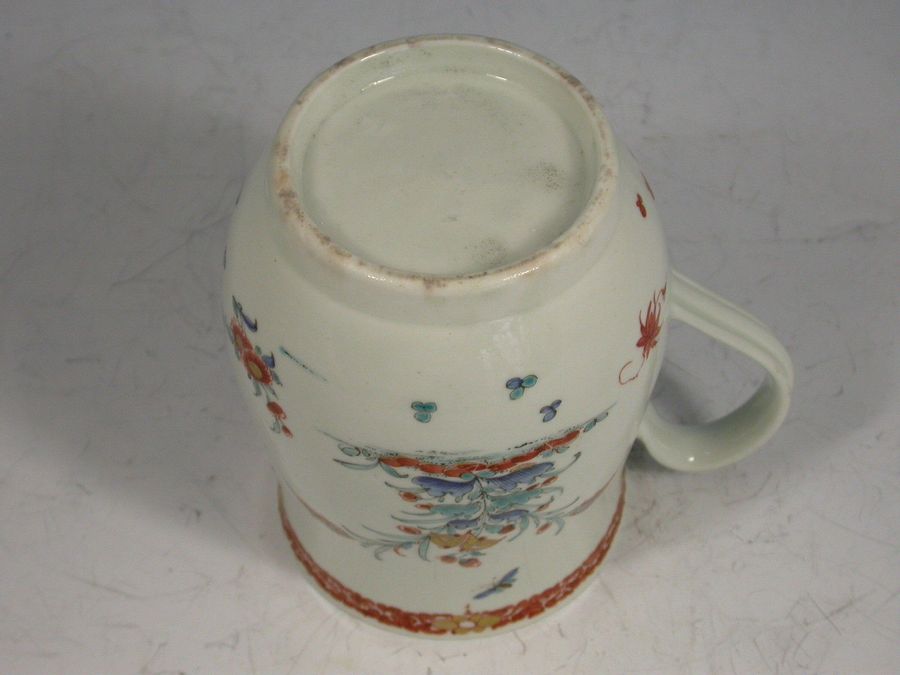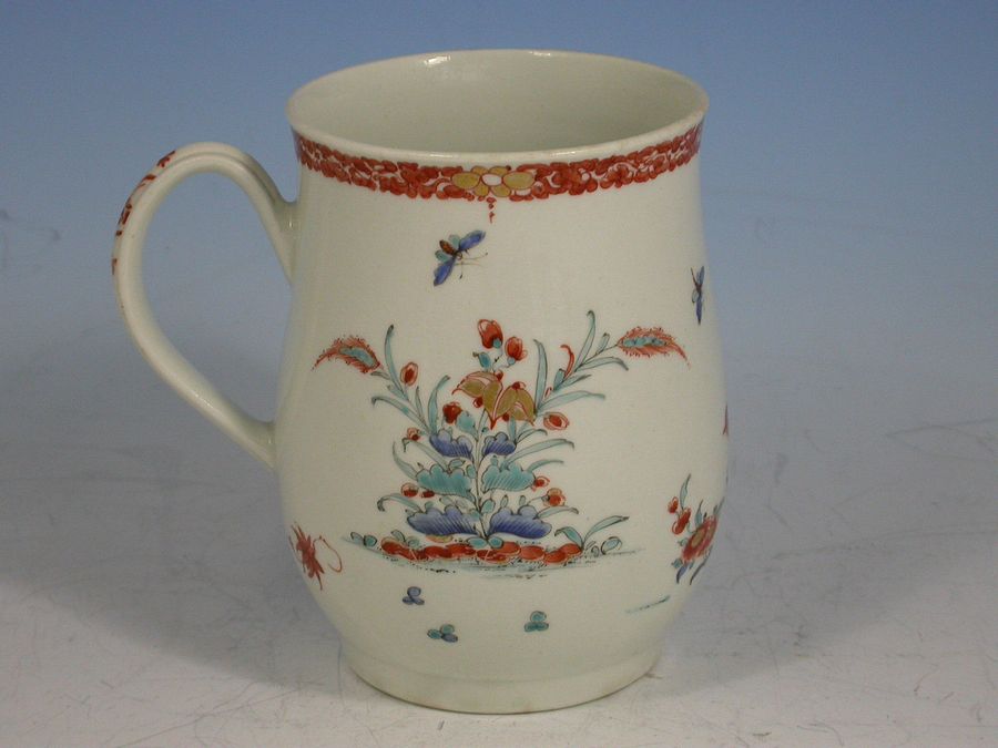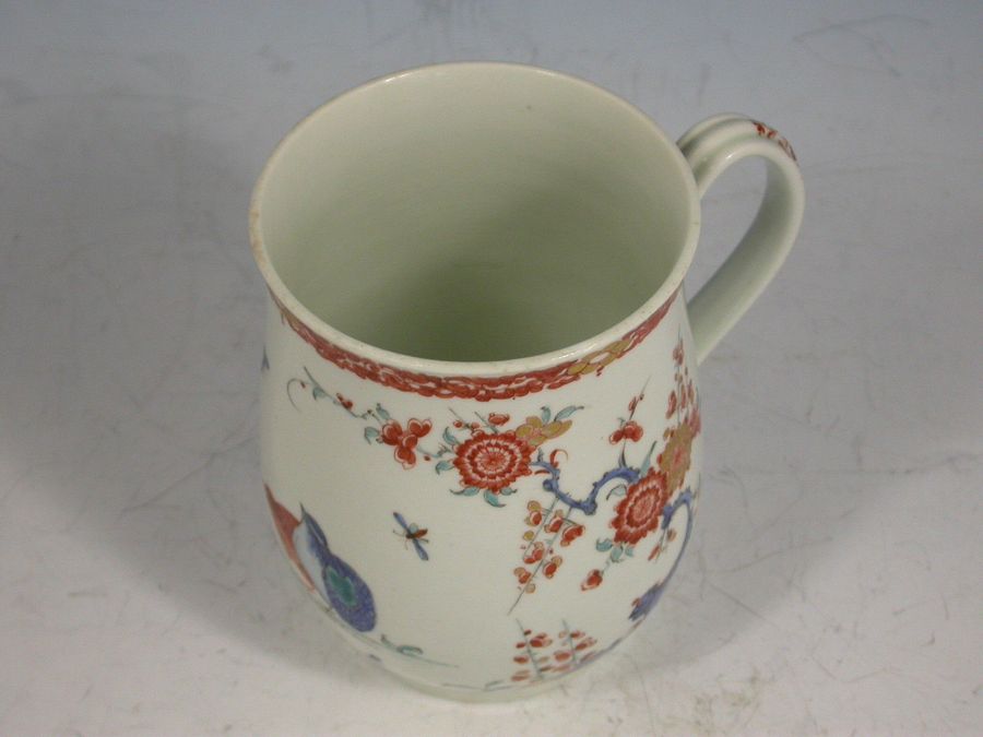 A very fine First Period Worcester baluster shaped Mug with grooved strap handle, painted in Kakiemon style with the ""Two Quail"" pattern, the two birds flanked by a flowering prunus tree, foliate sprays and insects, all within an iron red and gold floret border.