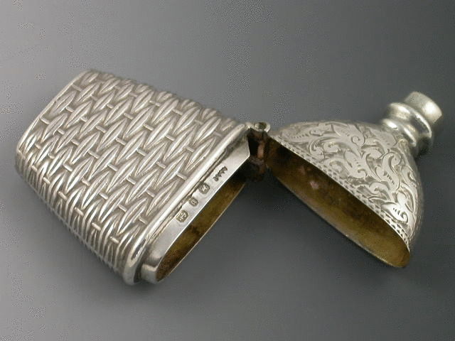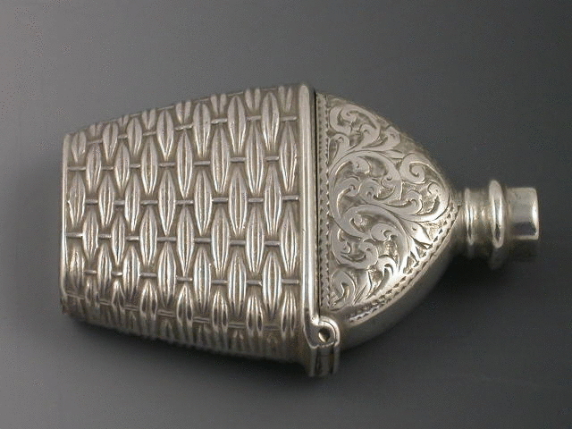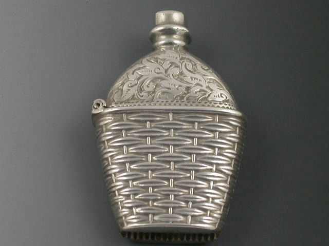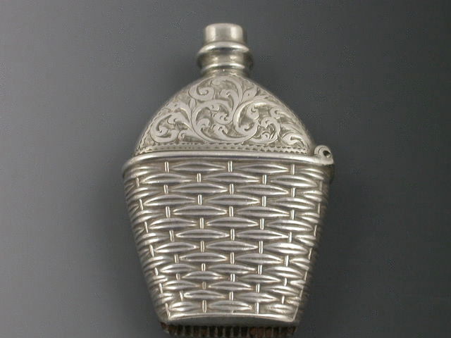A rare Victorian silver Vesta Case modelled as a flask in a wicker basket, with bright cut engraved decoration.