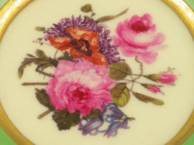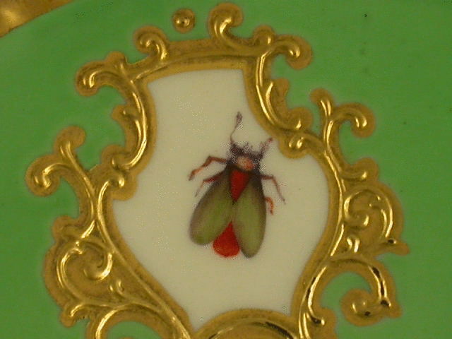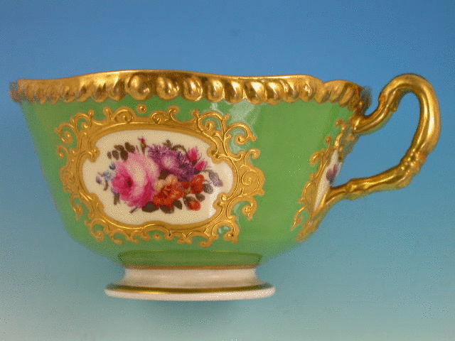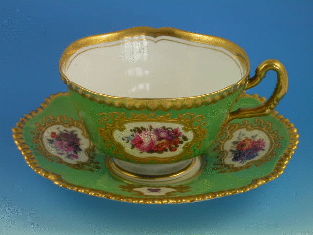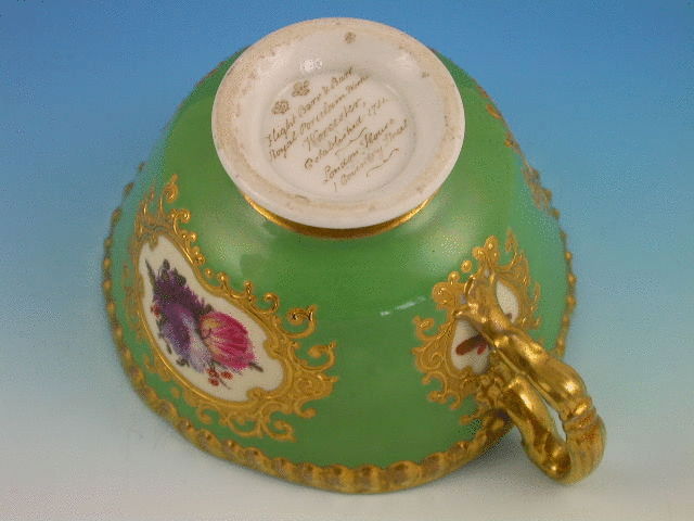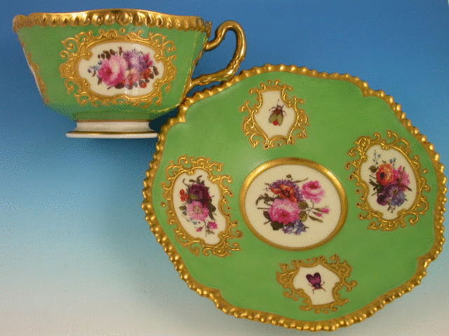 A very fine Flight, Barr & Barr Worcester Teacup and Saucer with gilded ear shaped handle, the crenolated Cup painted on an apple green ground enclosing four mirror shaped reserves with canary yellow backgrounds and bouquets of flowers and insects, gilt ciselle borders and gilt gadrooned rims.