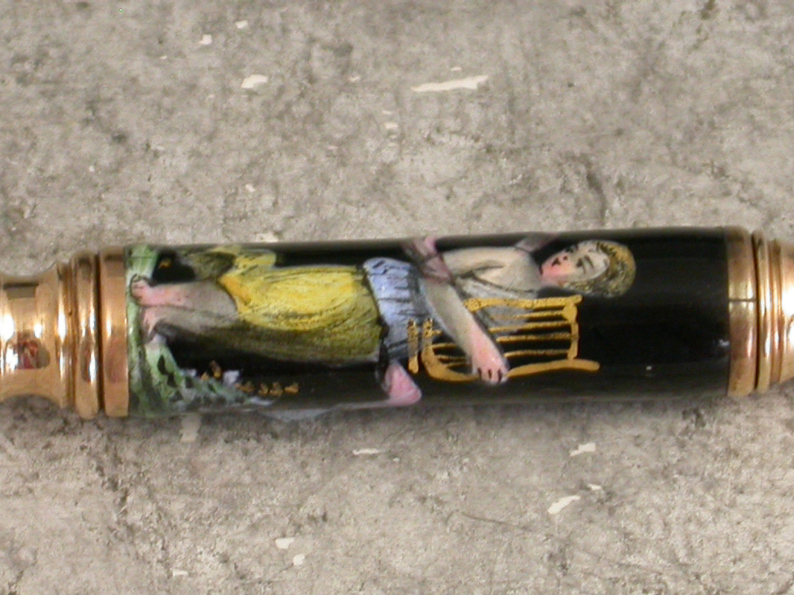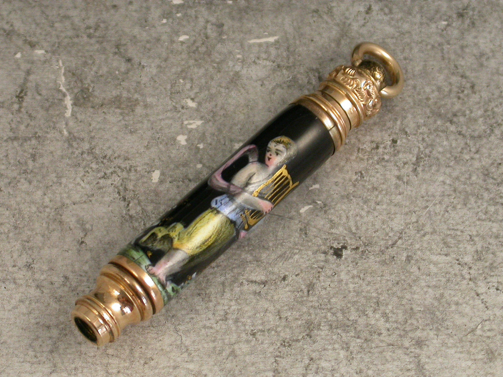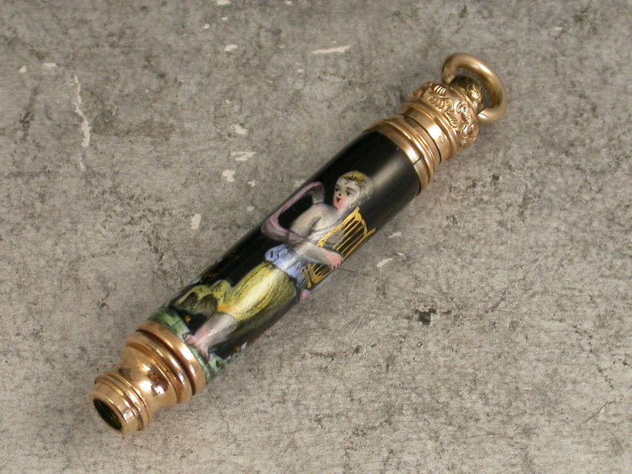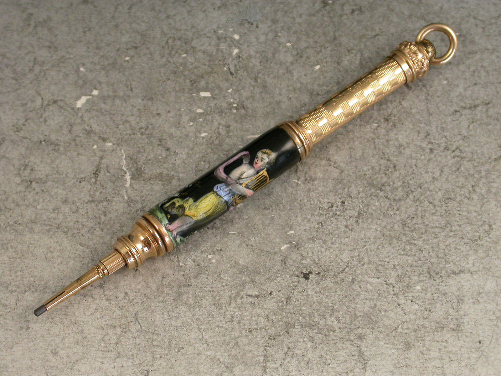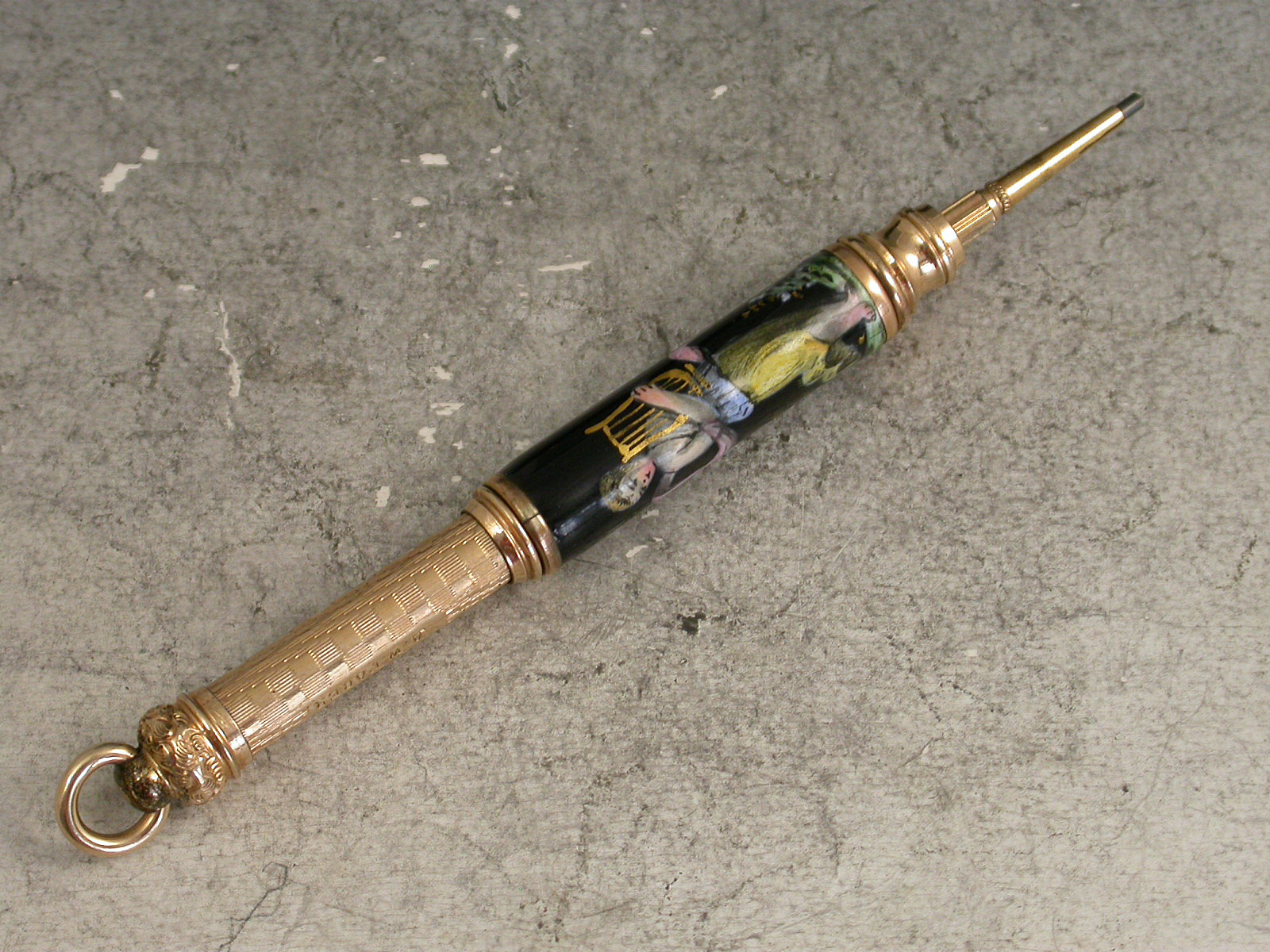 A fine late 19th century gold cased telescopic Propelling Pencil, the barrel with opaque enamel scene depicting a putto playing a lyre on a black background, the barrel of the pencil with engine turned geometric decoration.