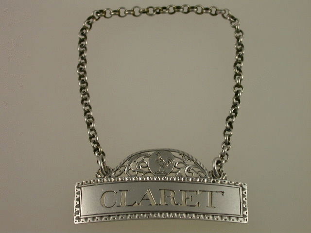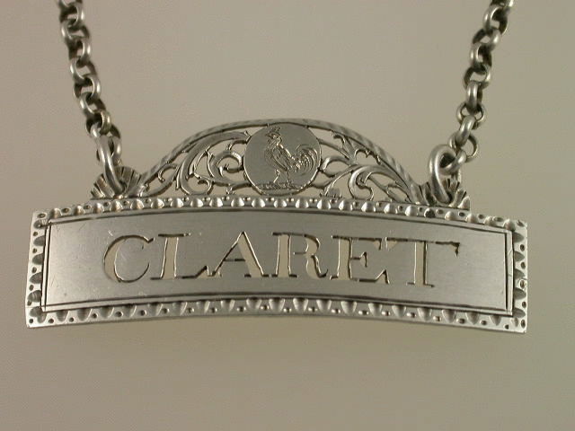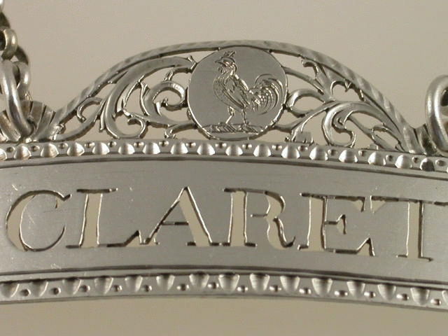 An extremely fine George III 18th century silver Wine Label “fret topped” domed rectangular form, with bright-cut engraved border, the pierced domed surmount with oval cartouche engraved with Cockerel crest, pierced for CLARET.