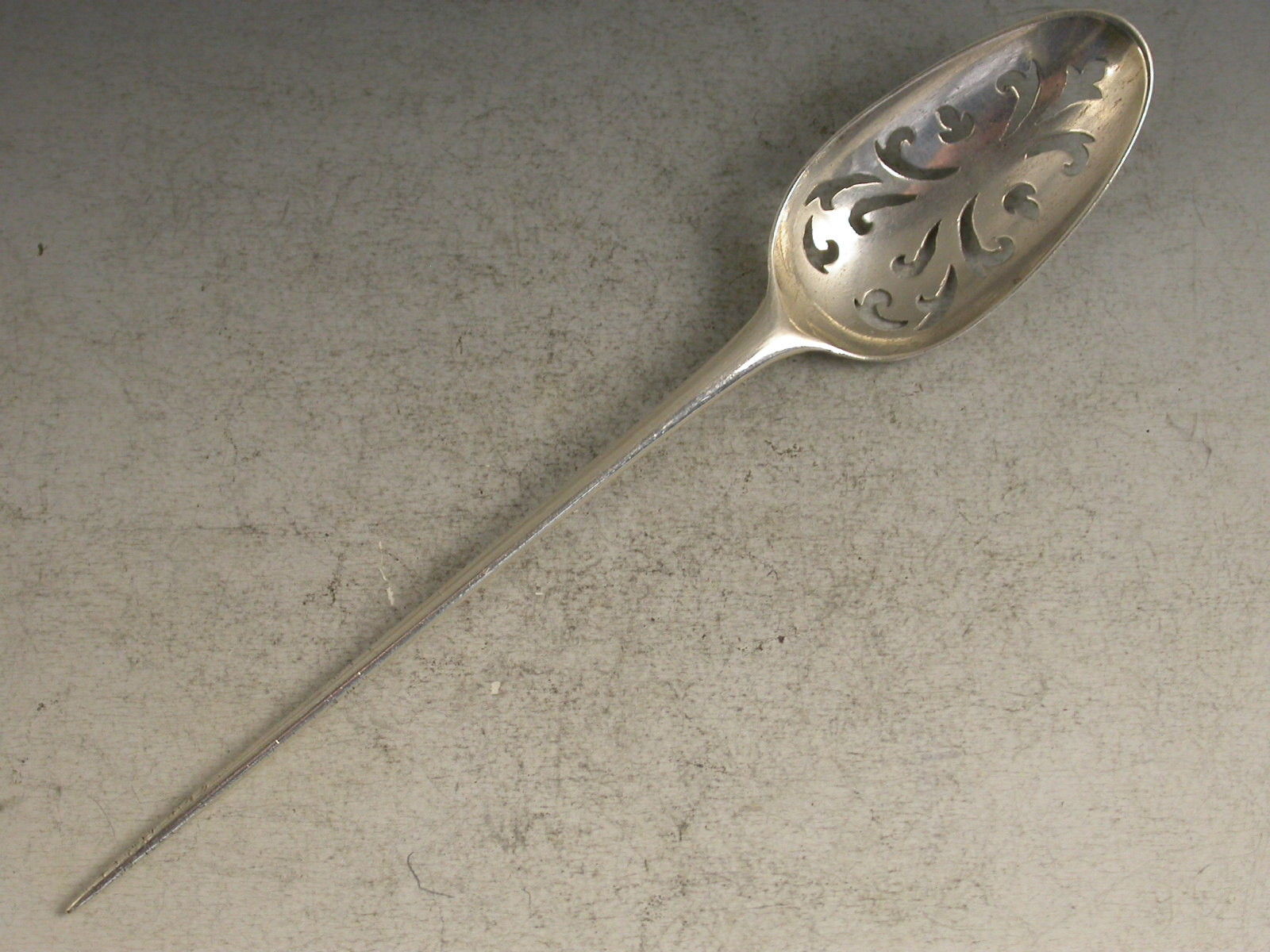 A rare George I early 18th century silver Mote Spoon, the plain tapering handle terminating in a point with no barb or finial, the oval bowl with plain rat-tail and pierced with scrolls, mushrooms and a fleur-de-lys in a relatively spaced out manner.