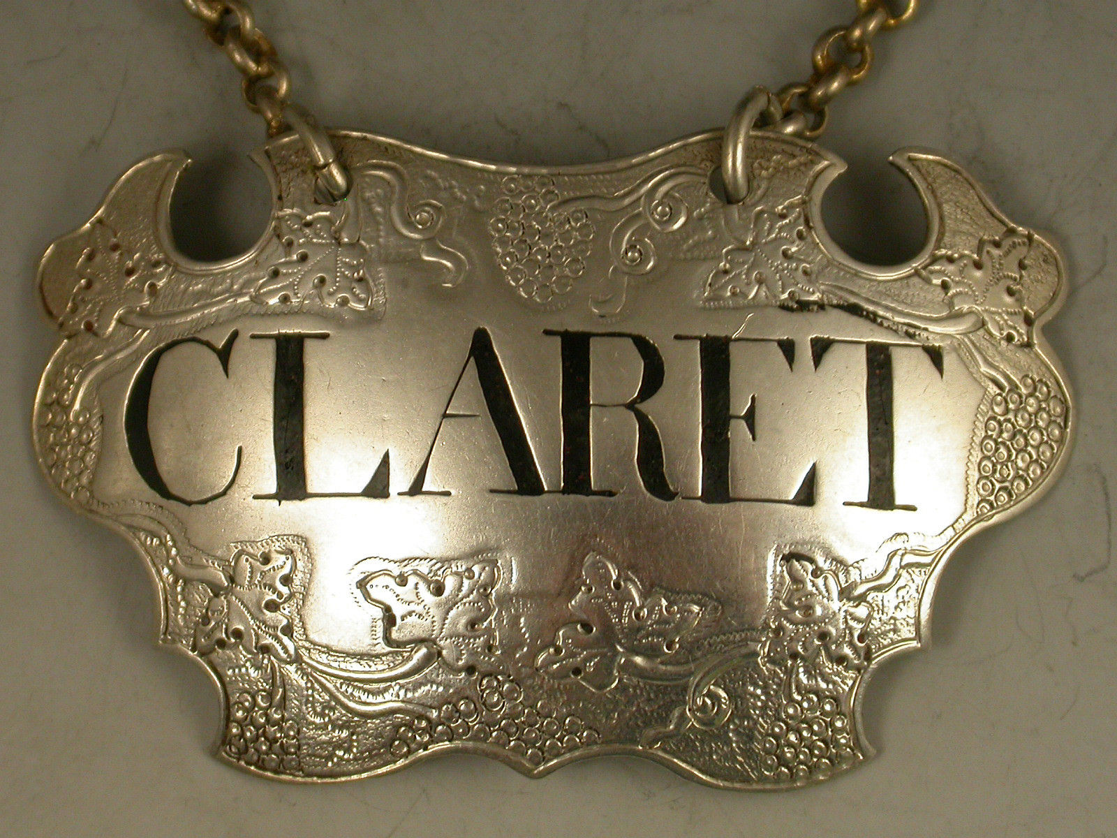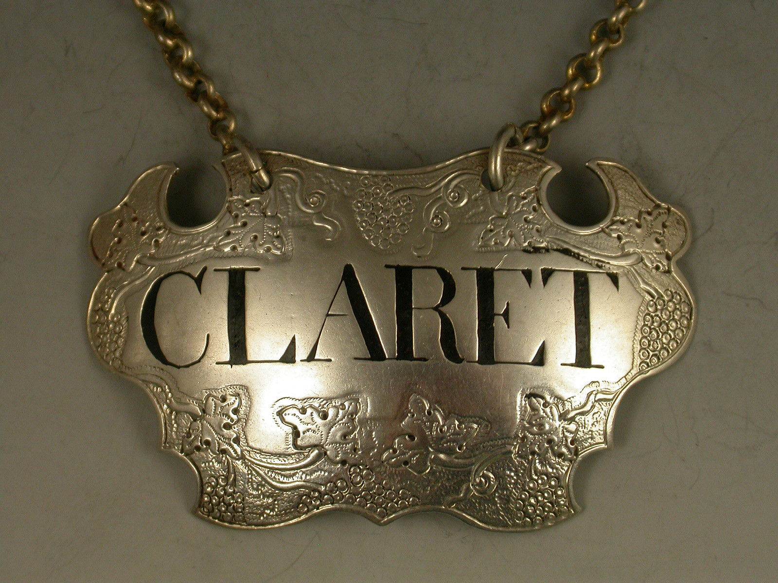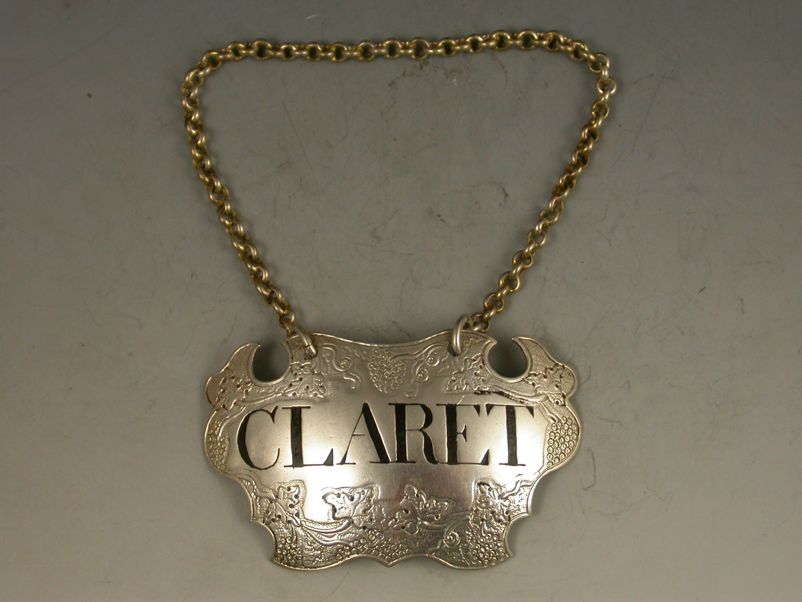 A good George II silver Wine Label of chased escutcheon form decorated with vine leaves and grapes on a textured background, above and below the incised and niello filled title for Claret.