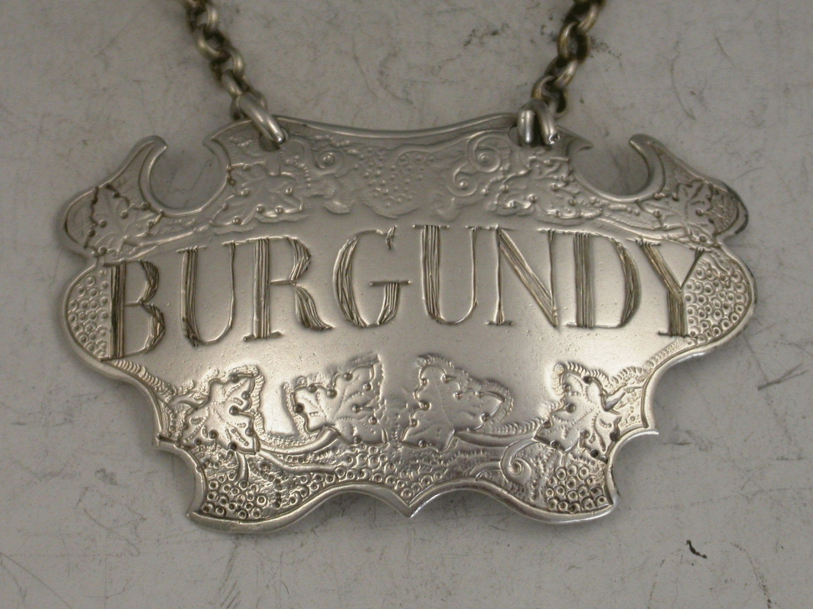 A rare George II silver Wine Label of engraved escutcheon form decorated with vine leaves and grapes, incised for Burgundy.