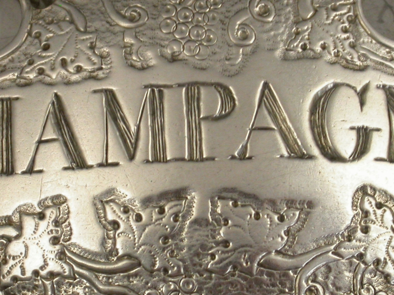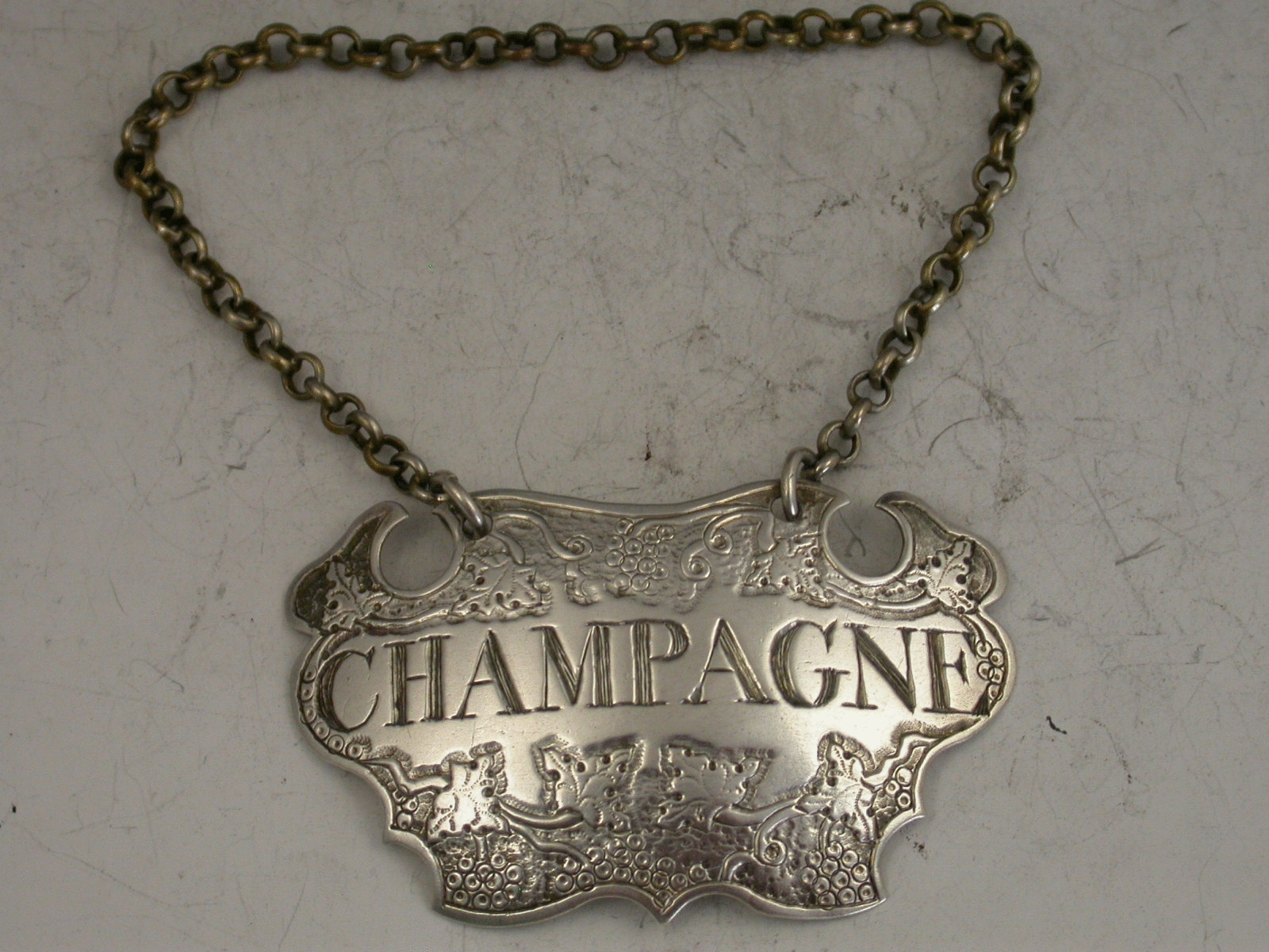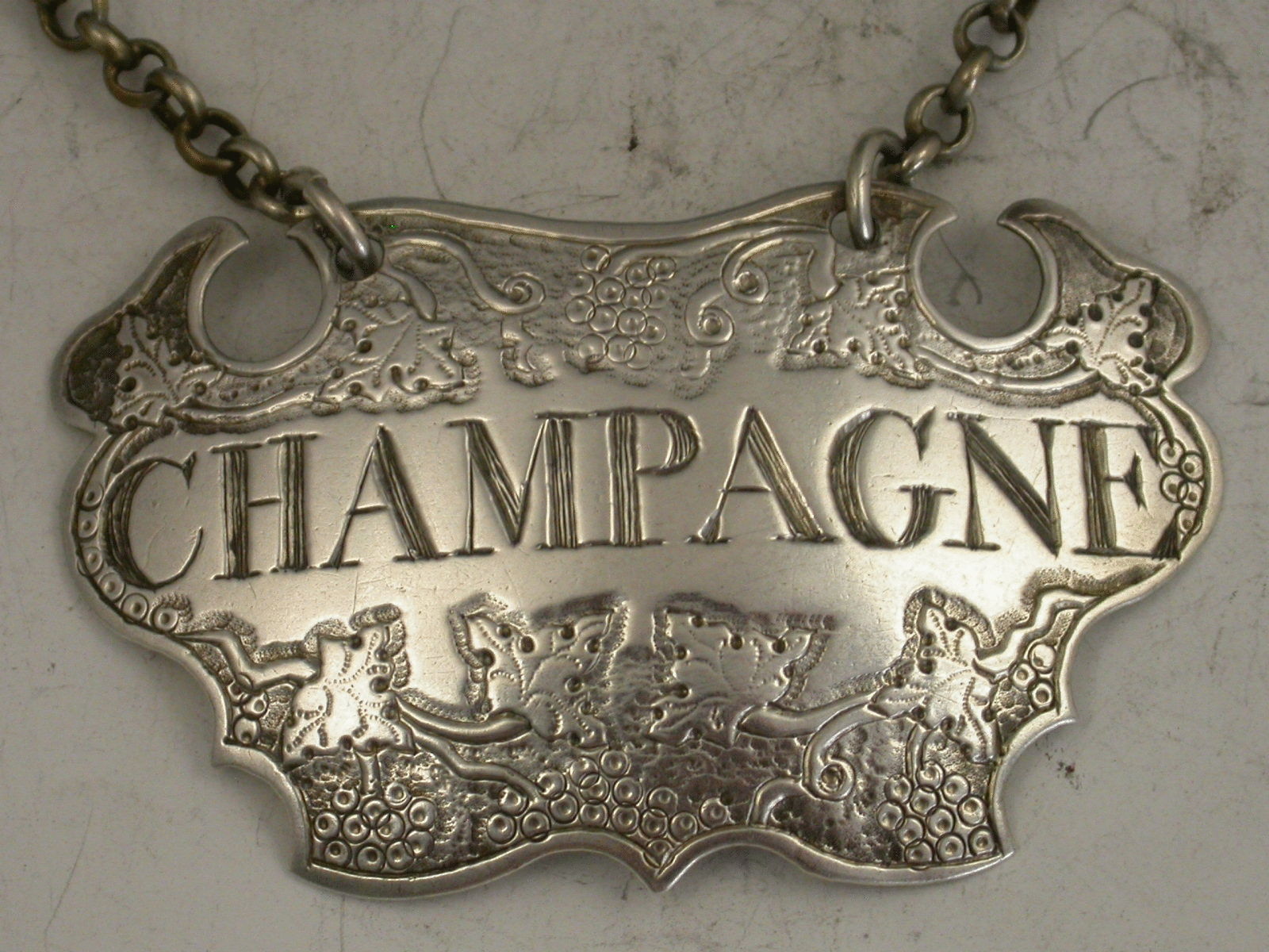 A good George II silver Wine Label of engraved escutcheon form, decorated with vine leaves and grapes on a matt-background, incised for Champagne.