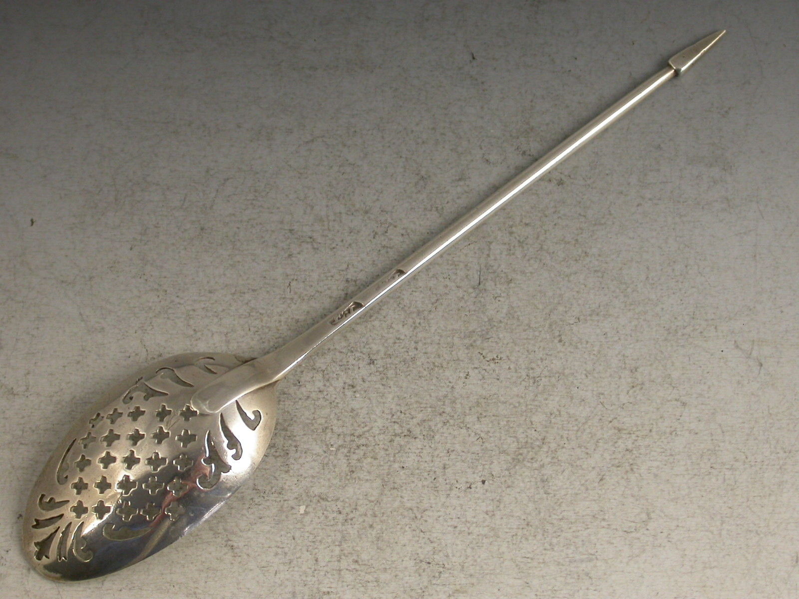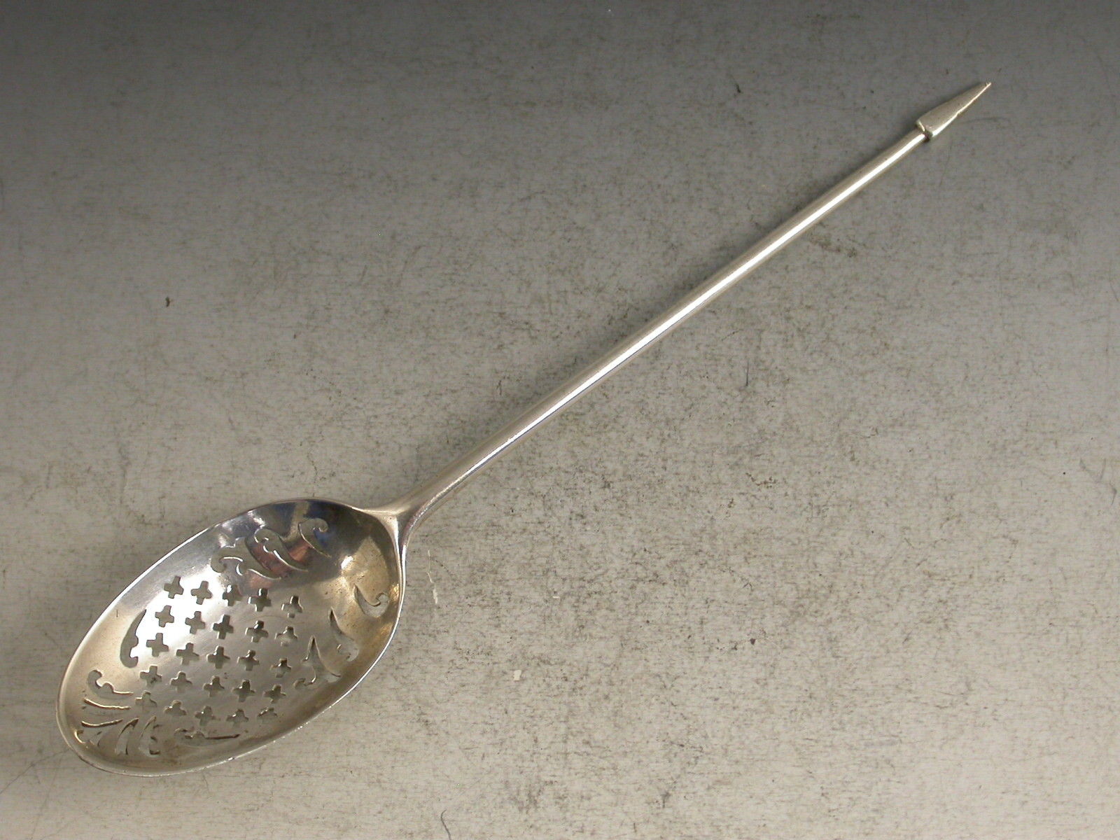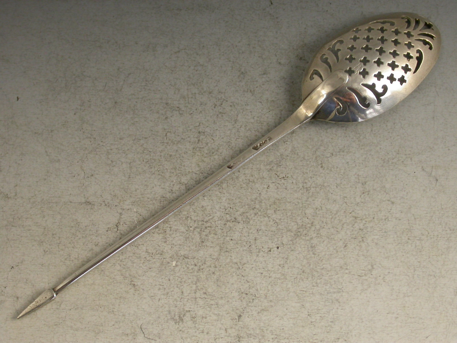 An unusual late George II mid 18th century silver Mote Spoon, the plain tapering handle with diamond-point finial and a long drop to the bowl, pierced with scrolls, serifs, a fleur-de-lys and crosslets forming a diamond pattern.
