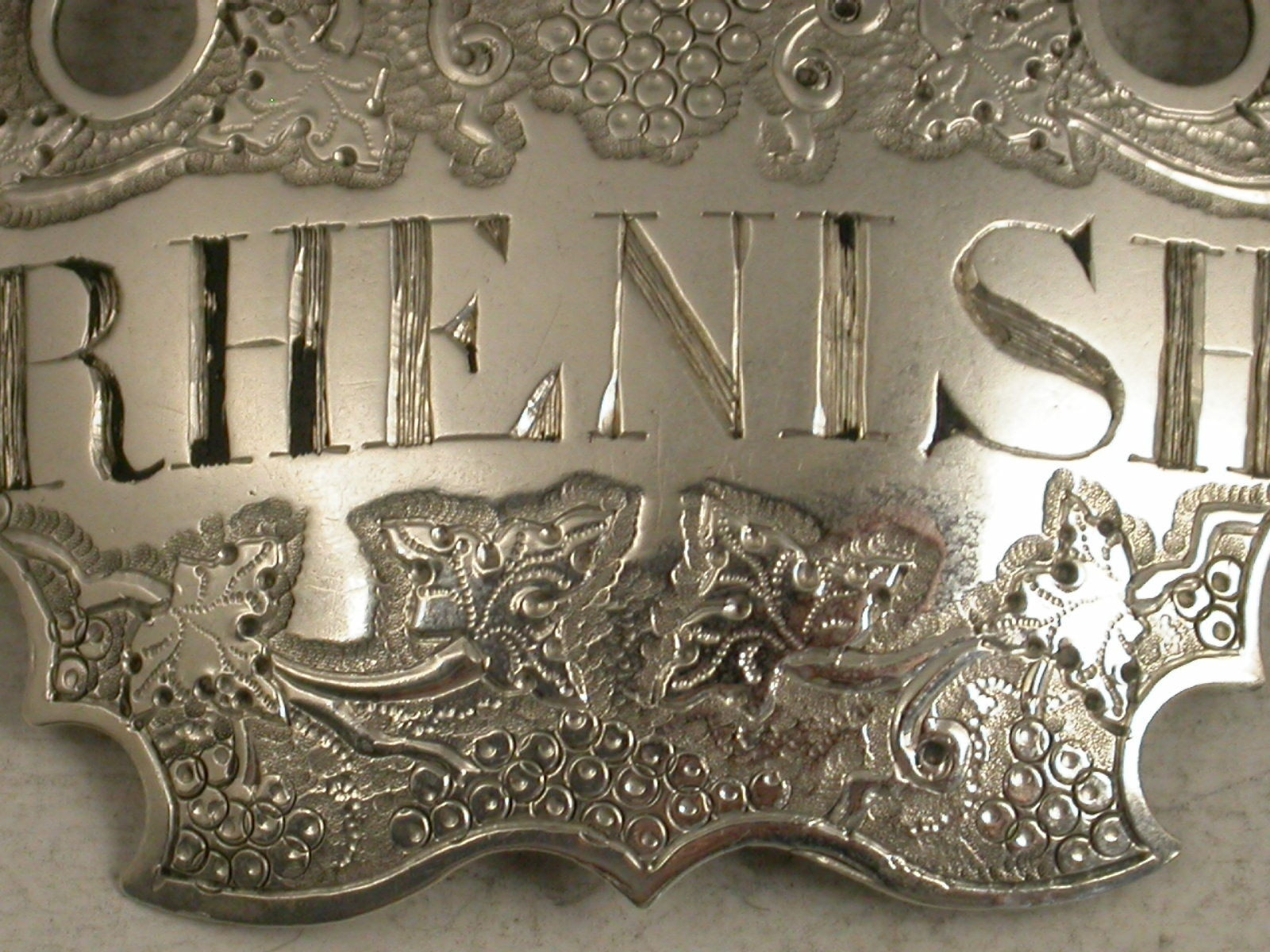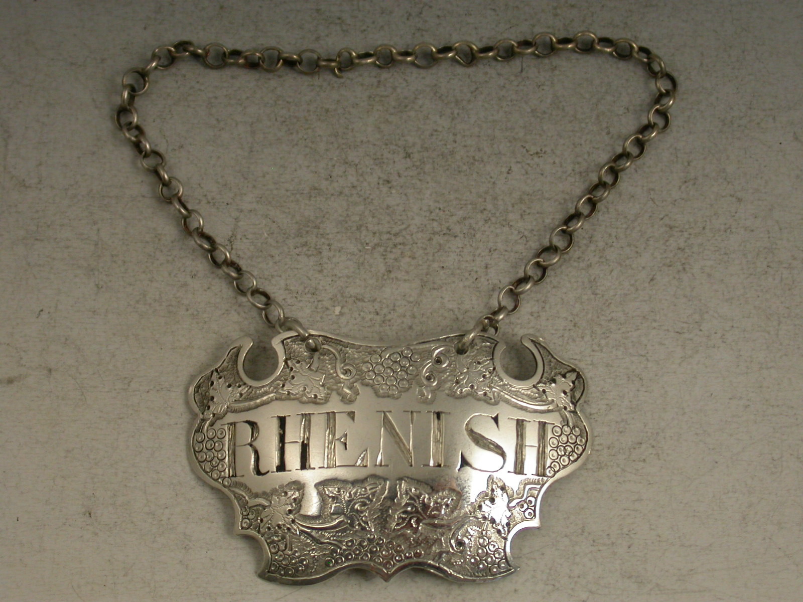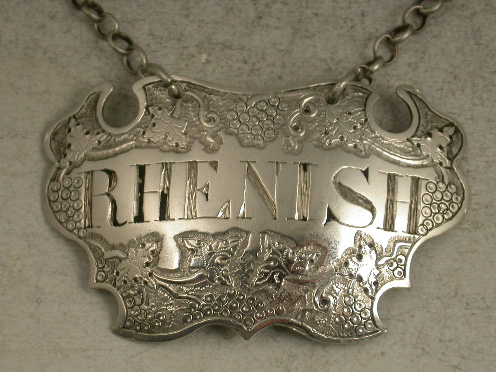 A rare George II silver Wine Label of chased escutcheon form, incised for Rhenish (a scarce title), between vine leaves and grapes