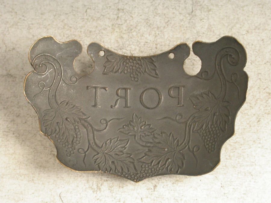 A rare mid 18th century die-stamped Old Sheffield Plate Wine Label of copper-back escutcheon form decorated with vine leaves and grapes, stamped for Port.
