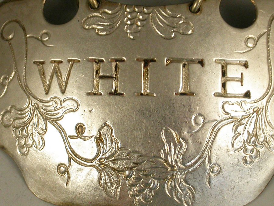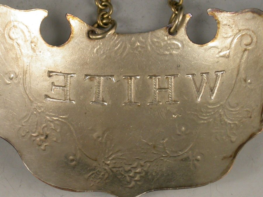 A rare mid 18th century die-stamped Old Sheffield plate Wine Label of 'copper back' escutcheon form decorated with vine leaves, grapes and tendrils, incised for White.