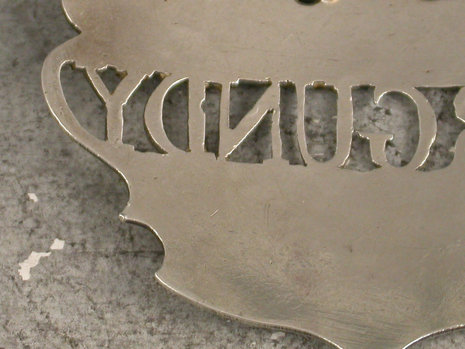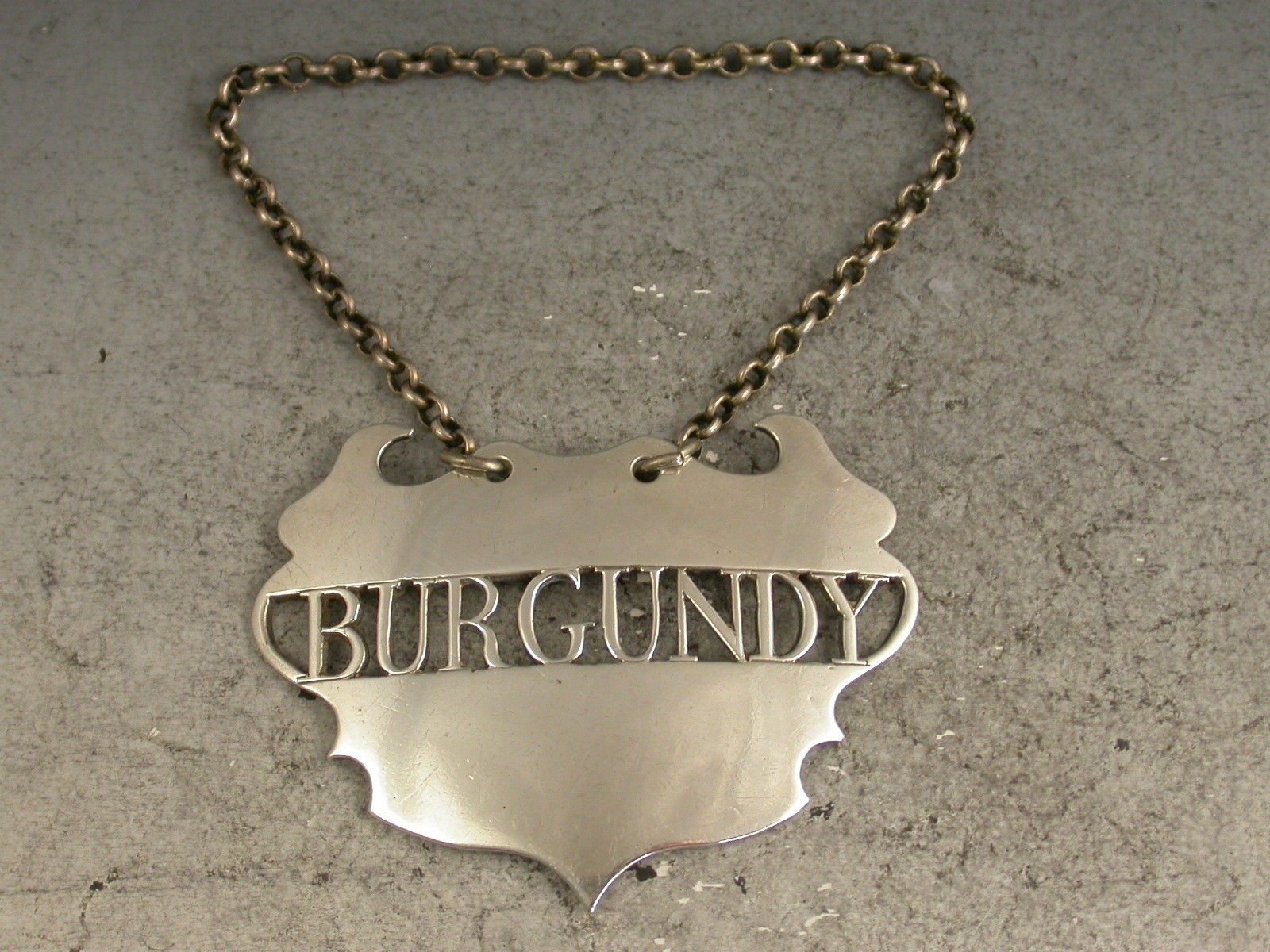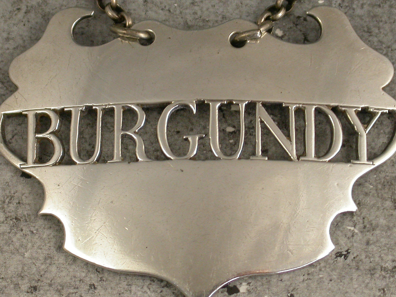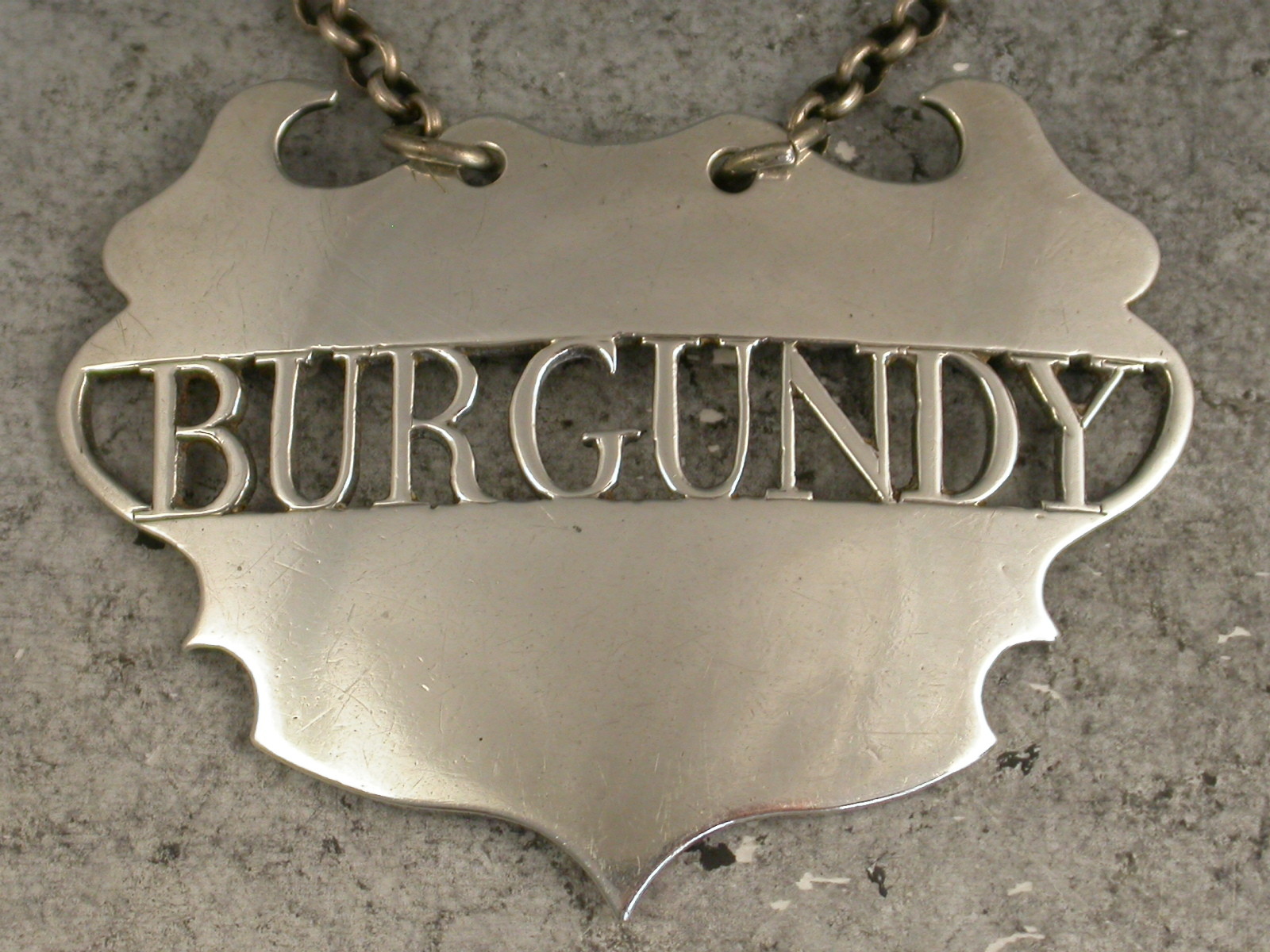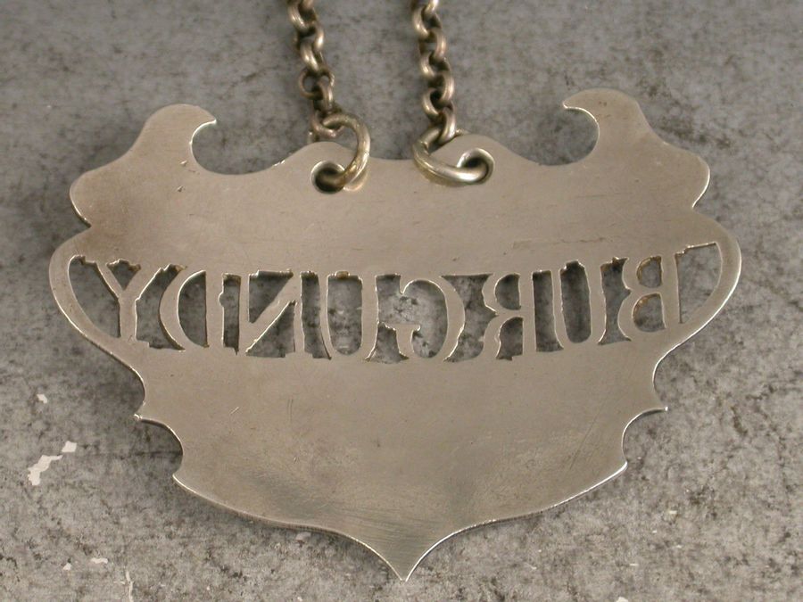 A fine and rare 18th century silver Wine Label of a distinctive and rare design, the plain escutcheon with pierced out name panel for Burgundy, the background to the name having been removed rather than the lettering. This design has only been recorded by Sandilands Drinkwater.