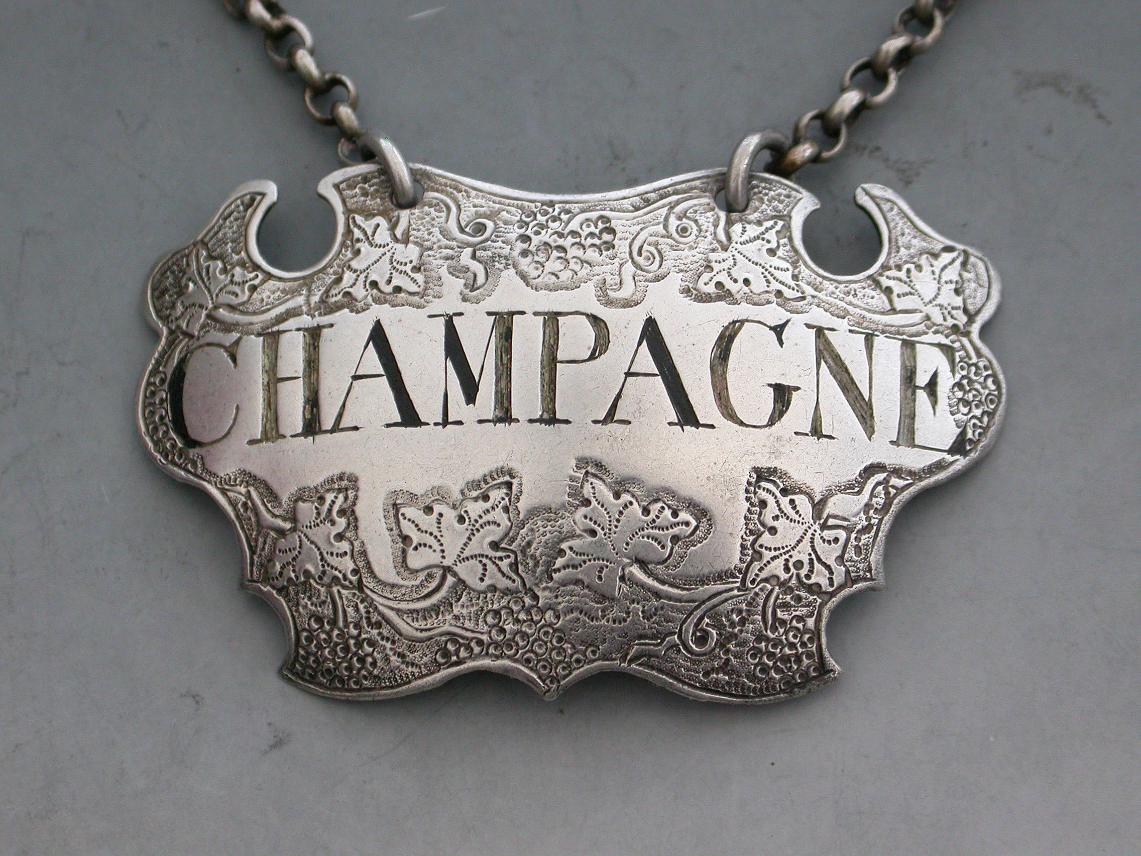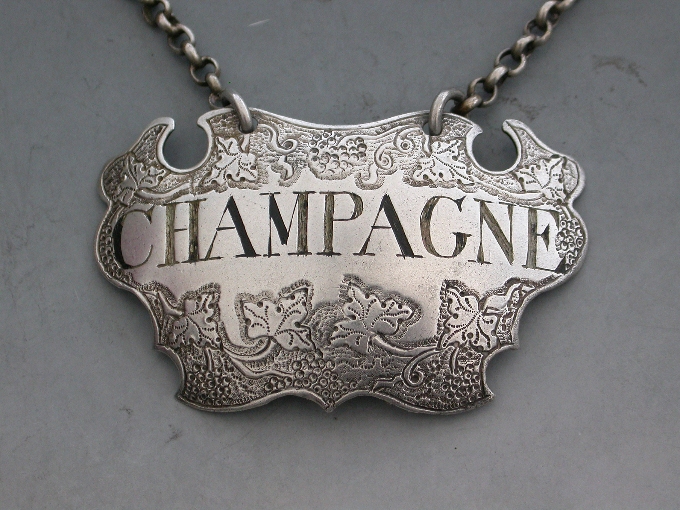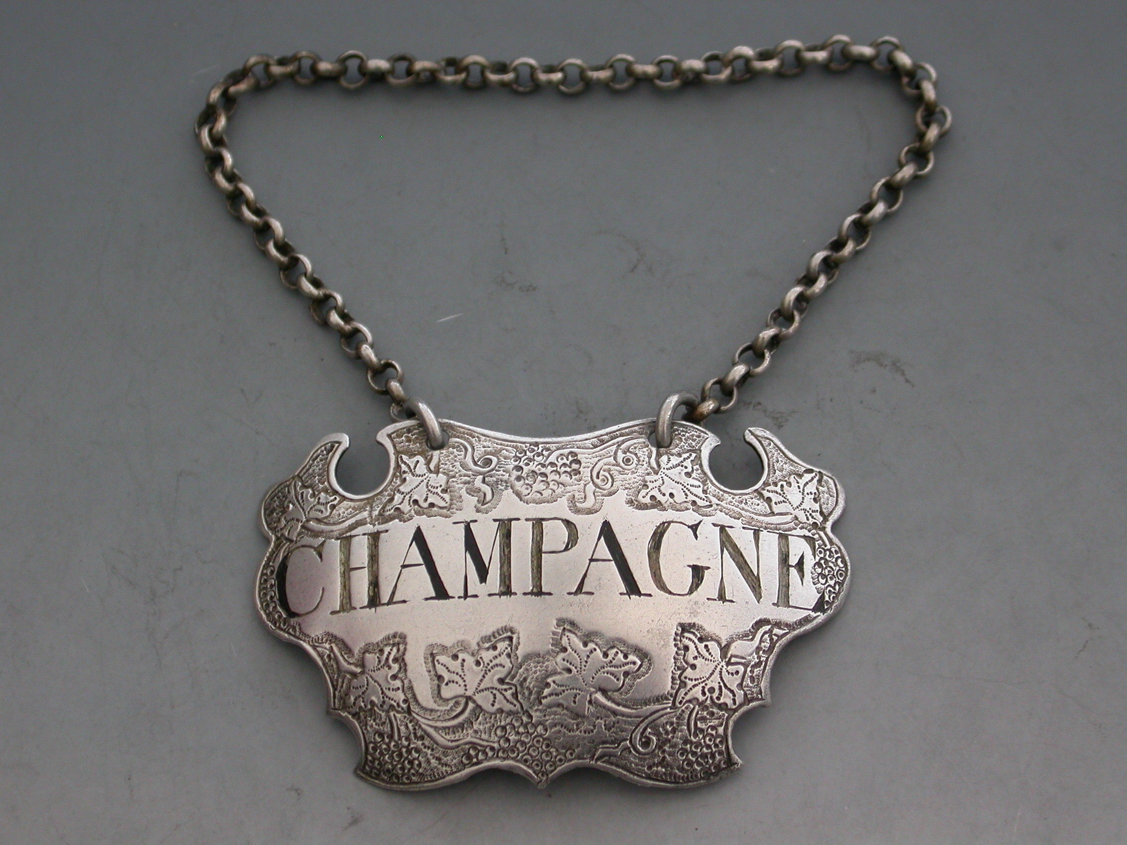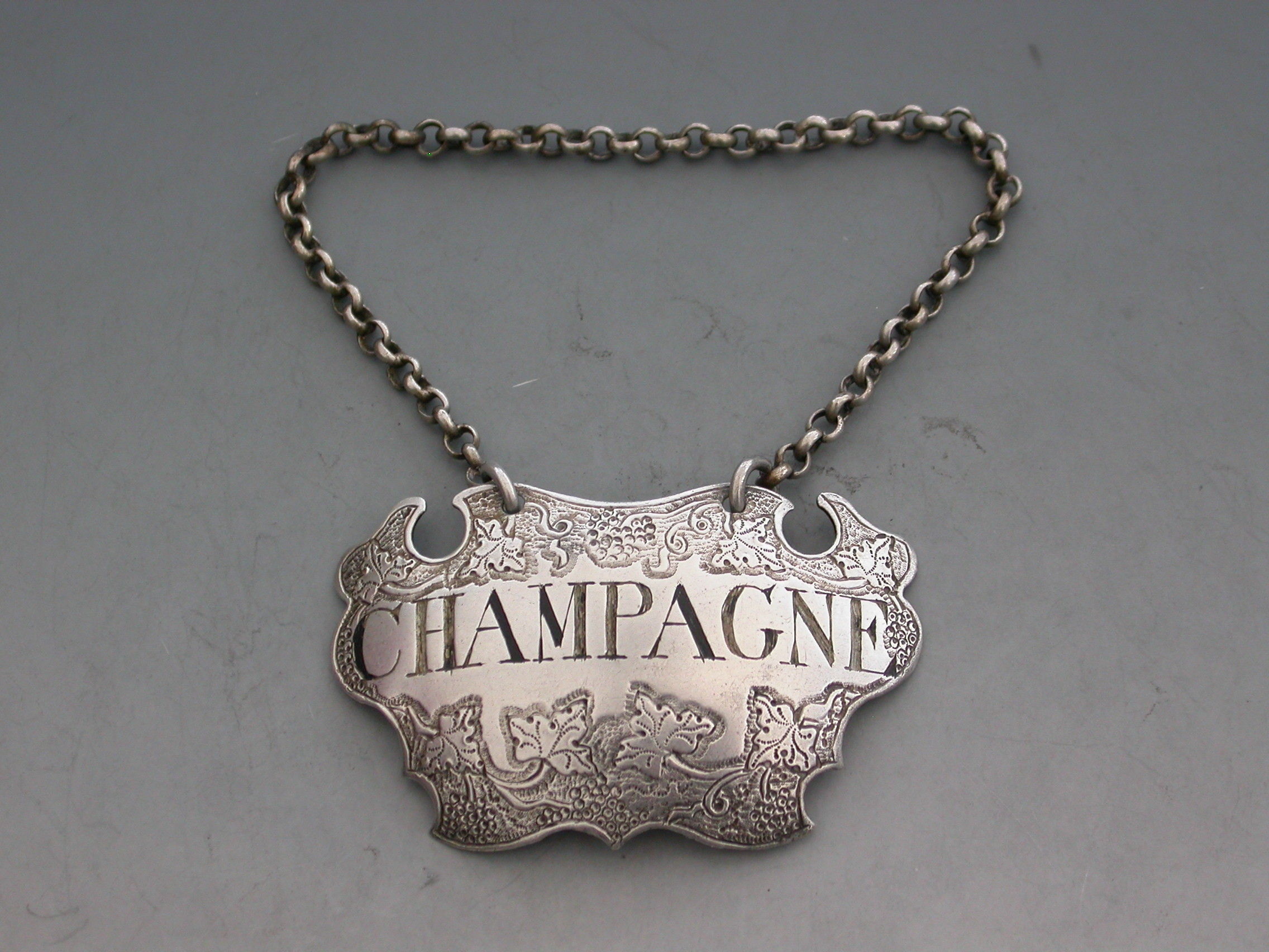 A good George II silver Wine Label of chased escutcheon form decorated with vine leaves and grapes on a textured background above and below the incised title for Champagne.